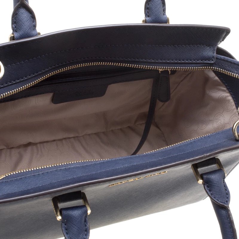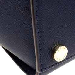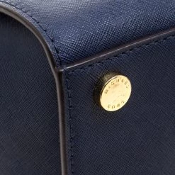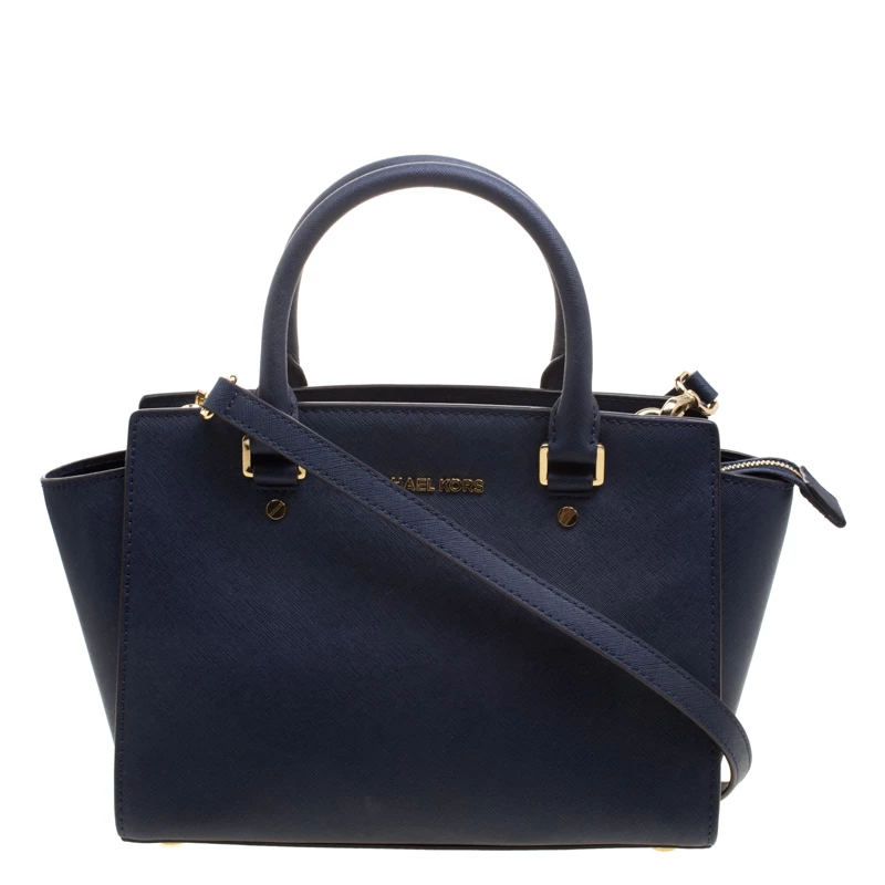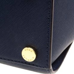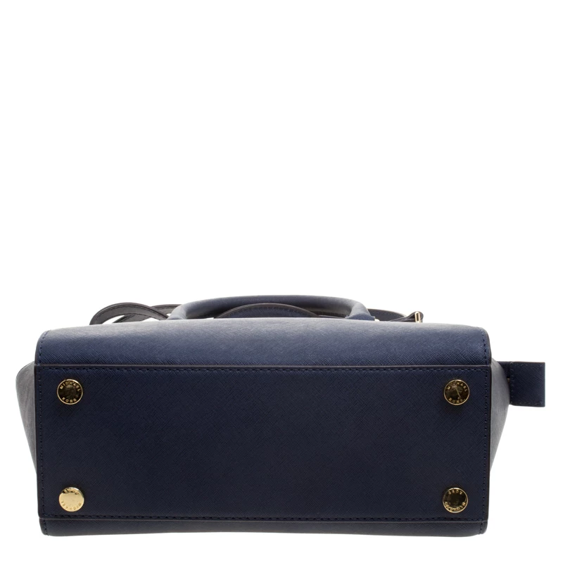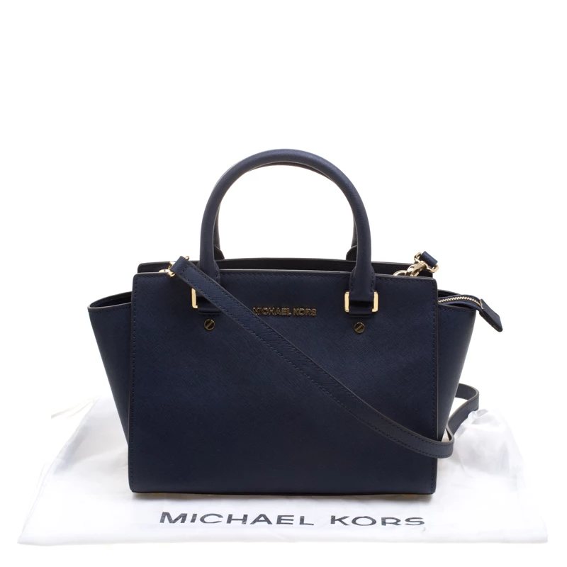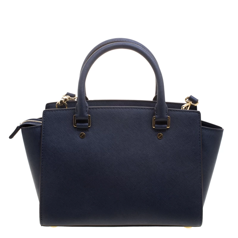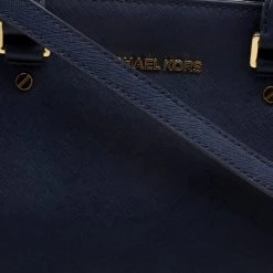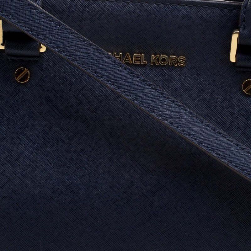 Elevate your style with this gorgeous Selma tote by Michael Kors. Crafted from navy blue Saffiano leather the bag features dual top handles, detachable shoulder strap and protective metal feet at the bottom. It has a spacious fabric lined interior that houses a zip pocket. This beauty is totally worth the splurge!