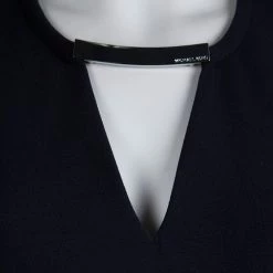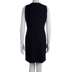 Made of a polyester, rayon, and spandex blend fabric, in a deep navy shade, this shift dress comes with a sleeveless design. The dress features a concealed rear zip closure and a v-cut neck with a gold toned accent with the brand name engraving.