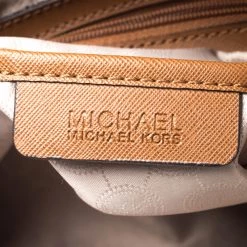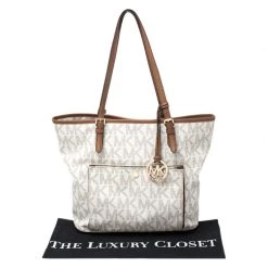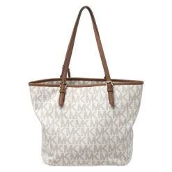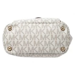 This tote from Michael Kors is a creation meant to assist you with style and ease. It comes crafted from off-white signature canvas and accompanied by an MK tag and a front pocket. Two handles are provided for you to carry it, and a spacious nylon-lined interior to house your belongings.
