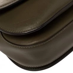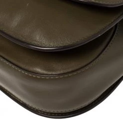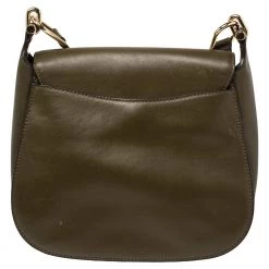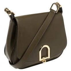 Let your audience be dazzled when you make your own style statement with this trendy leather handbag. Expertly designed from quality leather, this olive green bag is lined with fabric. It has a front flap with gold-tone hardware detailing that opens to the interior. It has a long shoulder strap for convenience.