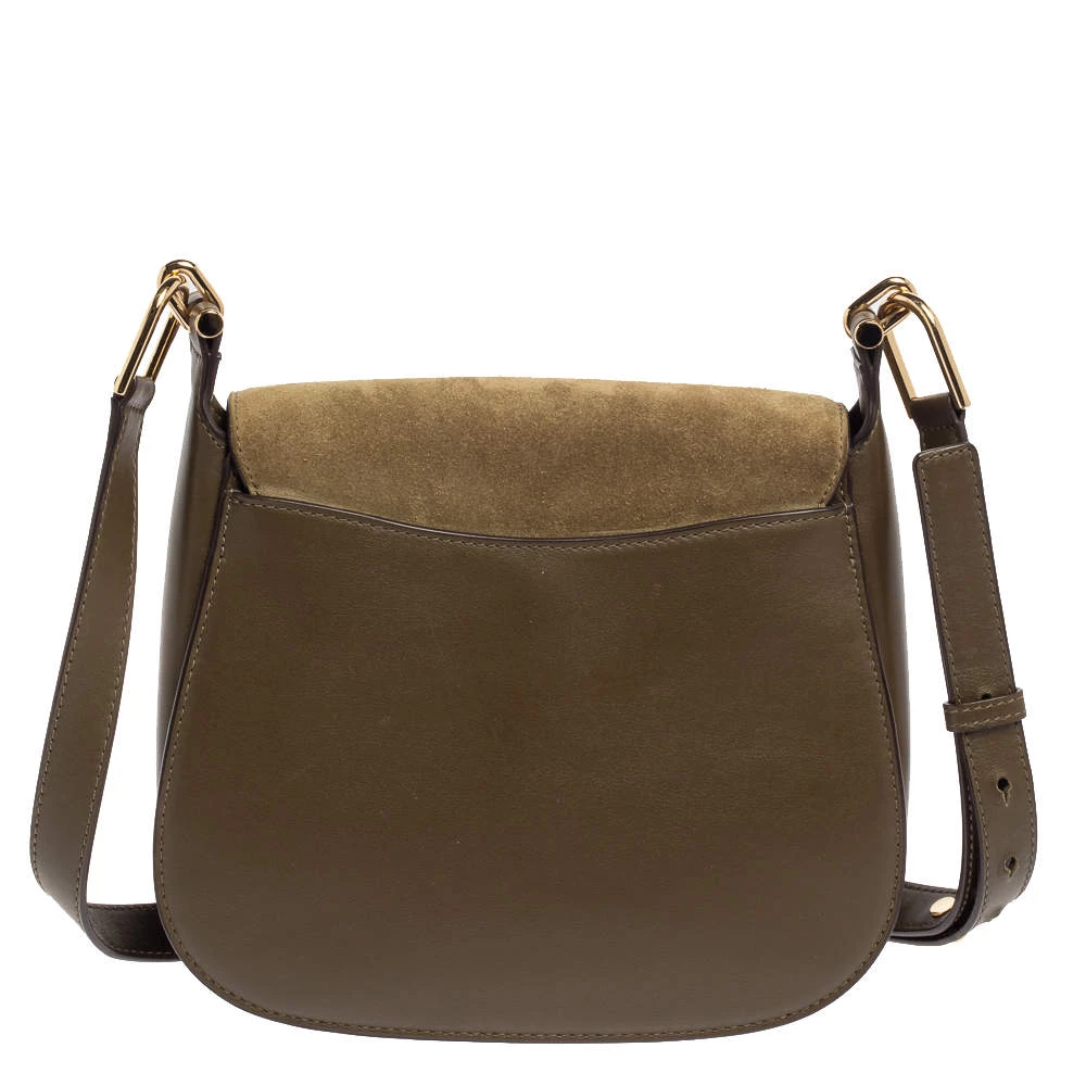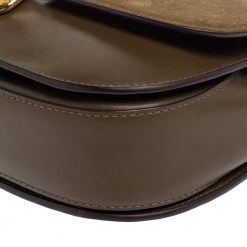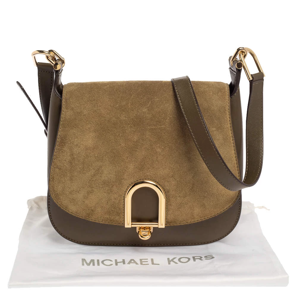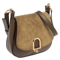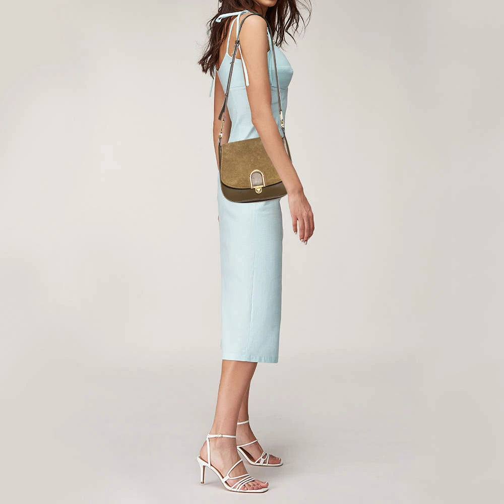 Let your audience be dazzled when you make your own style statement with this trendy leather & suede handbag. Expertly designed from quality leather, this olive green bag is lined with fabric. It has a front flap with gold-tone hardware detailing that opens to the interior. It has a long shoulder strap for convenience.