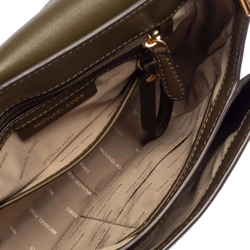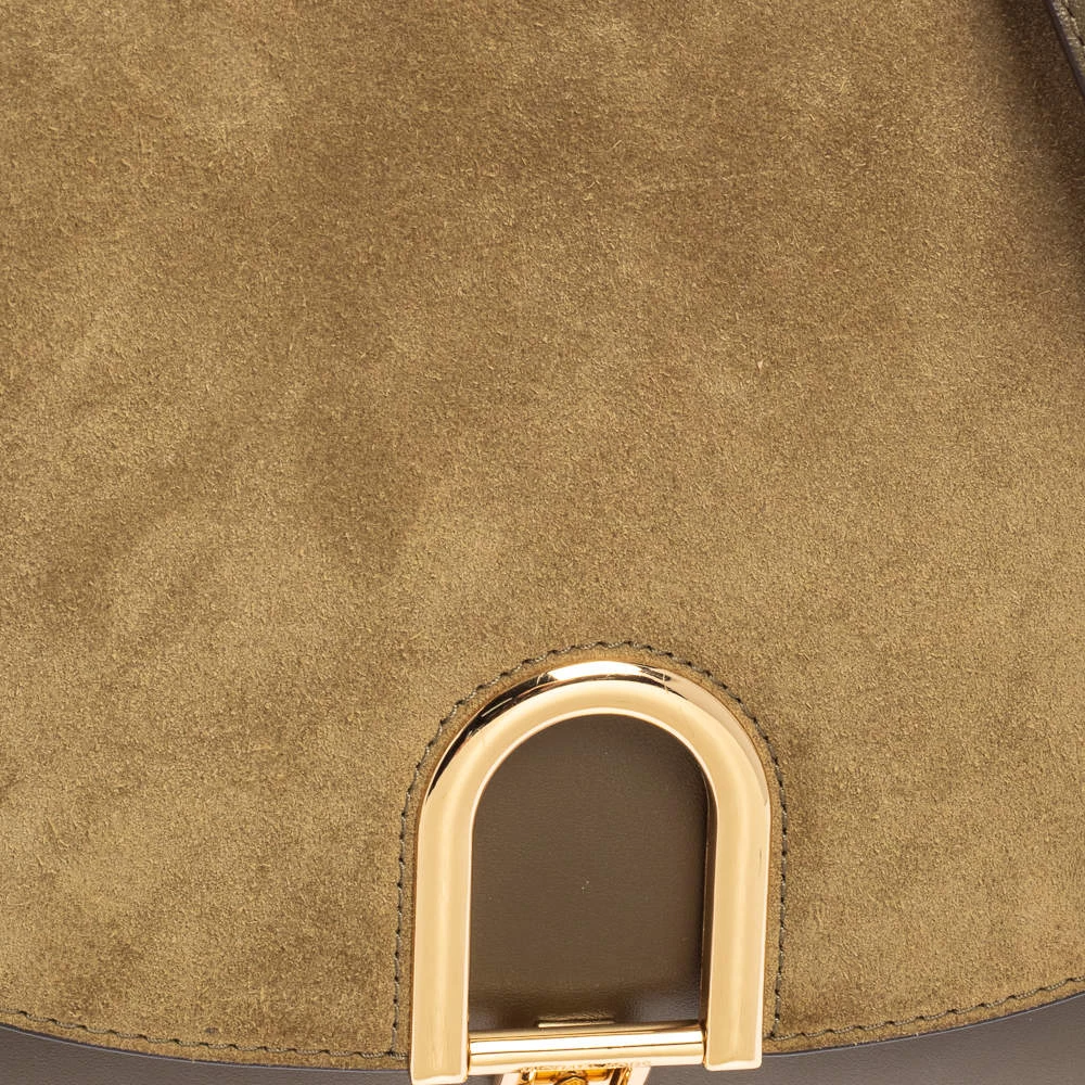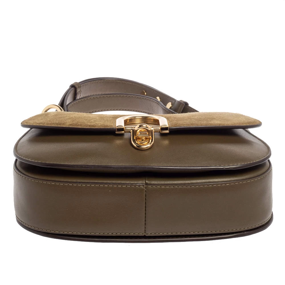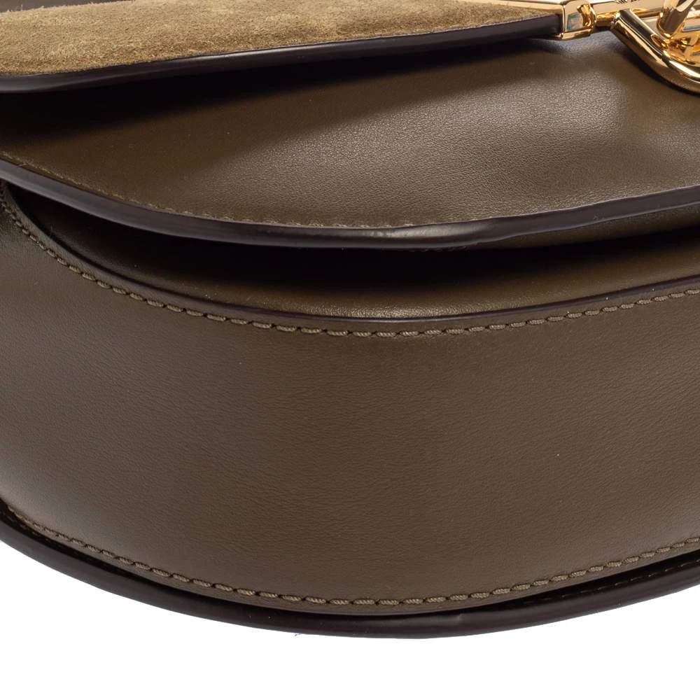 Let your audience be dazzled when you make your own style statement with this trendy leather & suede handbag. Expertly designed from quality leather, this olive green bag is lined with fabric. It has a front flap with gold-tone hardware detailing that opens to the interior. It has a long shoulder strap for convenience.