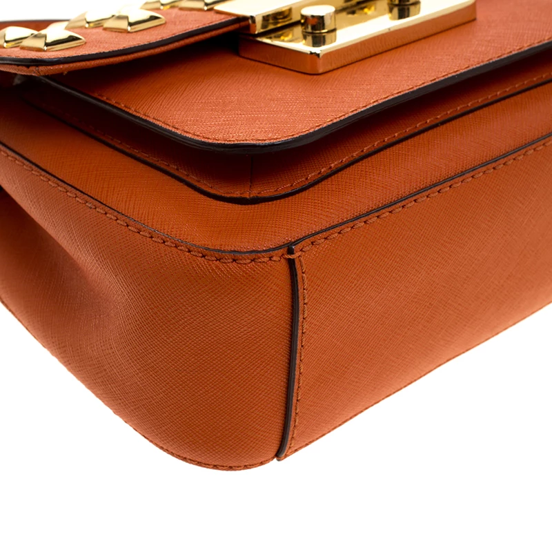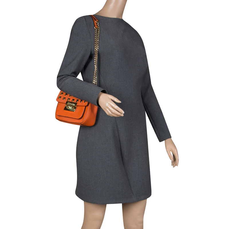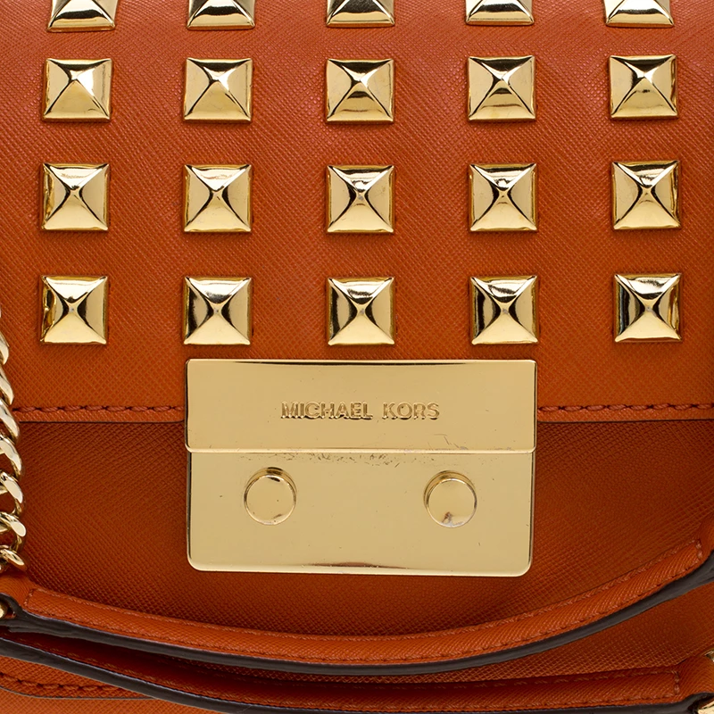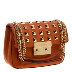 Elevate your style with this gorgeous Sloan shoulder bag by Michael Kors. Crafted from orange leather the bag features gold-tone stud detailing on the exterior. It has a spacious fabric lined interior that houses two open compartments and a zipped compartment. This beauty is complete with dual chains straps with leather shoulder rest and is totally worth the splurge!