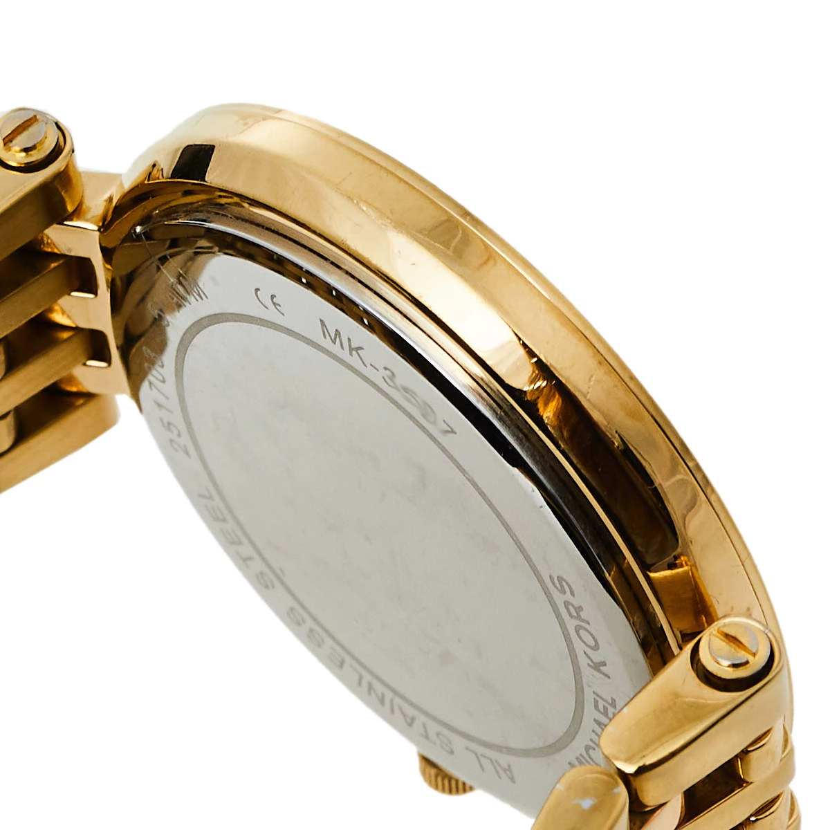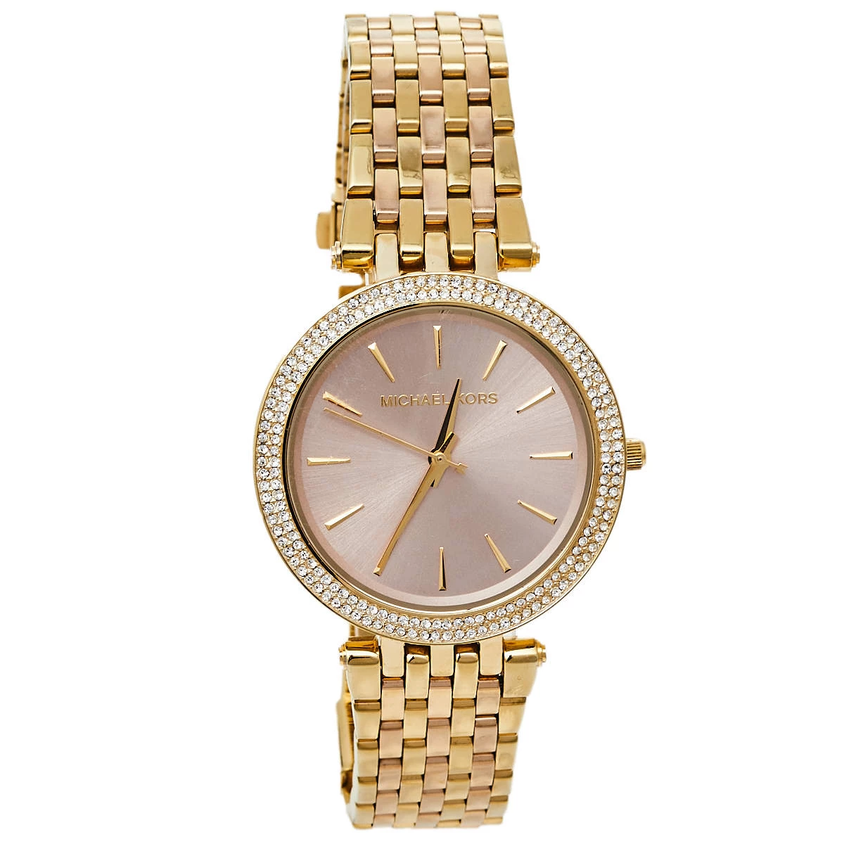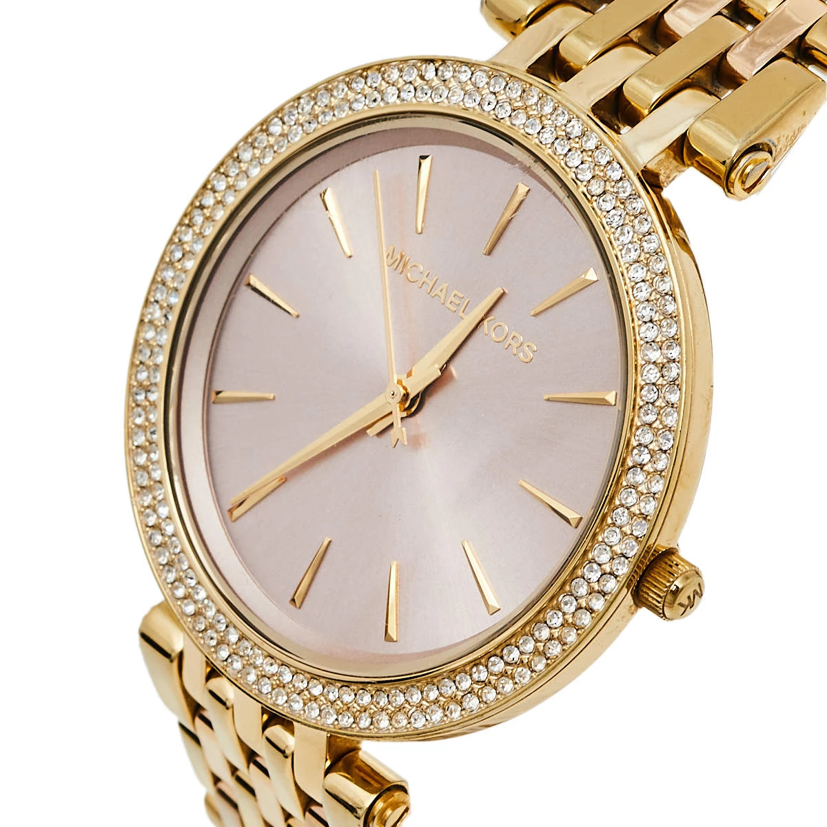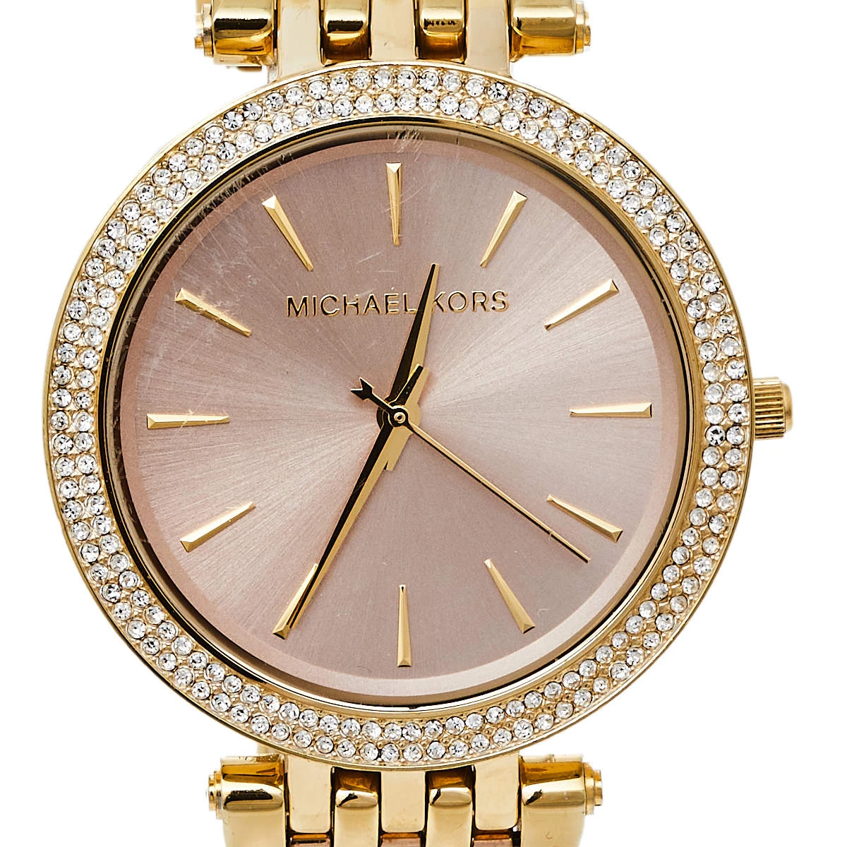 Studded with dazzling crystals on the bezel, this Michael Kors Darci wristwatch knows how to charm its way to your esteemed collection of elegant timepieces. The sophisticated gold-tone stainless steel body of this quartz watch is detailed with a pink dial that flaunts index hour markers and three hands. The chain-link bracelet is secured using a push-button deployment clasp and the watch is equipped with a water resistance of 50 meters.