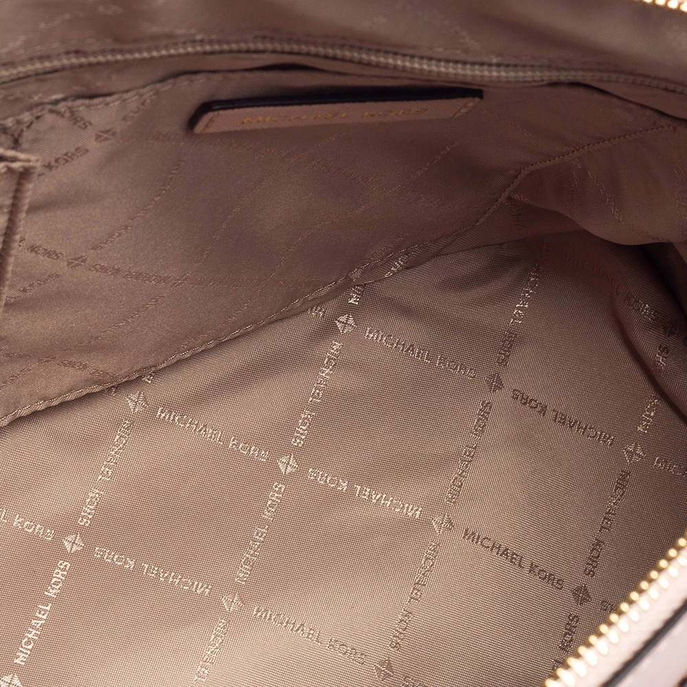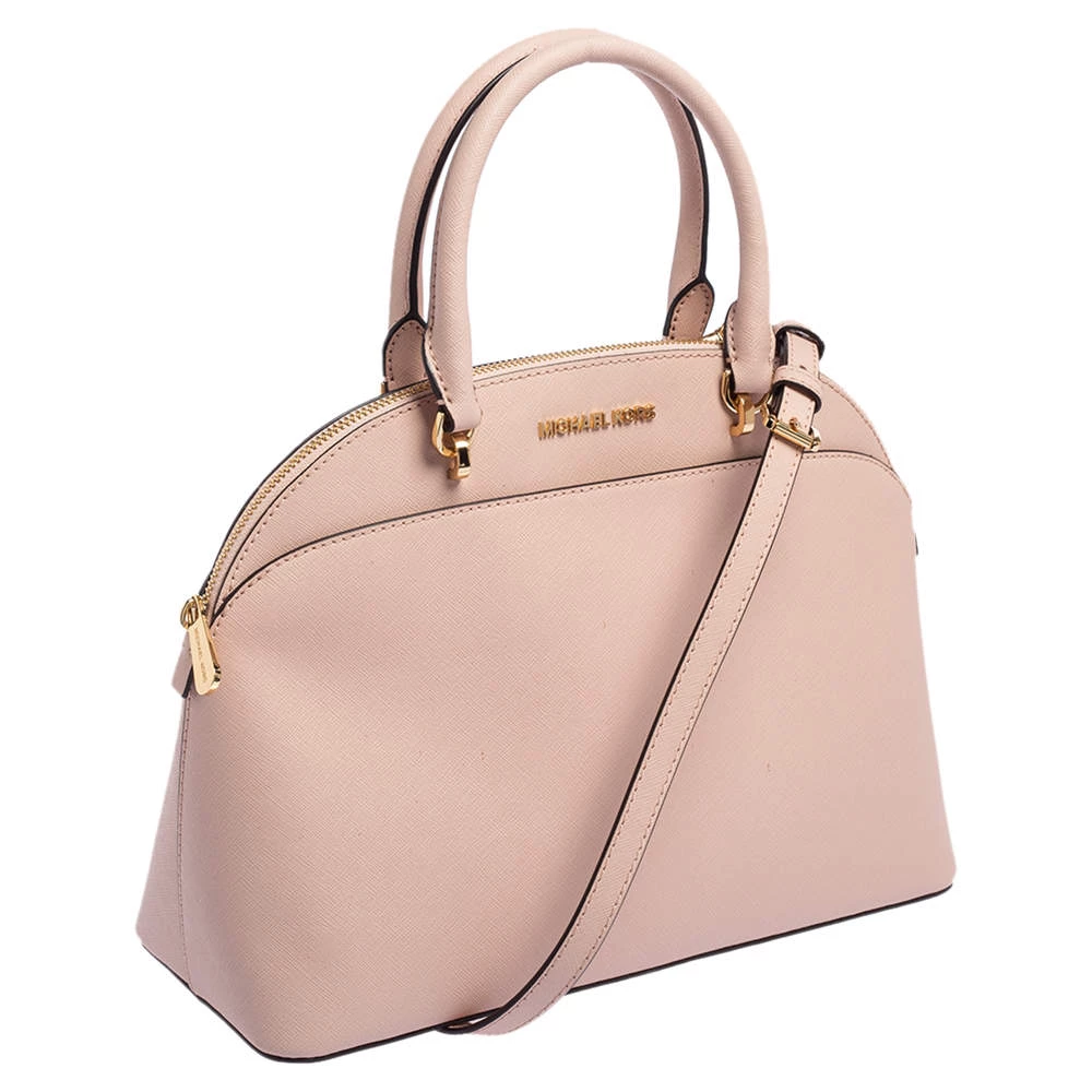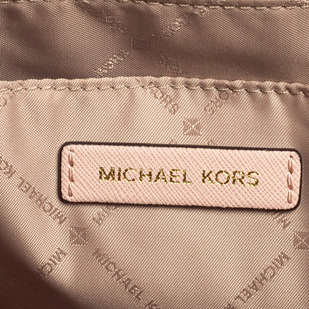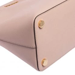 Well known for their trendy designs and exquisite craftsmanship, Michael Kors handbags are at the top of every woman’s wardrobe. Get this contemporary leather bag made with a modern touch. This pink satchel has a roomy, fabric-lined interior. It is finished with dual handles, a shoulder strap, and gold-tone hardware.