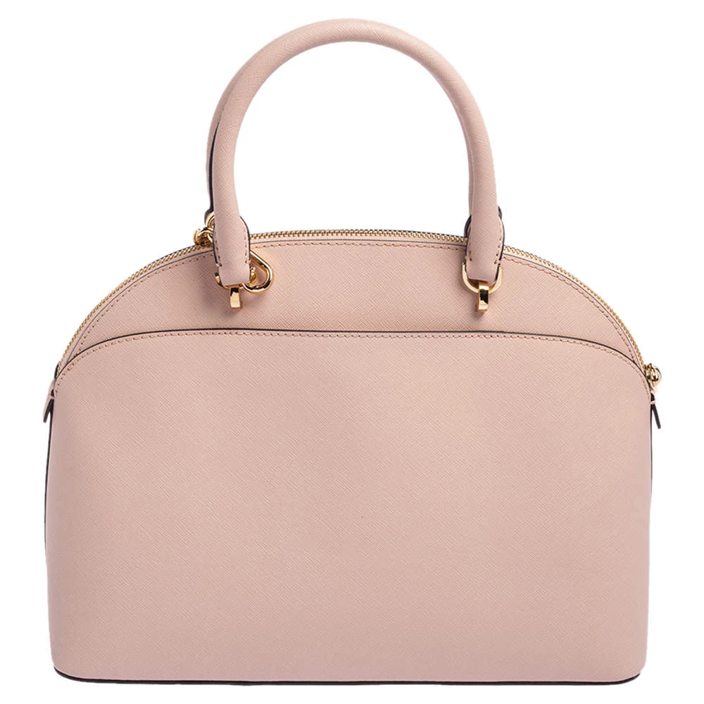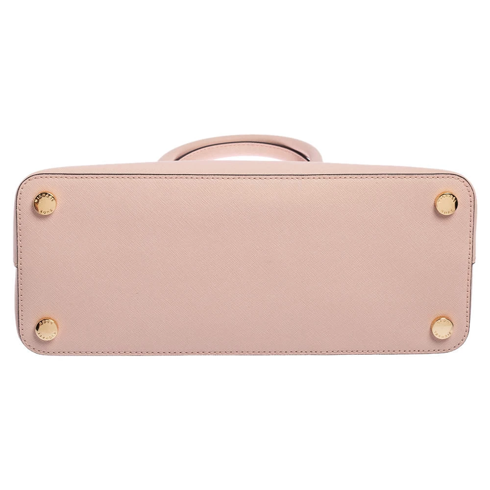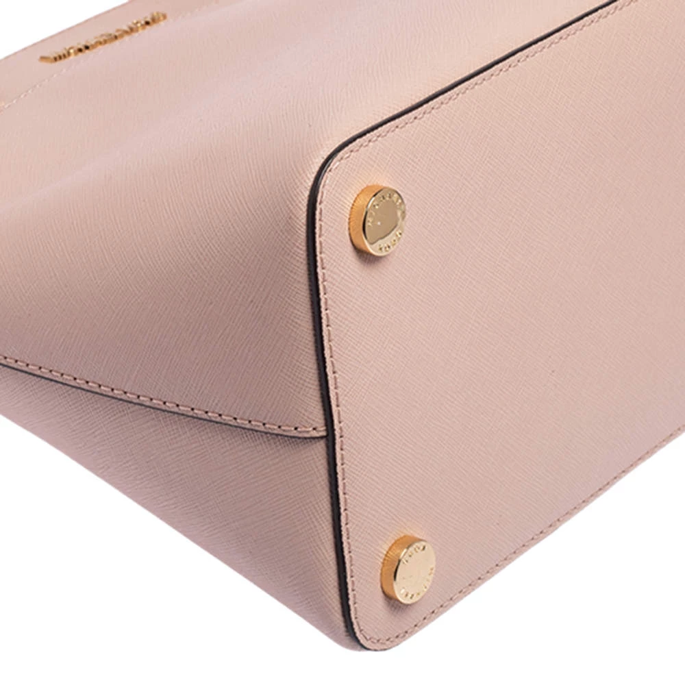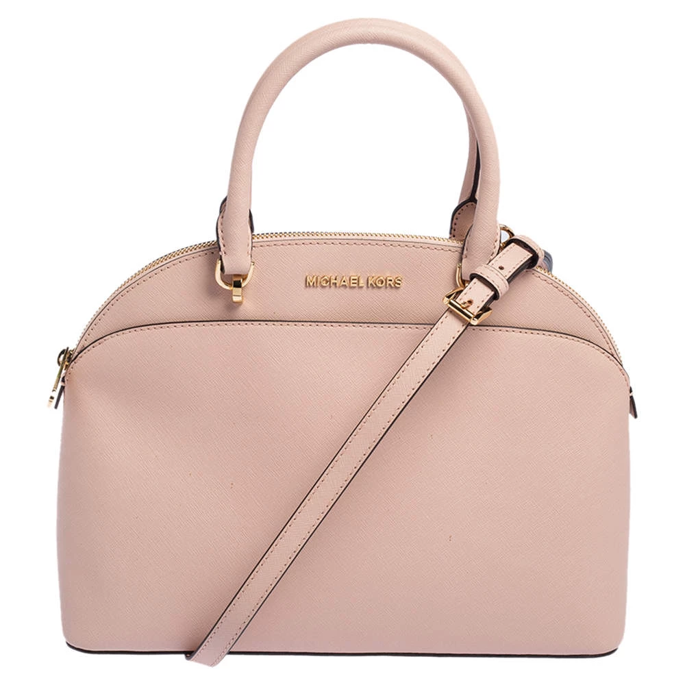 Well known for their trendy designs and exquisite craftsmanship, Michael Kors handbags are at the top of every woman’s wardrobe. Get this contemporary leather bag made with a modern touch. This pink satchel has a roomy, fabric-lined interior. It is finished with dual handles, a shoulder strap, and gold-tone hardware.