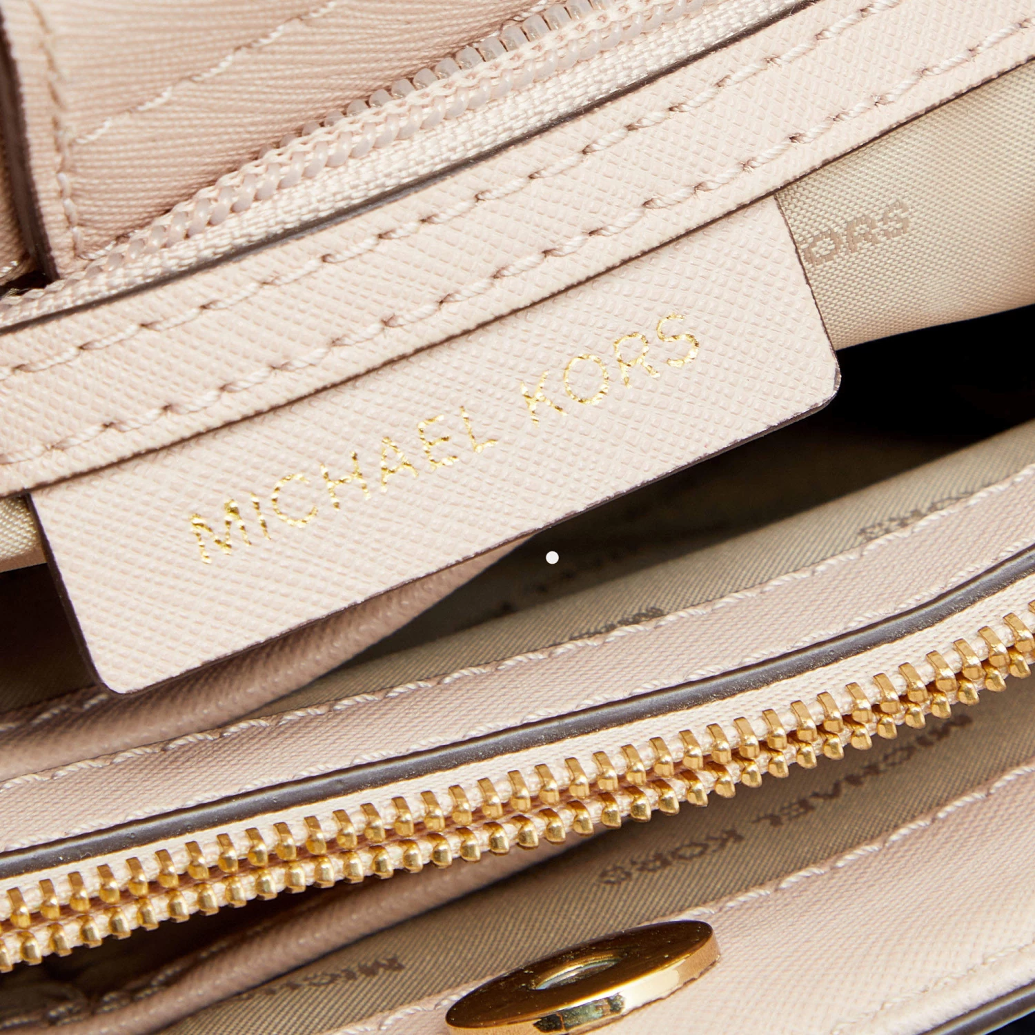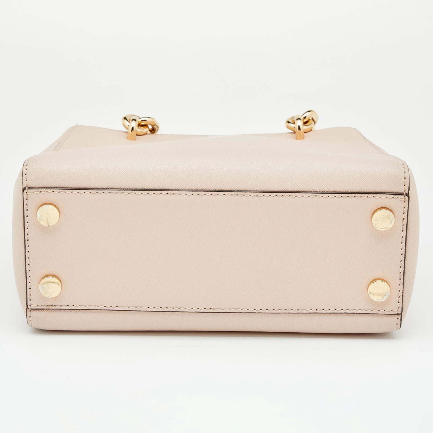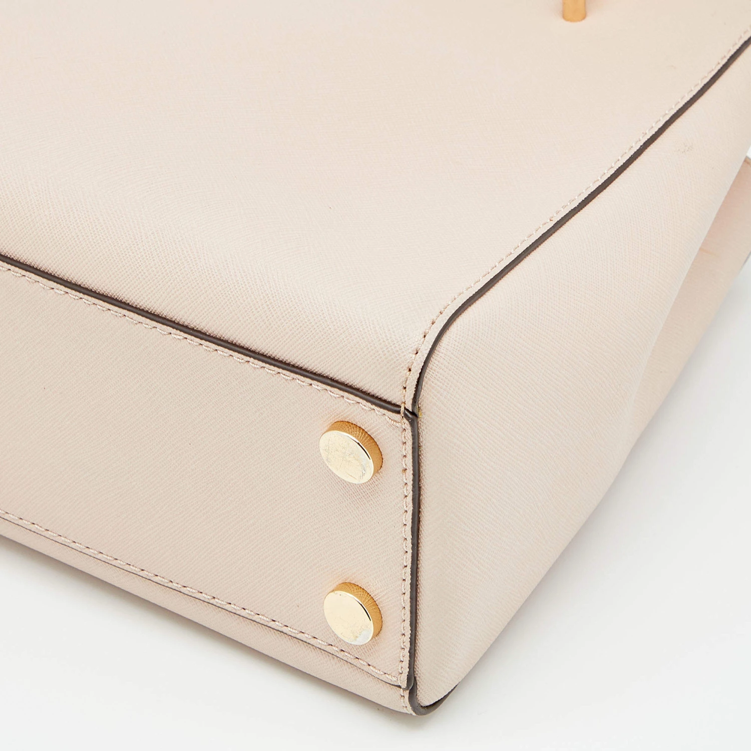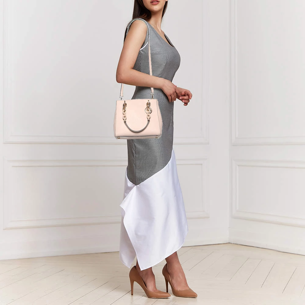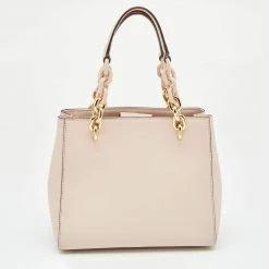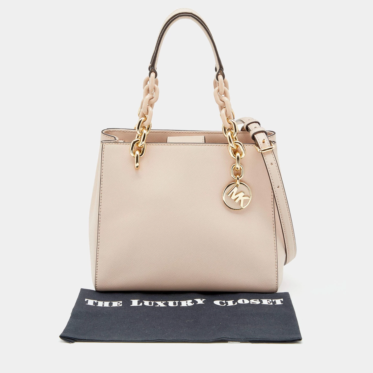 This Cynthia tote by Michael Kors is a bag perfect for frequent use. Meticulously crafted from leather, it features a pink hue and two handles as well as a shoulder strap for you to parade it. The bag is equipped with a spacious nylon-lined interior, gold-tone hardware, and the MK charm.