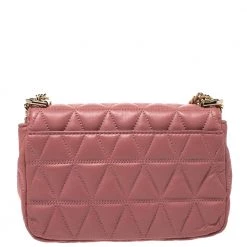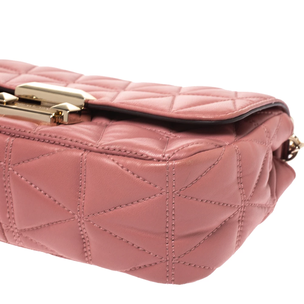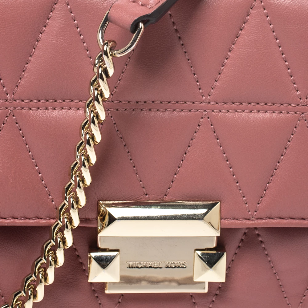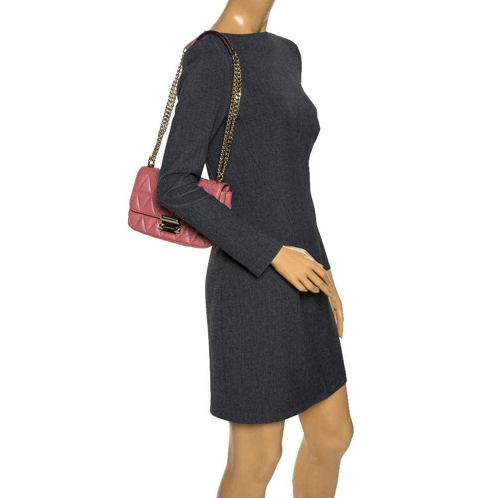 Fall in love with this Sloan bag from Michael Kors. Crafted from pink quilted leather, the bag flaunts a lock closure on the front. It has a spacious fabric-lined interior that has two zip pockets. This beauty is complete with a chain-link and leather shoulder strap.