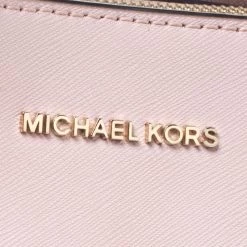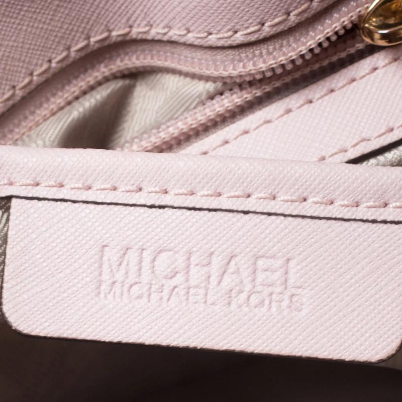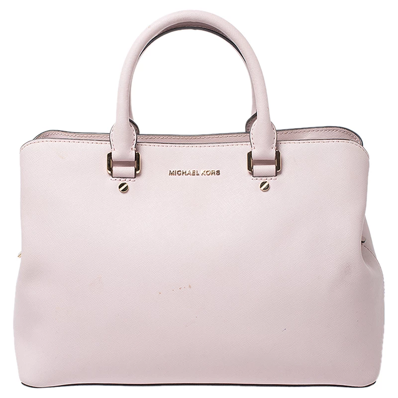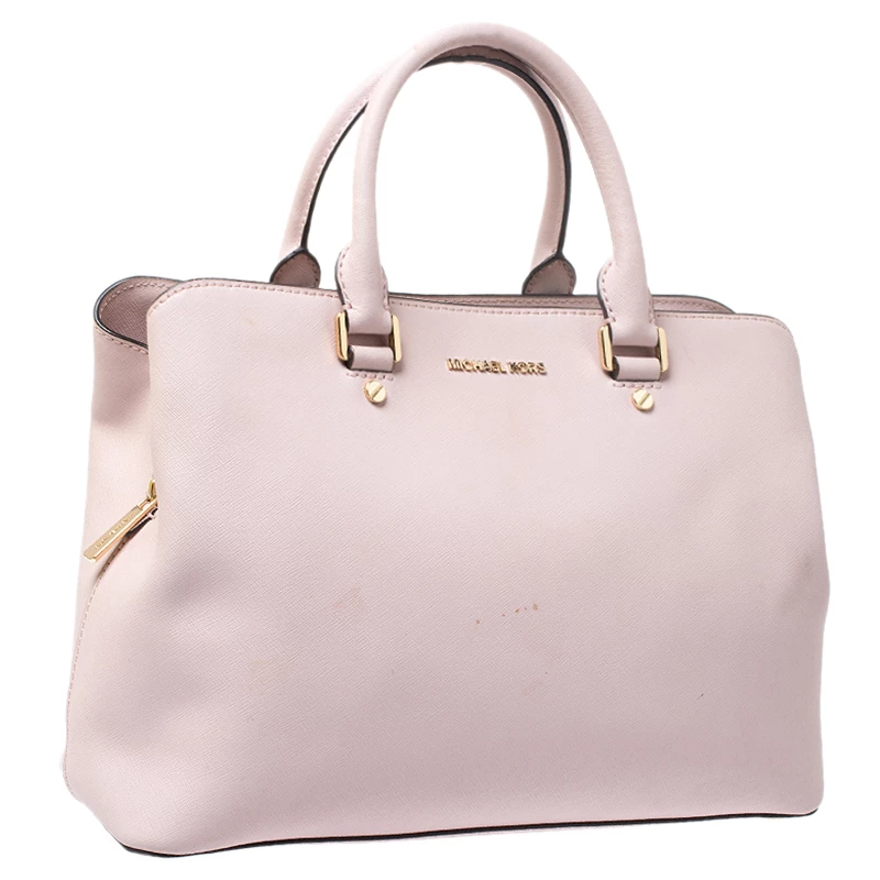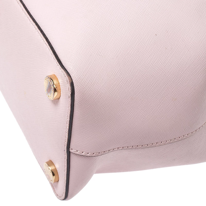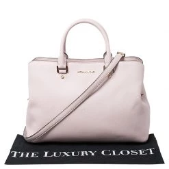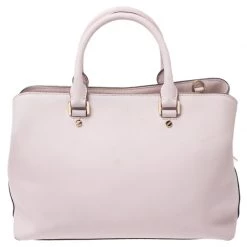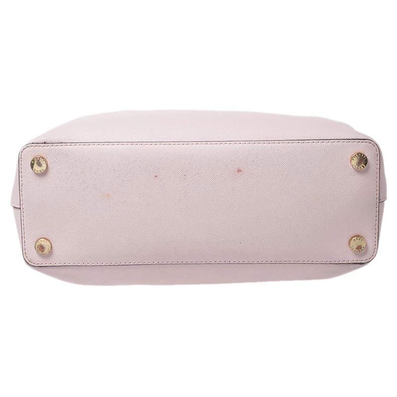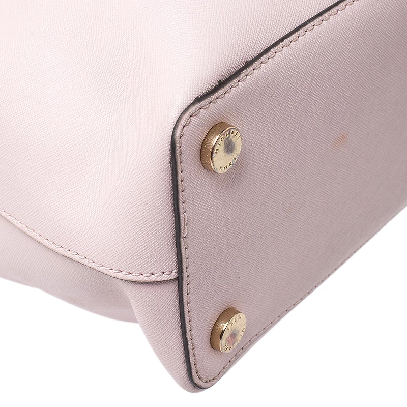 Impeccably prepared in Saffiano leather, this satchel is from Michael Kors. The bag features a pink hue, dual handles and a shoulder strap. The interior is fabric lined and comes with two compartments.