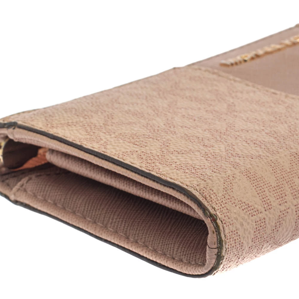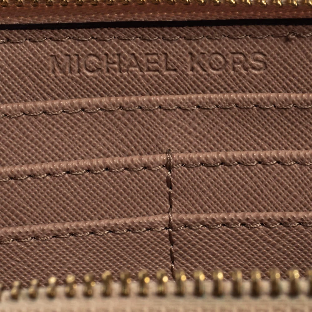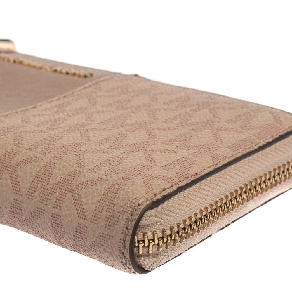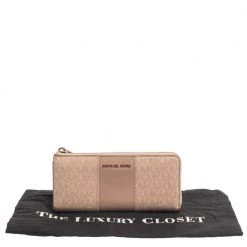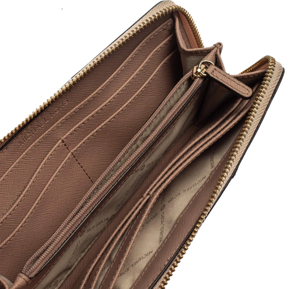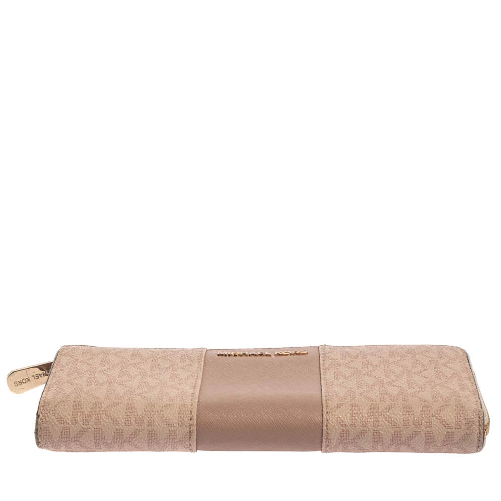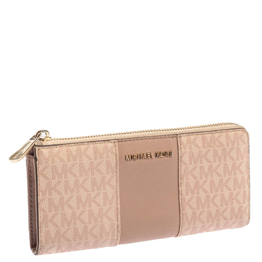 Designed to perfection and crafted from fine quality leather, this wallet will be your go-to accessory. From the house of Michael Kors, it is crafted from signature leather in a pink hue. The creation is secured by a zip-around closure and complete with the logo plaque for a signature touch.