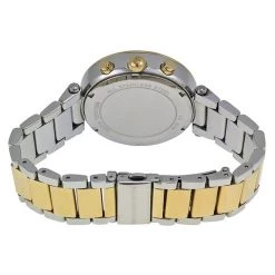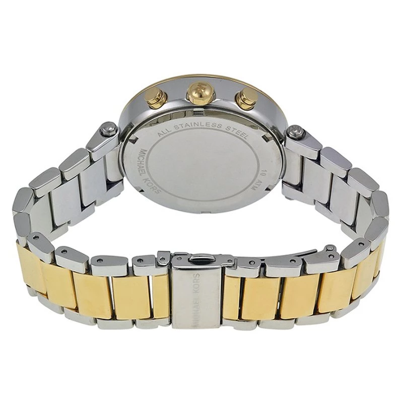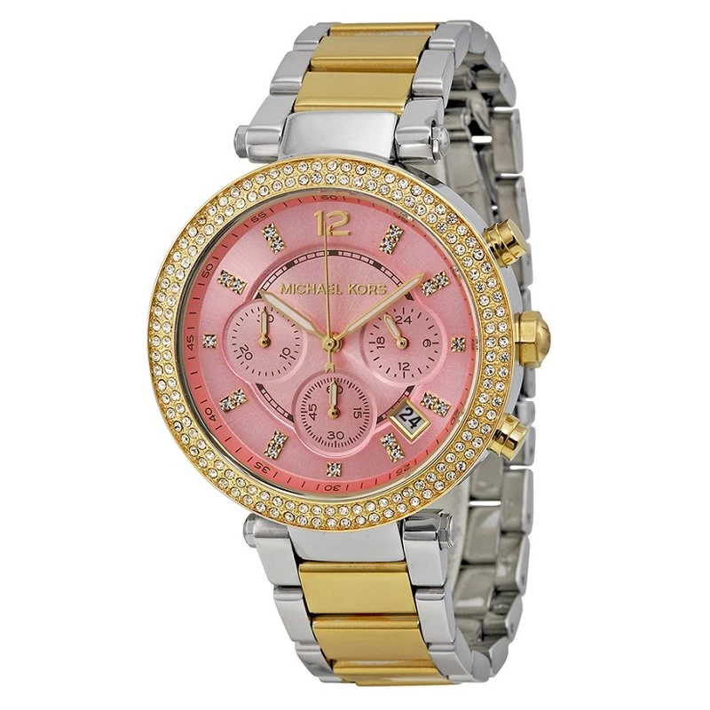 This Parker MK6140 watch by Michael Kors has everything you need. Featuring a stainless steel case, it comes with a gold-plated diamond studded bezel and is highlighted with a pink dial. It features gold-tone luminescent hands, diamond hour indicators and a date window between 4 o’clock and 5 o’clock. This Swiss creation houses three matching sub dials. The dual tone chain link bracelet is equipped with a push button clasp closure.