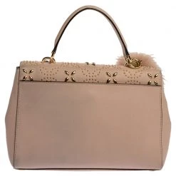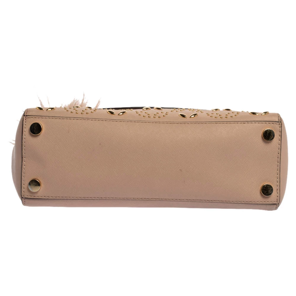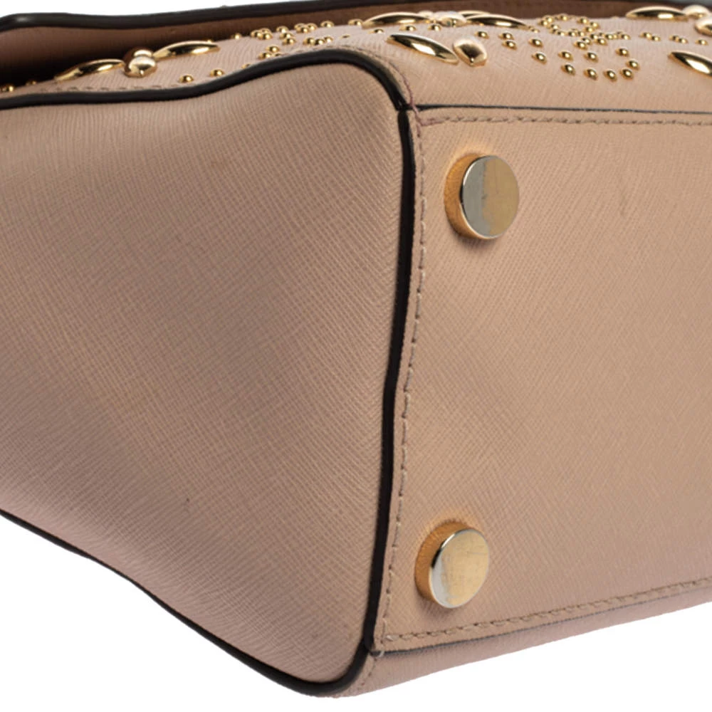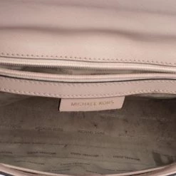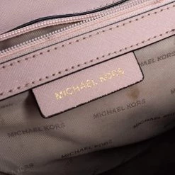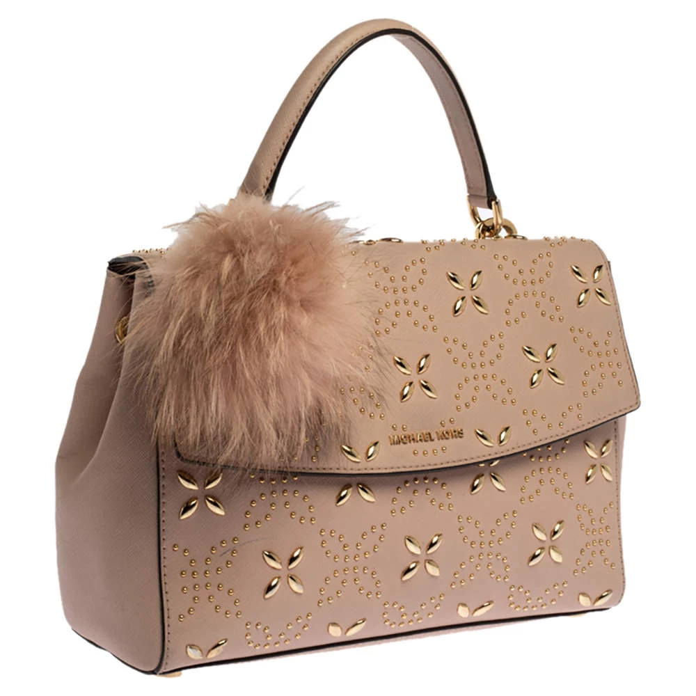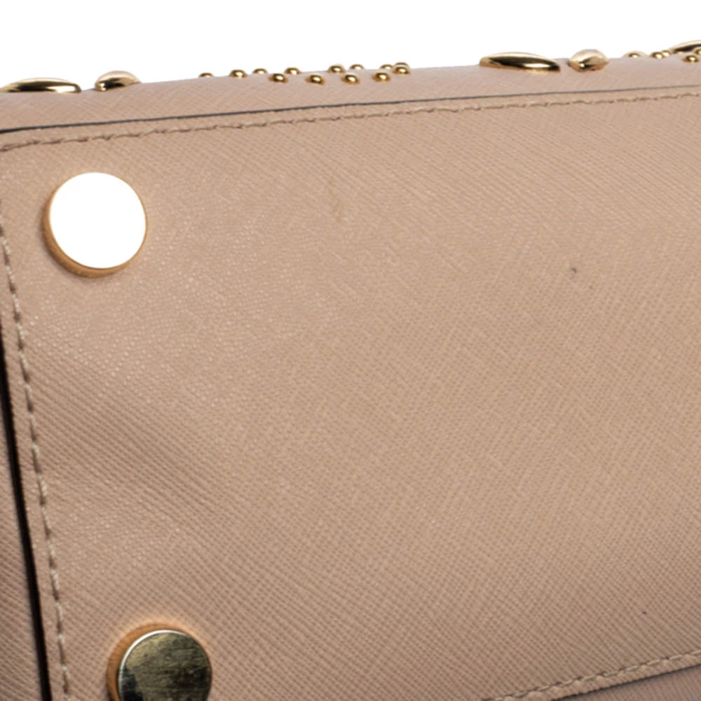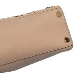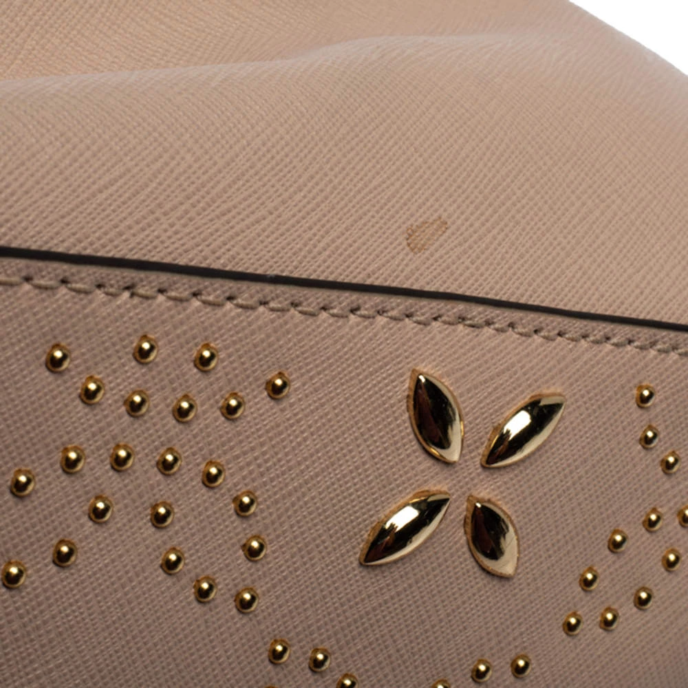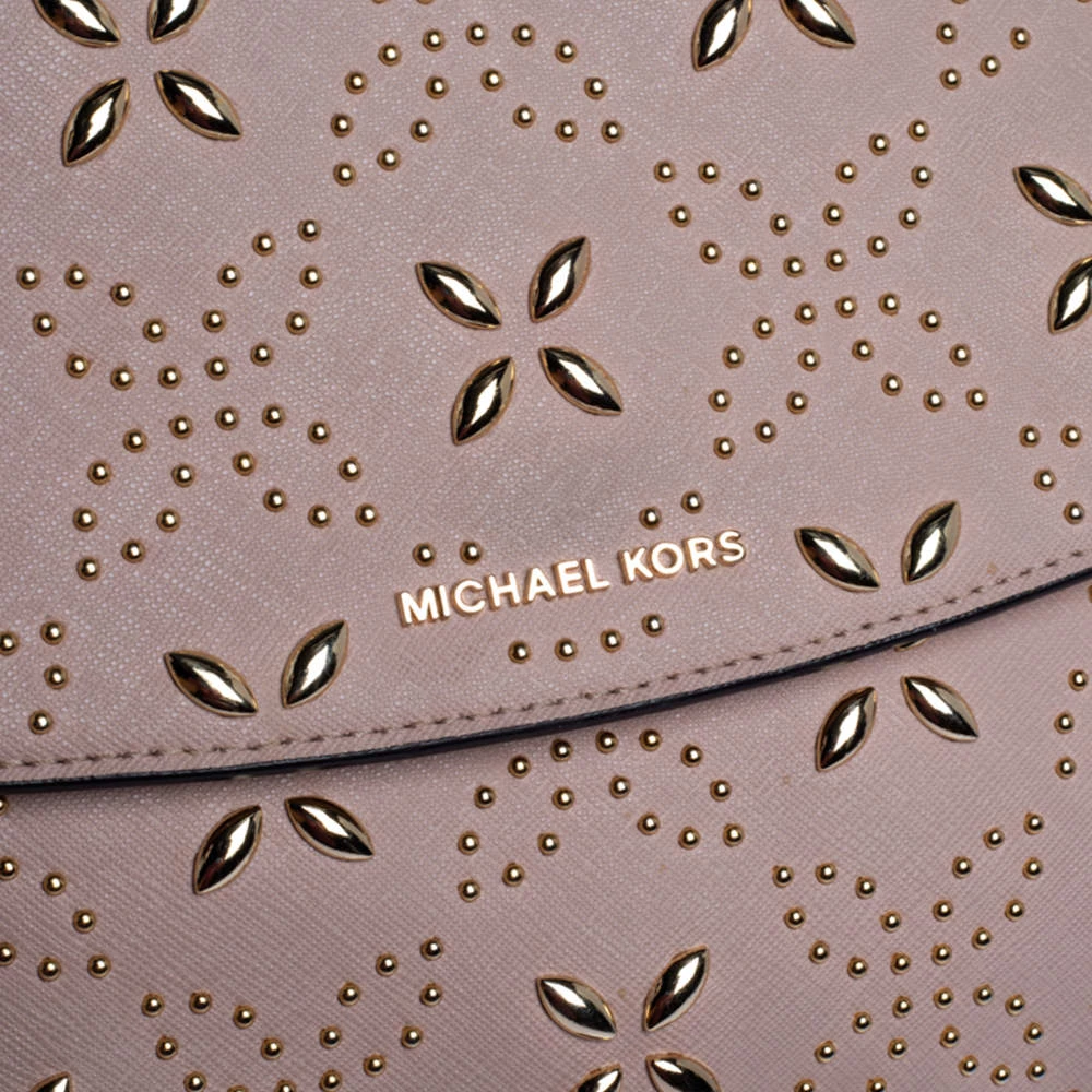 This pink-colored bag comes from the fashion house of Michael Kors. Crafted from leather, it features a durable fabric interior that ensures to house your lipsticks, wallet and other essentials. Designed with a flap closure, it flaunts gold-tone studs adorning the front along with the brand logo.