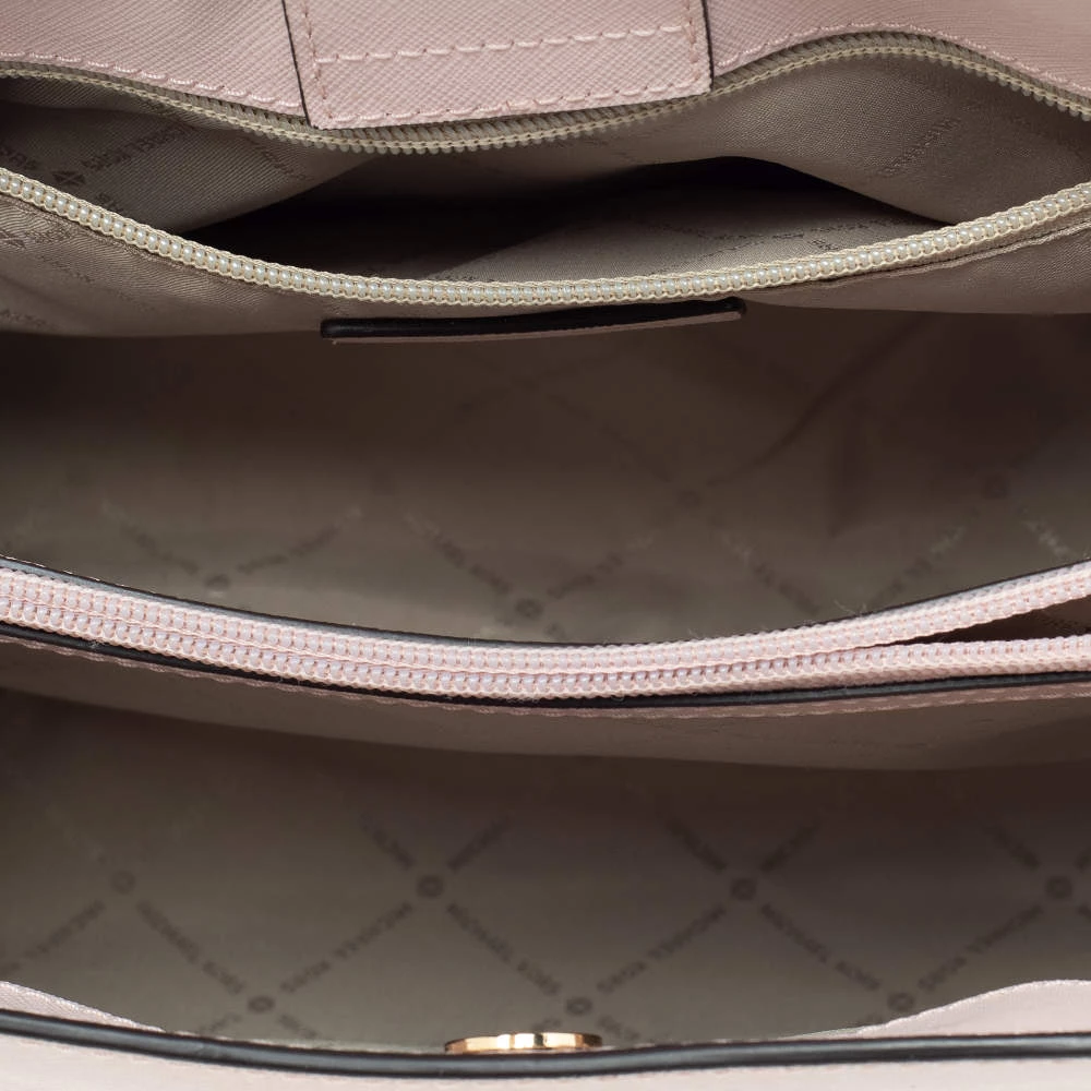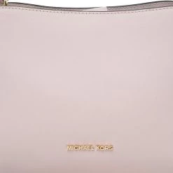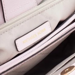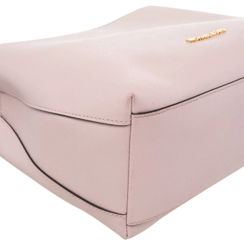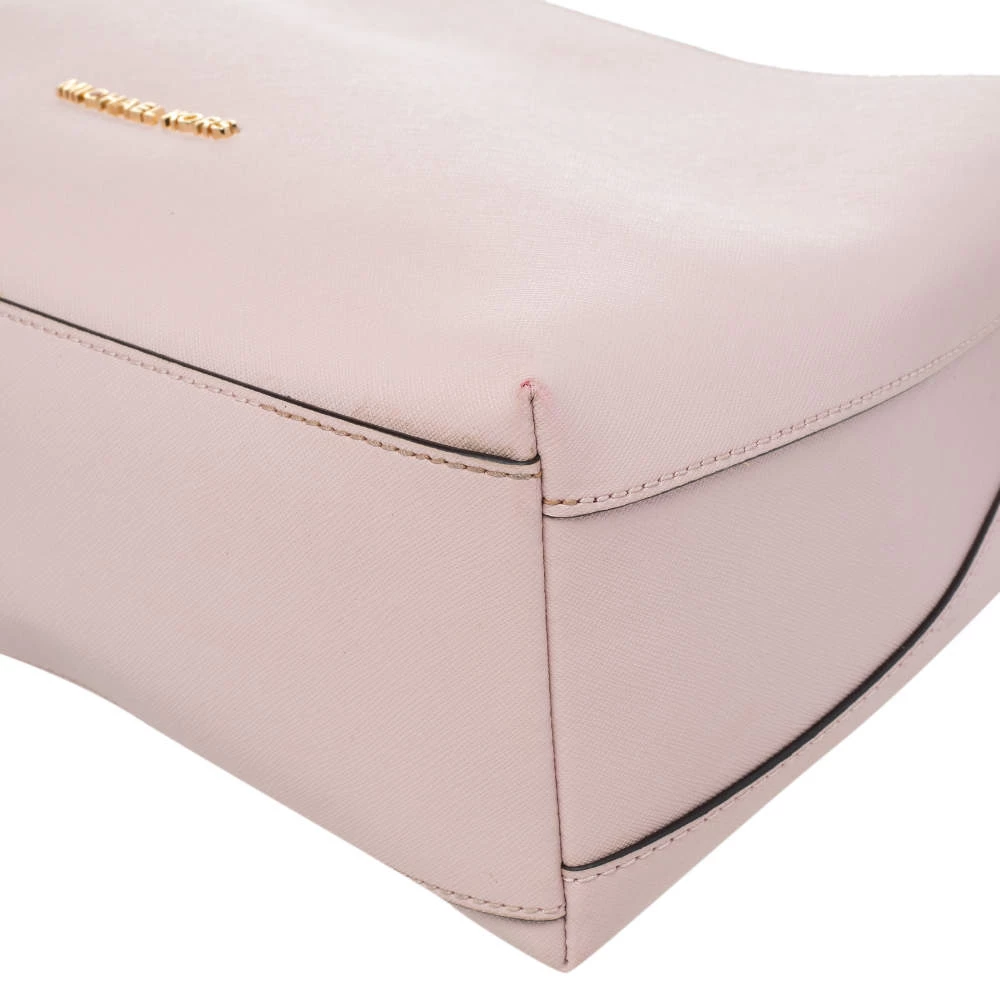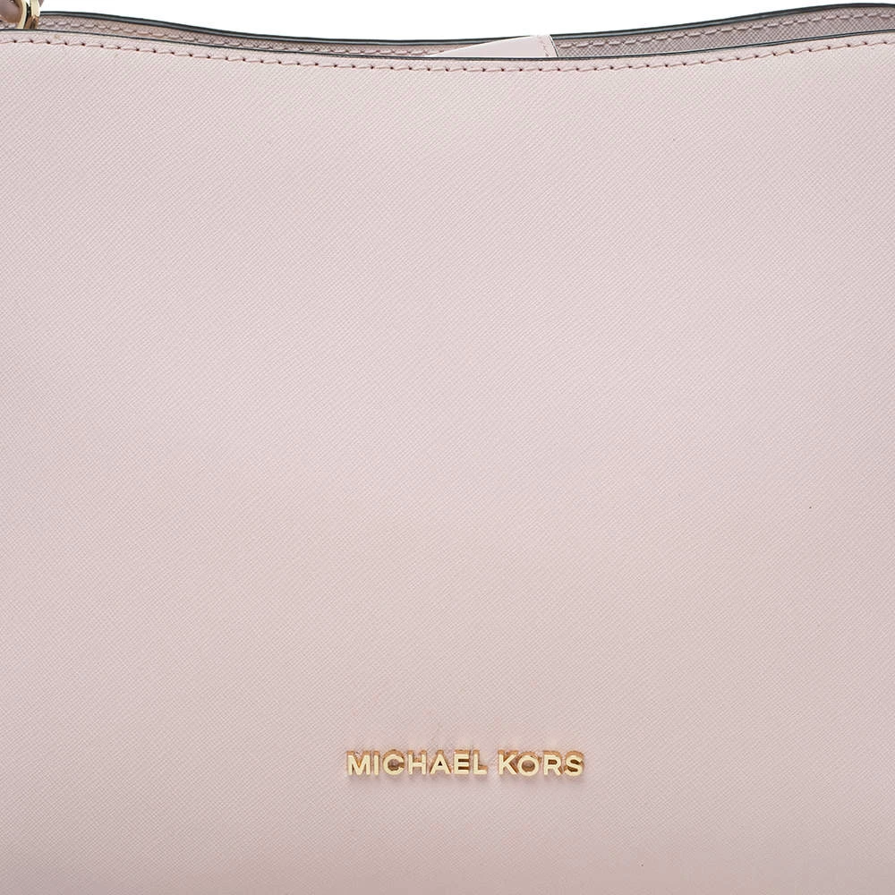 Carry this bag from Michael Kors without compromising on style. This pink Saffiano leather bag comes in a simple design with brand detail on the front. This chic bag opens to a nylon-lined interior and is held by a single handle.