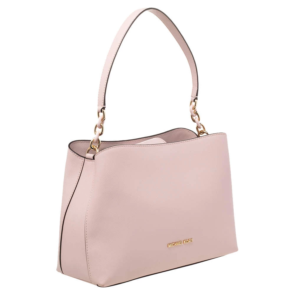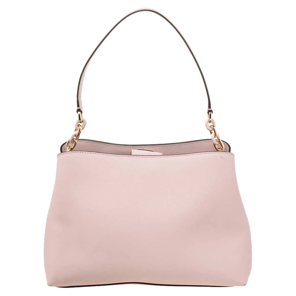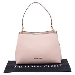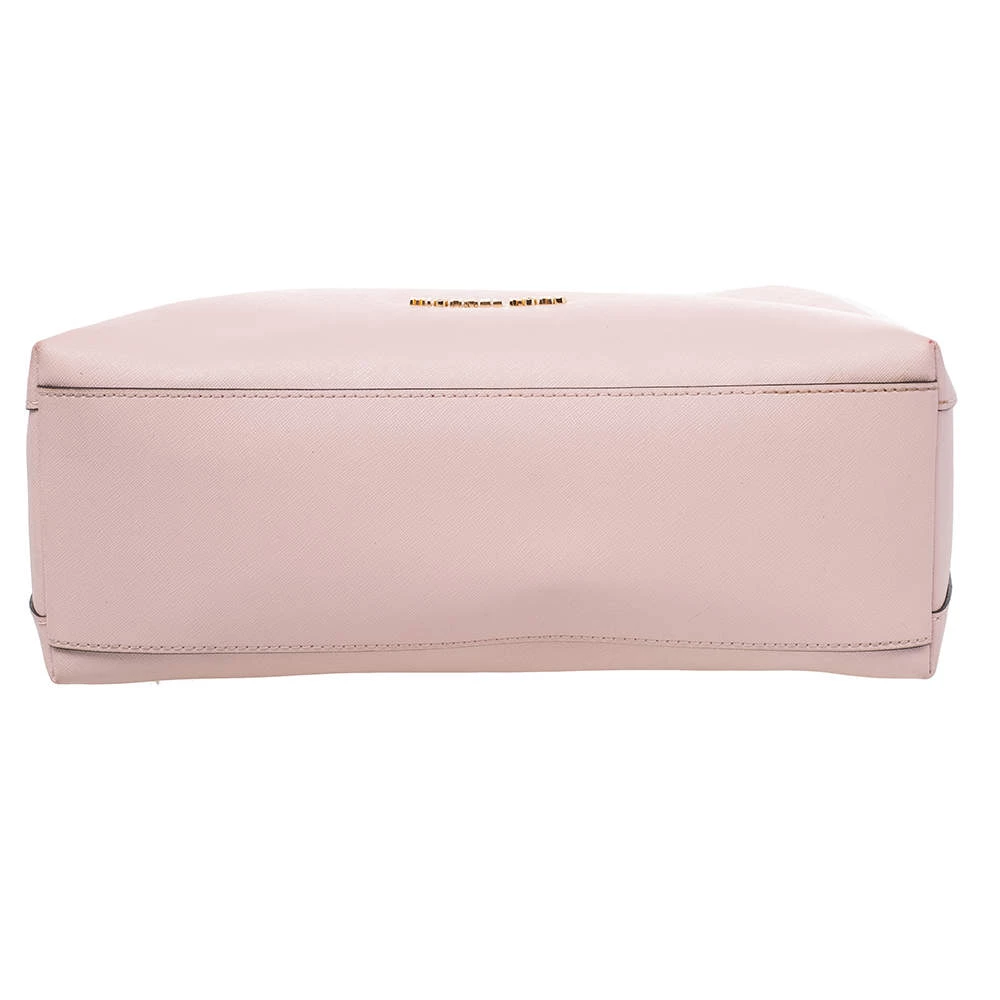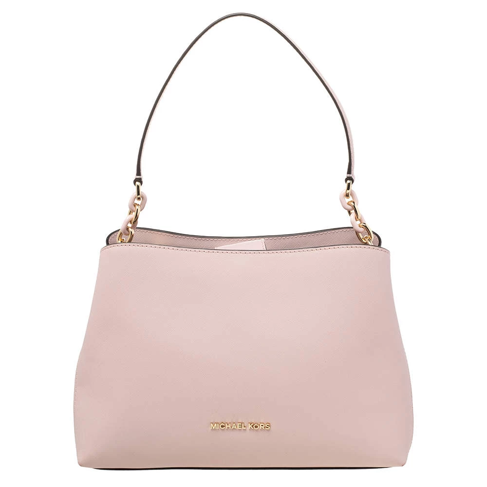 Carry this bag from Michael Kors without compromising on style. This pink Saffiano leather bag comes in a simple design with brand detail on the front. This chic bag opens to a nylon-lined interior and is held by a single handle.