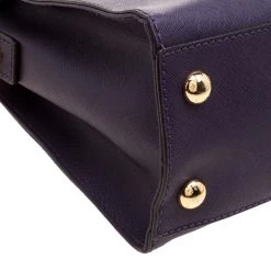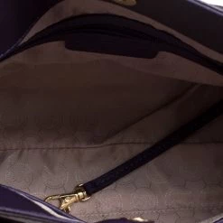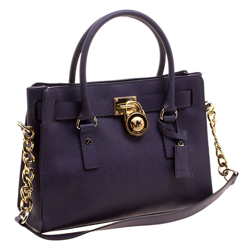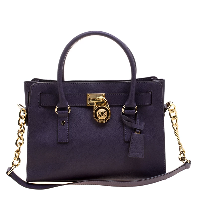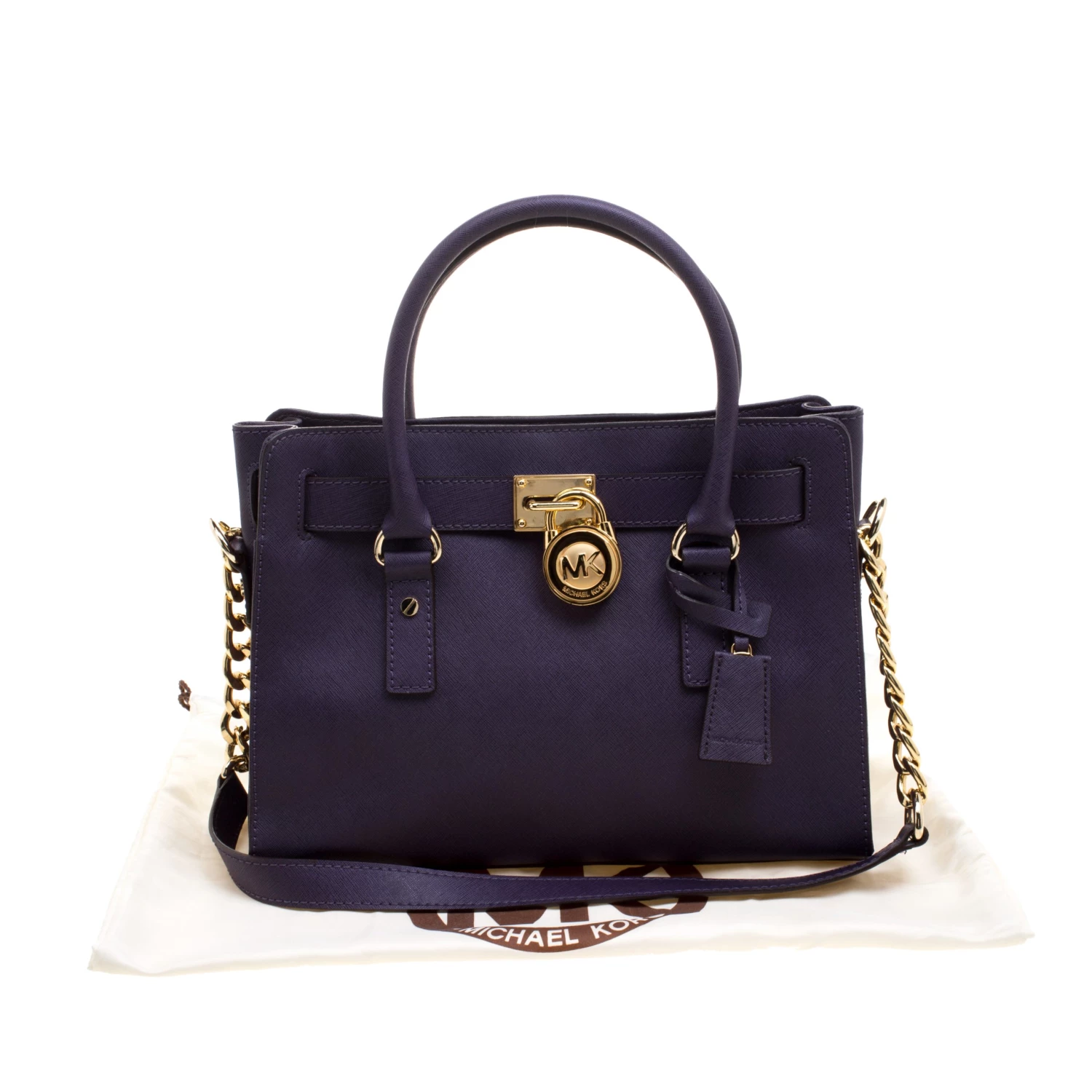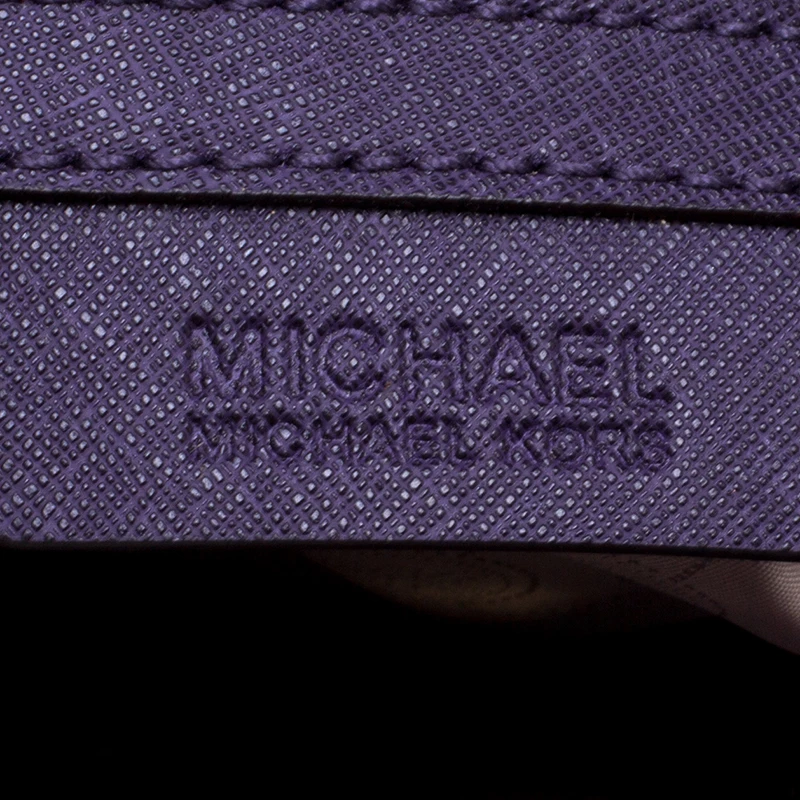 This stylish Hamilton satchel from Michael Kors will make a standout addition to your collection. The bag features dual top handles, a shoulder strap, protective metal feet, a Michael Kors lock and a purple leather exterior. It has a spacious fabric lined interior that will hold all your belongings.