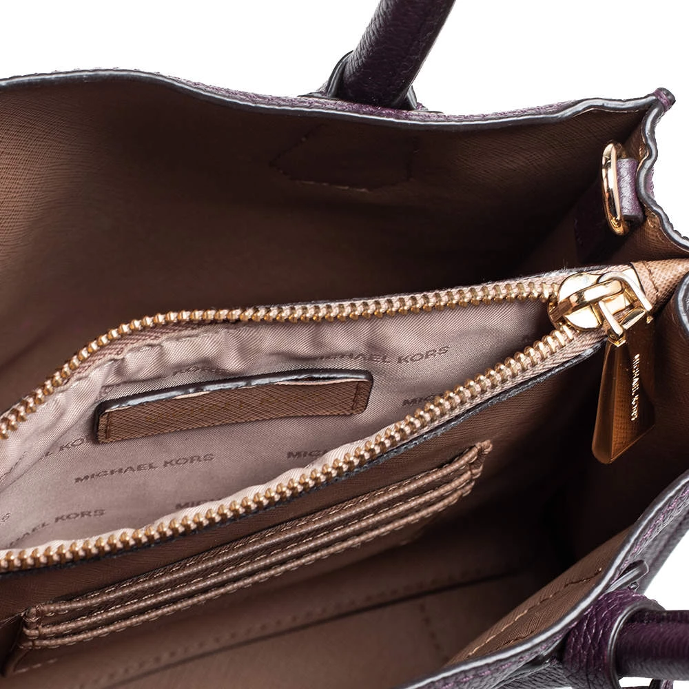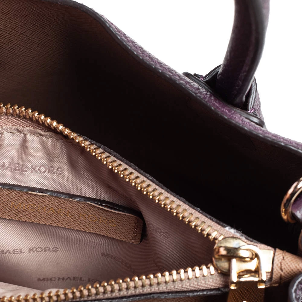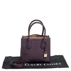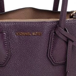 Featuring a chic and fabulous style, this Michael Kors tote is modern. Crafted from leather in a stunning purple, the tote features dual handles, a removable shoulder strap, and a padlock. It opens to a spacious leather/fabric interior that houses two open compartments divided by a zip compartment. The tote comes with protective metal feet and you will love to swing this beauty in style.