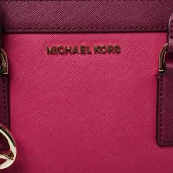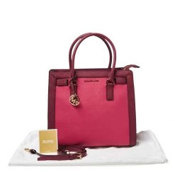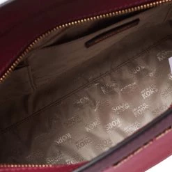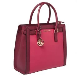 This elegant Michael Kors Dillon bag deserves to be in your closet. Stunning in appeal, the bag features dual handles, a shoulder strap, and an MK charm. It’s crafted from raspberry/red leather, and the fabric-lined interior is made in a spacious size.