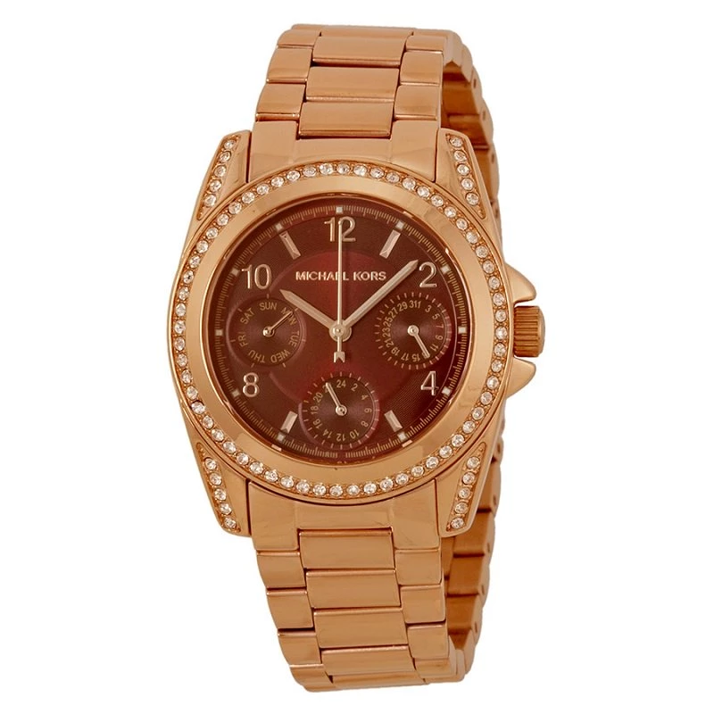 Get noticed when you wear this sharp timepiece from Michael Kors. Crafted from Rose gold-plated stainless steel, it has a fixed bezel set with crystals, a red dial with luminous rose gold-tone hands and Arabic numerals and index hour markers, along with three multi-function sub-dials. The Rose Gold-Plated stainless steel bracelet features a deployment clasp.