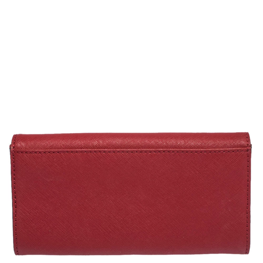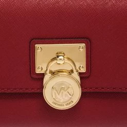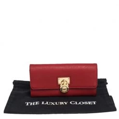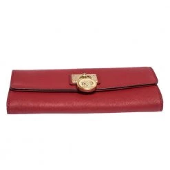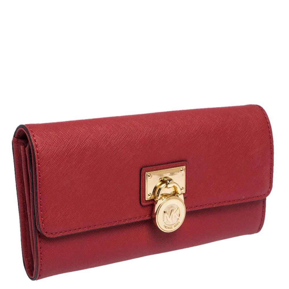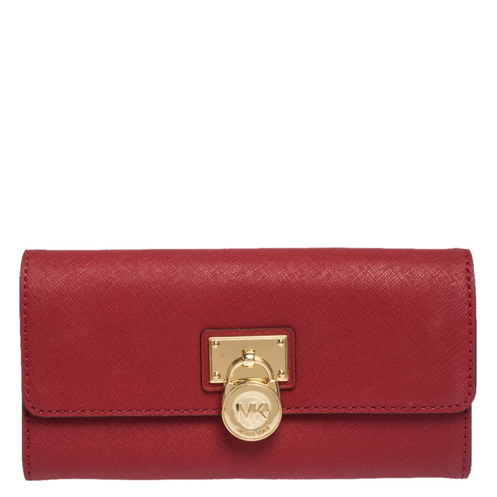 This Hamilton wallet is from Michael Kors. It is crafted from red leather and decorated with an engraved padlock on the front. The bag has a front flap, and a spacious leather and fabric interior. It is equipped with a zip pocket and multiple slots. This creation is ideal for everyday use.