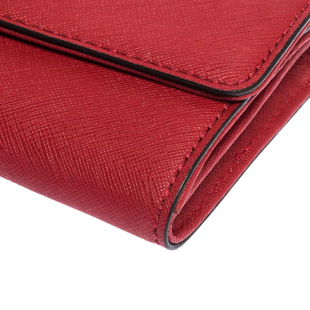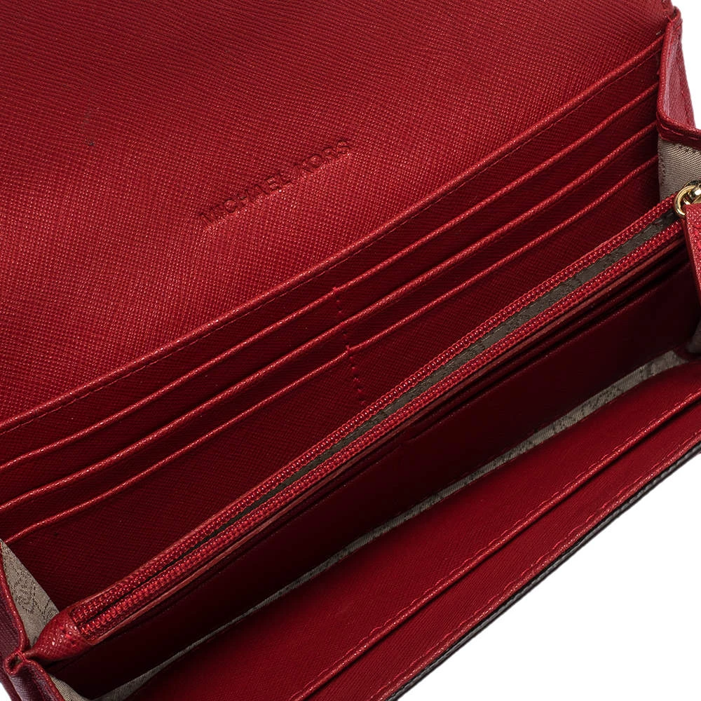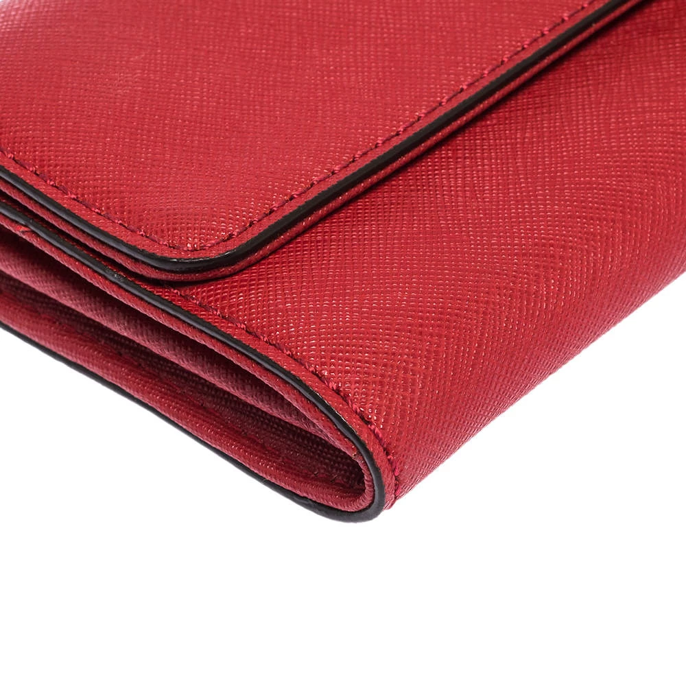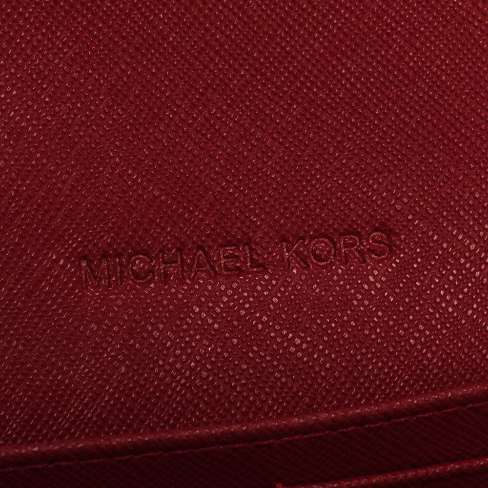 This Hamilton wallet is from Michael Kors. It is crafted from red leather and decorated with an engraved padlock on the front. The bag has a front flap, and a spacious leather and fabric interior. It is equipped with a zip pocket and multiple slots. This creation is ideal for everyday use.