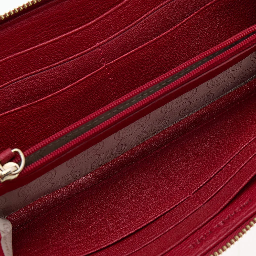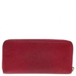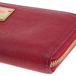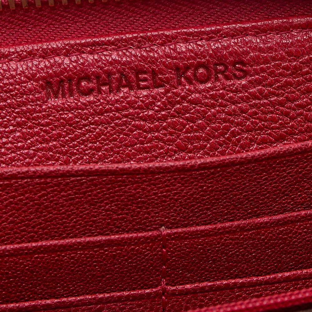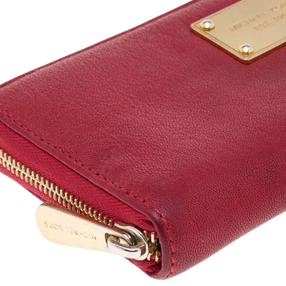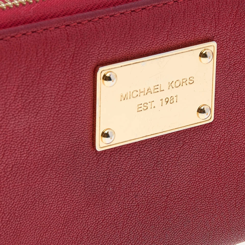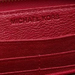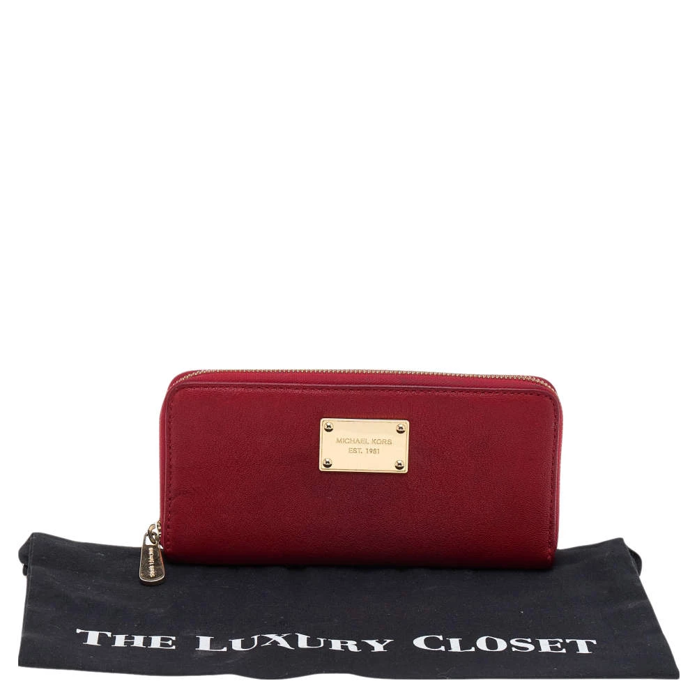 This stunning Jet Set wallet from Michael Kors is a great fashionable commodity to own. It is styled using red leather with a gold-toned plaque embellishing the front. It has a zip-around feature that leads us to an organized nylon-leather interior. Grab this beauty today!