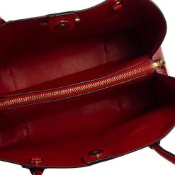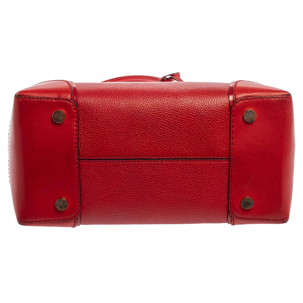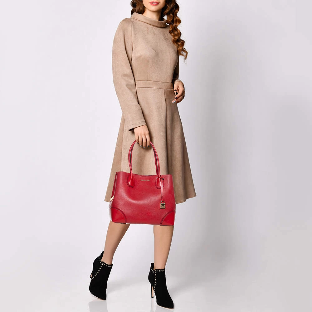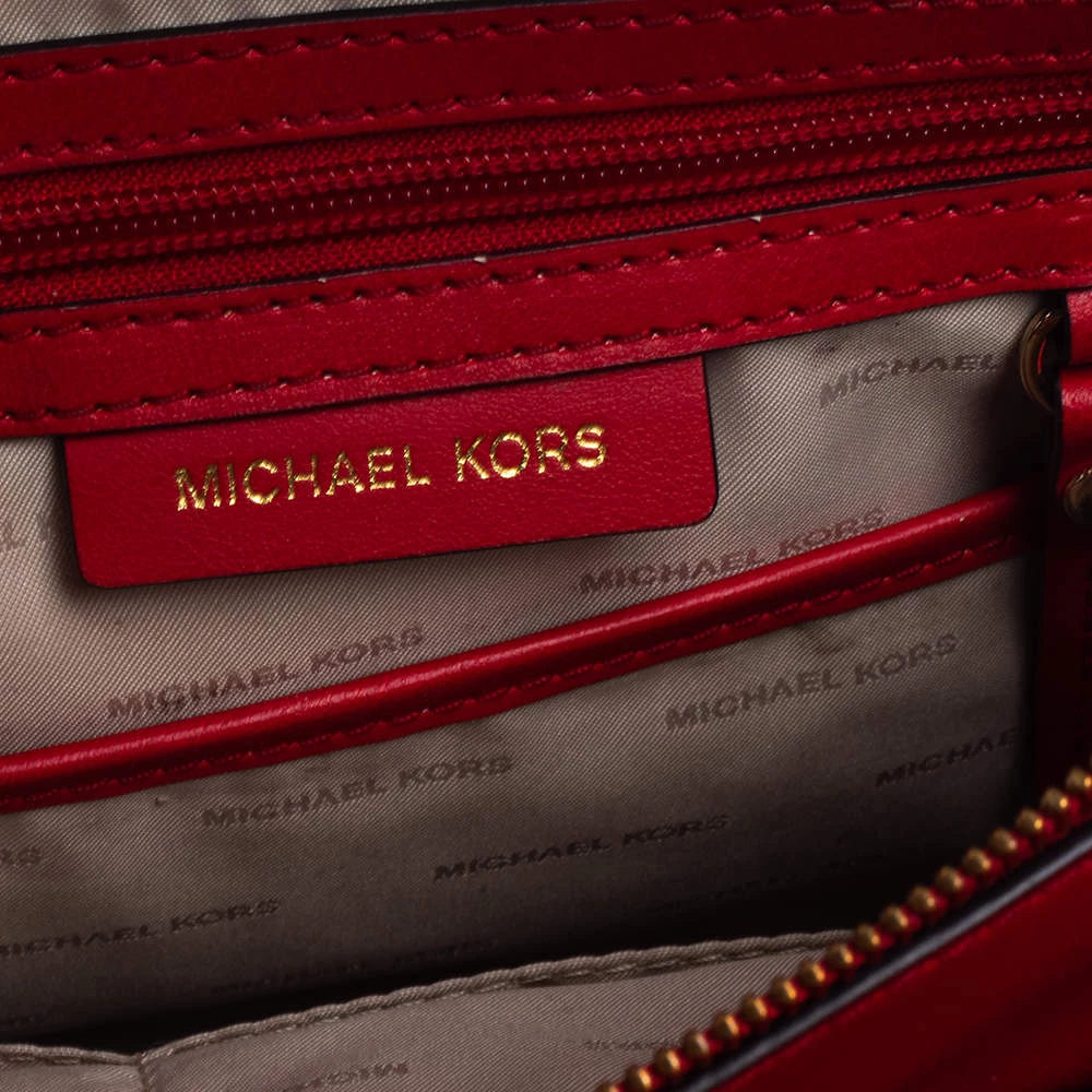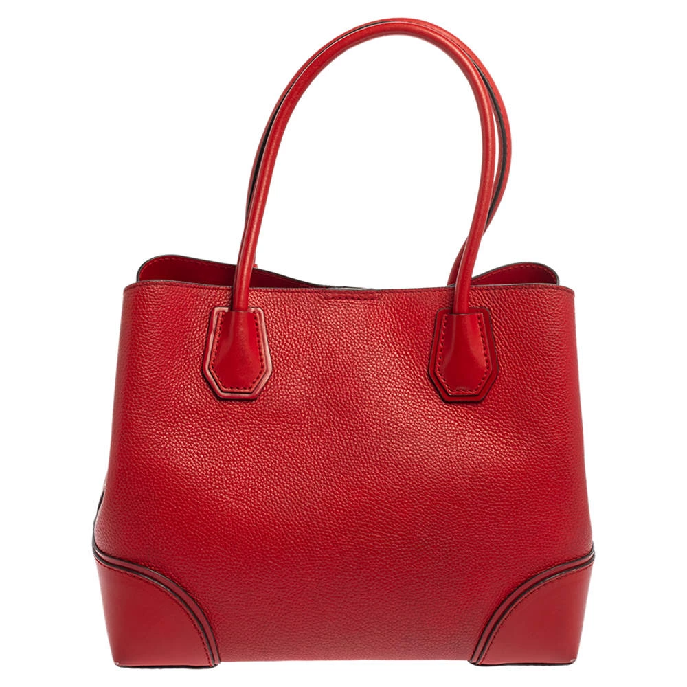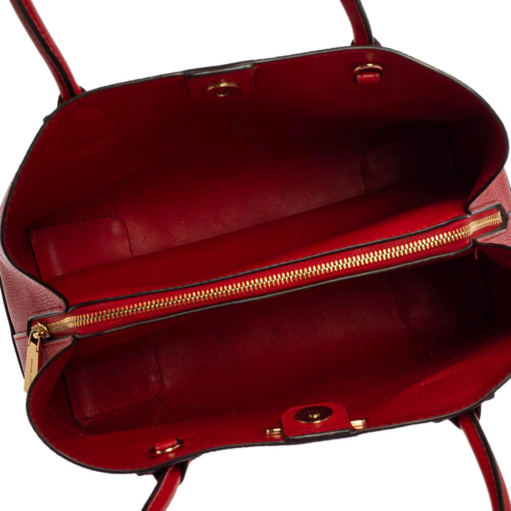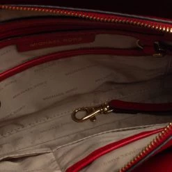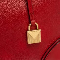 Featuring a chic and fabulous style, this Michael Kors tote is modern. Crafted from leather in stunning red, the tote features dual handles and a padlock. It opens to a spacious leather and fabric interior divided by a zipped compartment. The tote comes with protective metal feet and you are sure to love swinging this beauty.