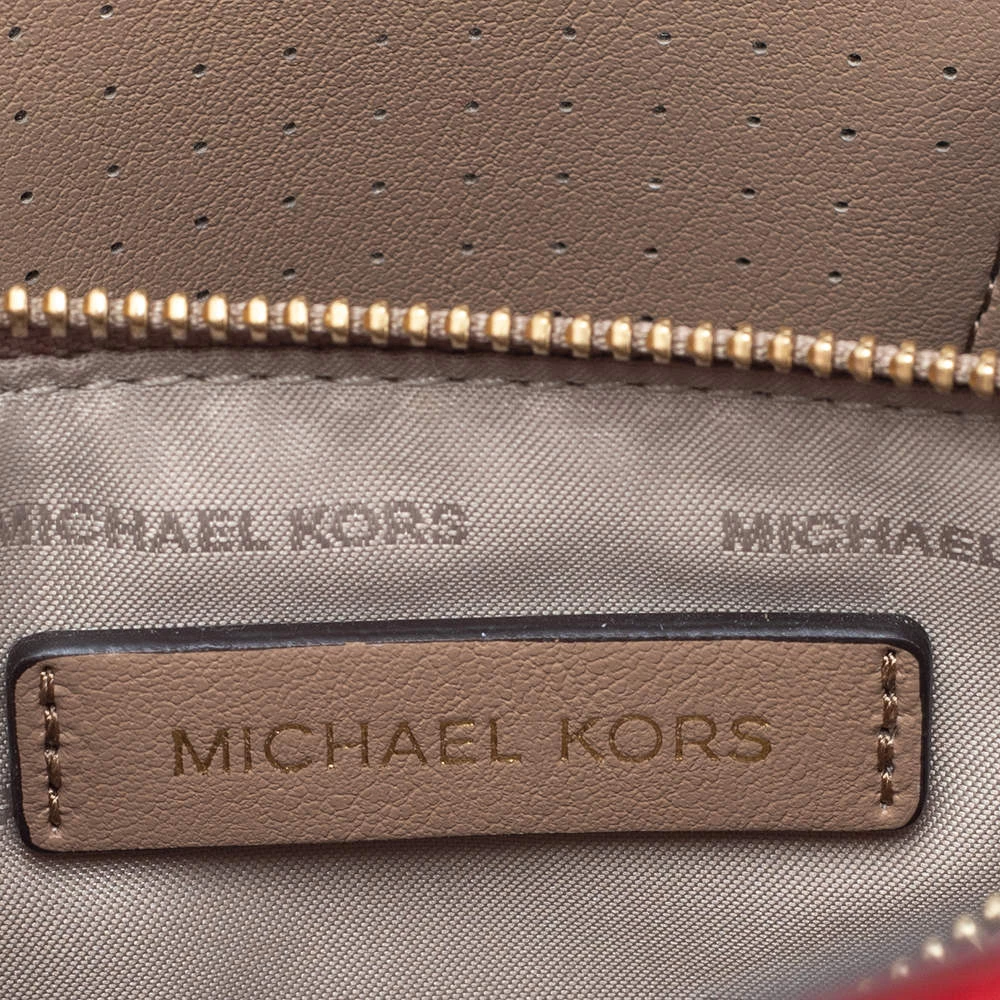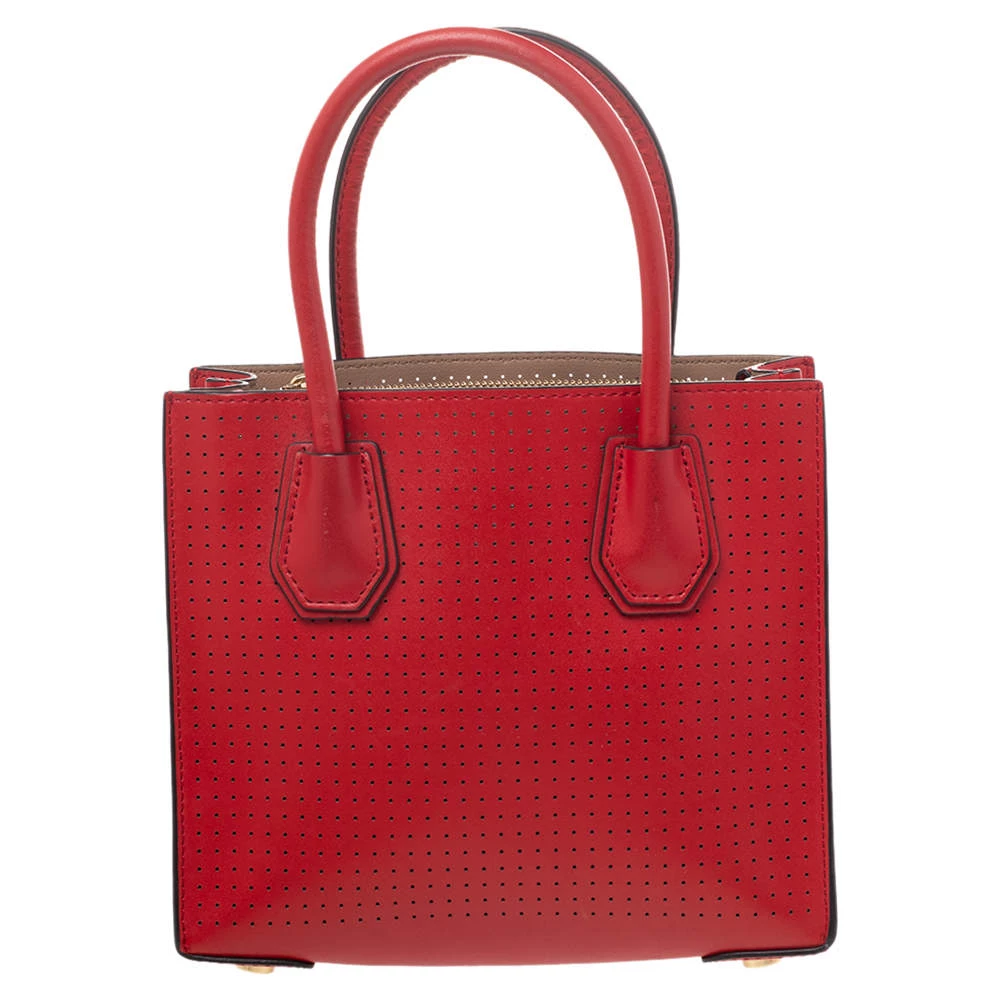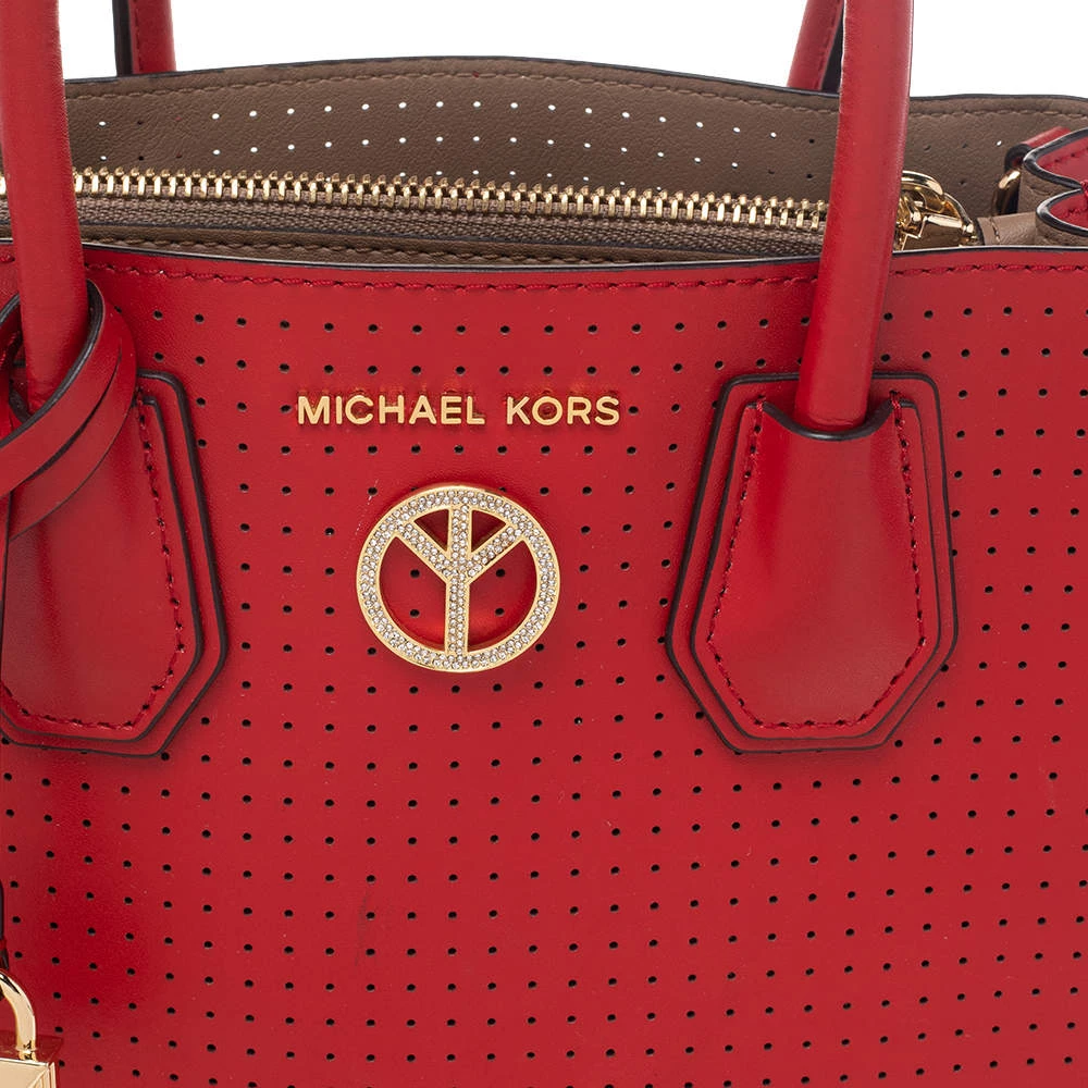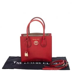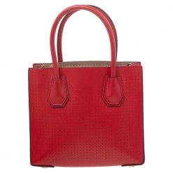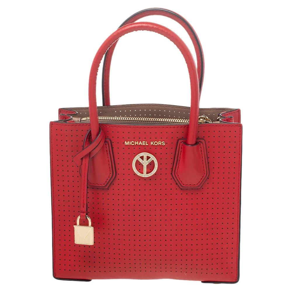 This mini Mercer tote from Michael Kors is a worthy buy! It is crafted using red perforated leather and has a spacious interior that houses two open compartments and a zipped compartment. Additionally, it is characterized by dual top handles, a shoulder strap, and a padlock charm.