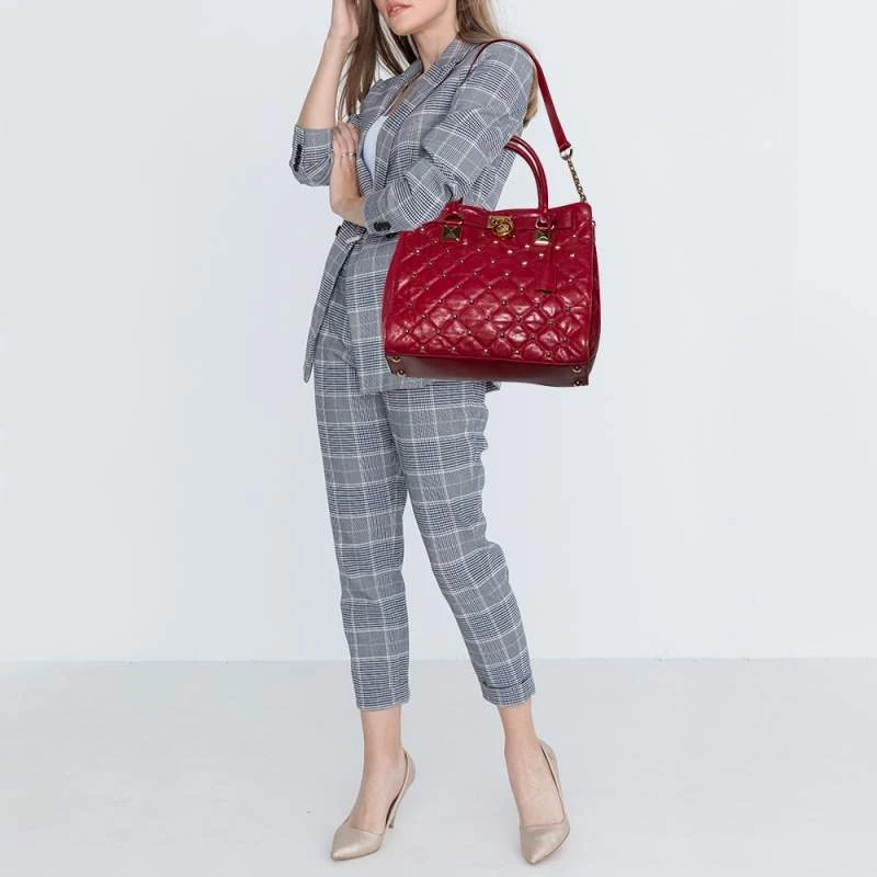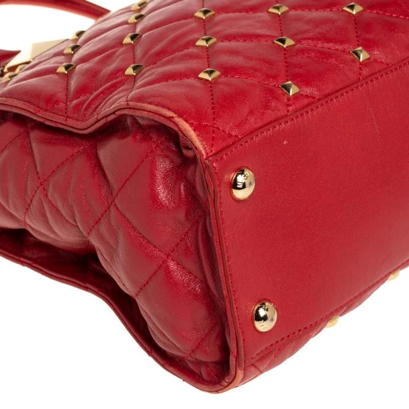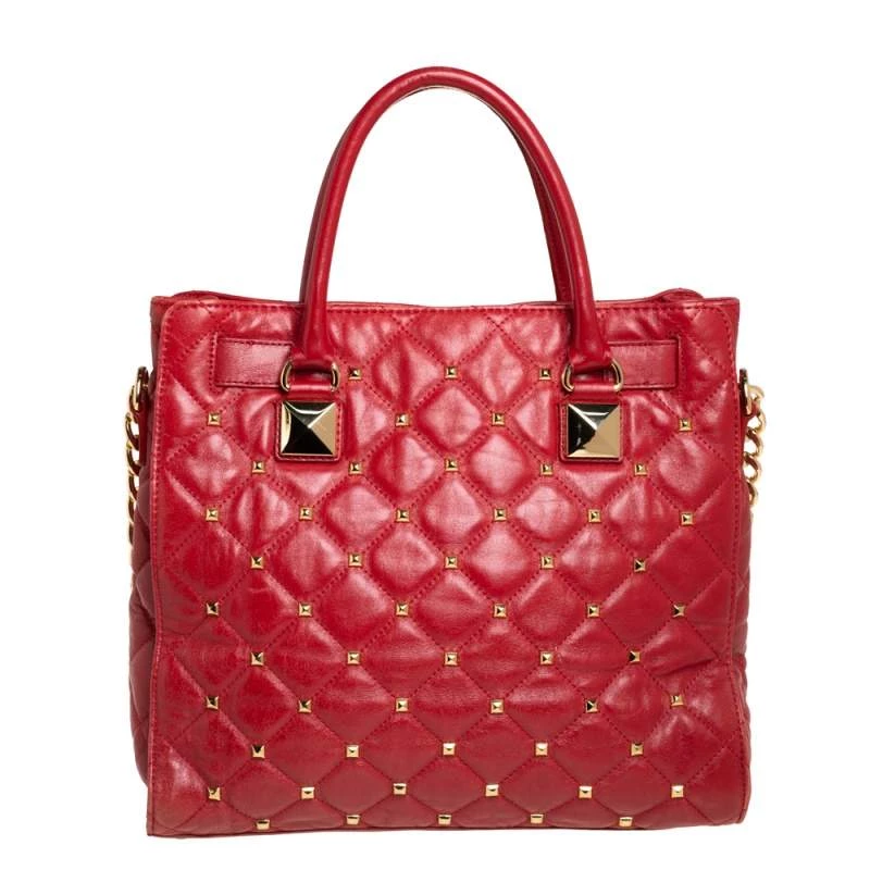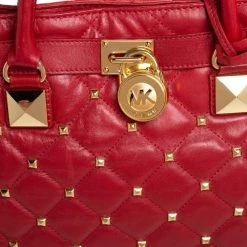 This studded Hamilton tote is from Michael Kors. It has been crafted from leather in a red shade and decorated with a gold-tone ‘MK’ padlock on the front. The bag has two handles, a shoulder strap, and a spacious fabric interior. This creation is ideal for everyday use!