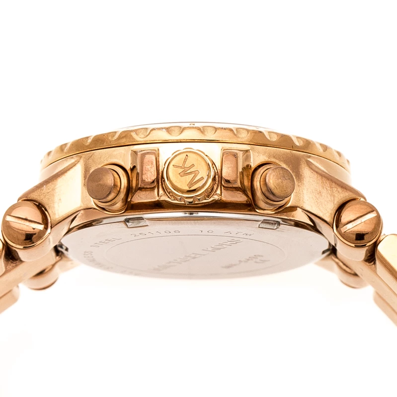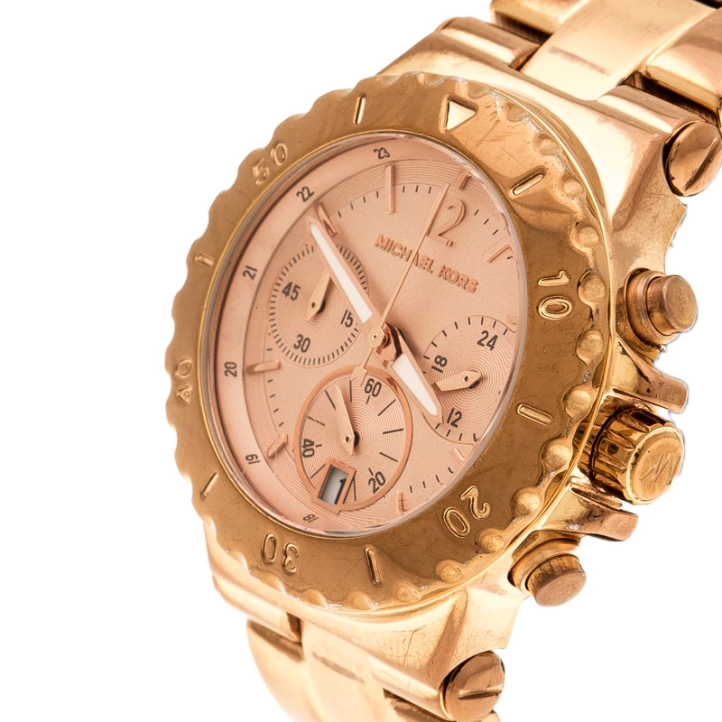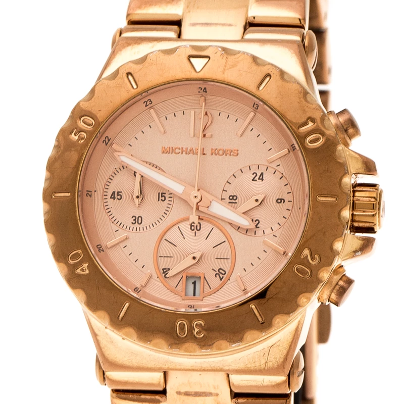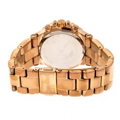Michael Kors ‘Dylan’ collection is a representation of chic and smart looks. This timepiece features a gold-plated stainless steel body with a chain link bracelet and push button closure. The dial of this watch comes with a luminous three-hand analogue display and powered by a quartz movement. It also has a date window and chronograph functionality.