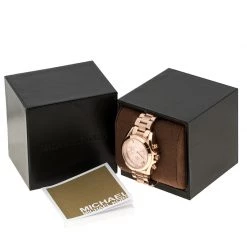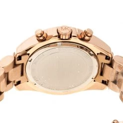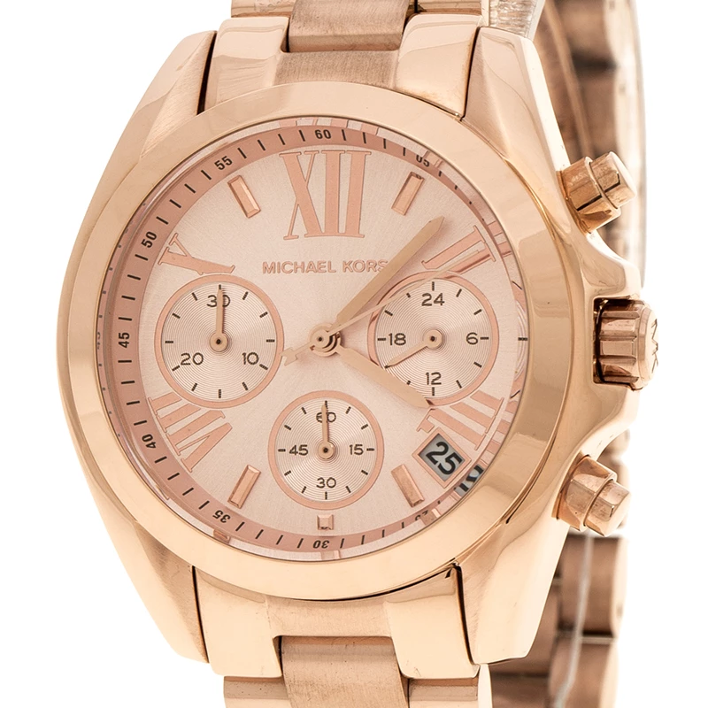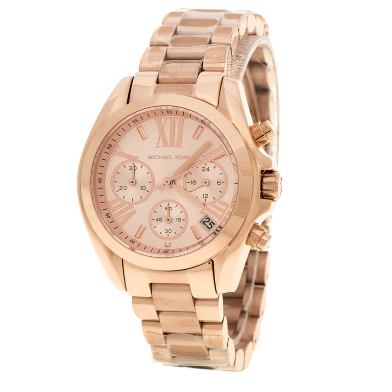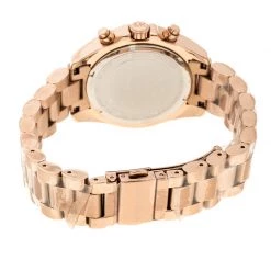 Set to shine on your wrist, this Michael Kors watch comes in a delighting gathering of the finest features. It has been wonderfully crafted from rose gold-plated steel and designed with a smooth bezel. The scratch-resistant mineral glass protects a rose dial that has Roman numeral and index hour markers and a date window. Lastly, the Chronograph creation is topped by a water resistance of 100 meters and held by a bracelet with a fold over clasp.