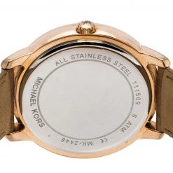 Set to shine on your wrist, this Michael Kors watch comes in a delighting gathering of the finest features. It has been wonderfully crafted from rose gold PVD coated stainless steel and designed with a crystal-decorated bezel. The scratch-resistant glass protects a round dial that has Roman numeral hour markers, a second’s subdials and crystal embellishments. Lastly, the creation is topped by a water resistance of 50 meters and held by leather straps secured with a buckle fastening.