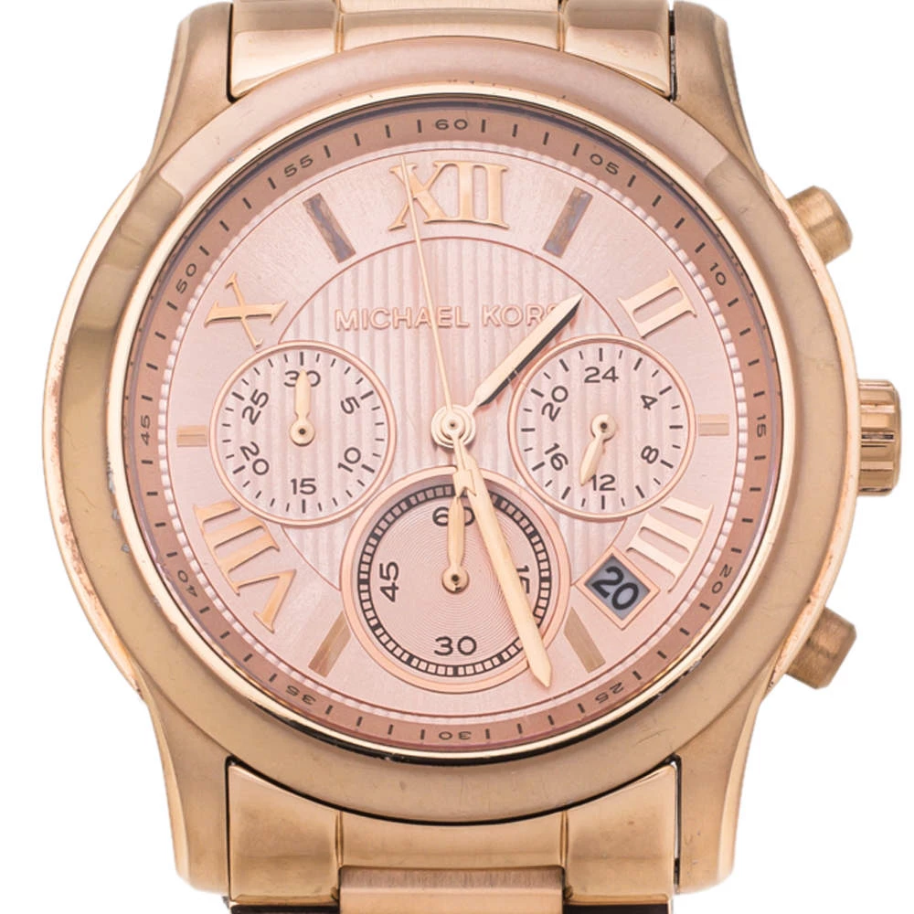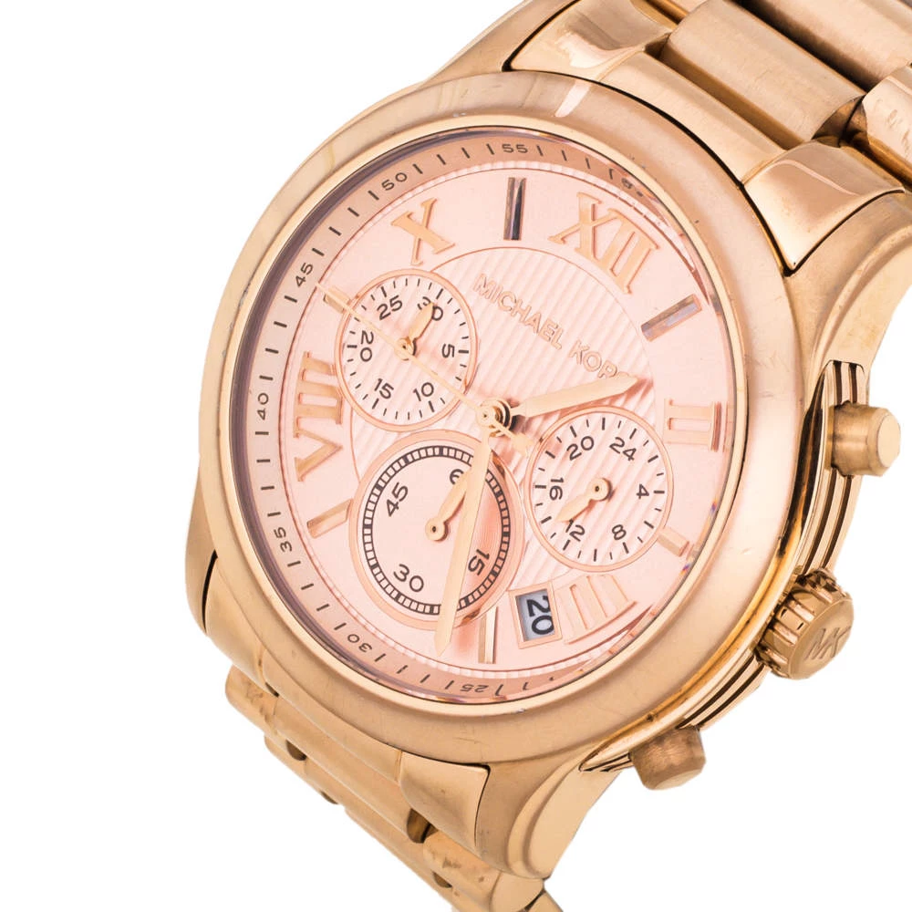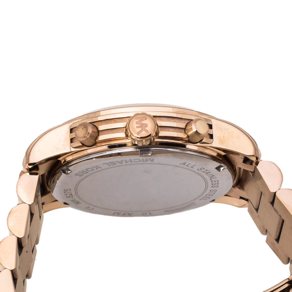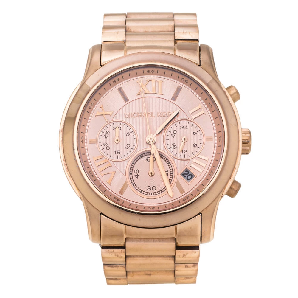 Be a proud owner of this magnificent Swiss-made creation from Michael Kors that has been made from rose gold-tone stainless steel. It comes with three sub-dials, gold-tone markers and a date window on the dial. The watch carries a smooth bezel and it is complete with a push-button clasp.