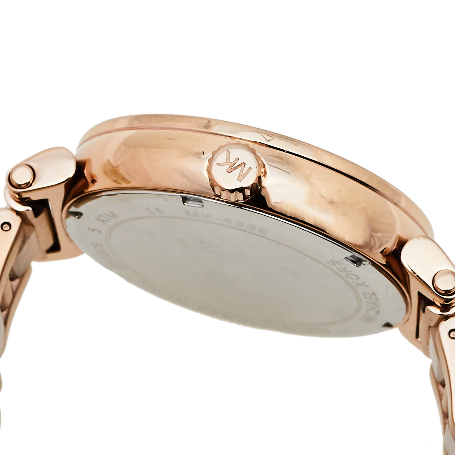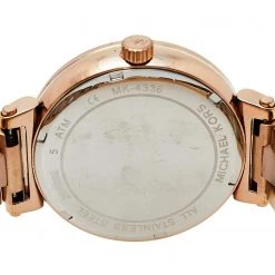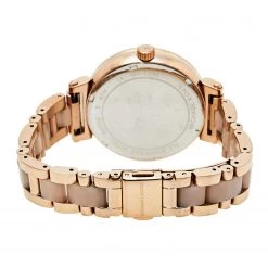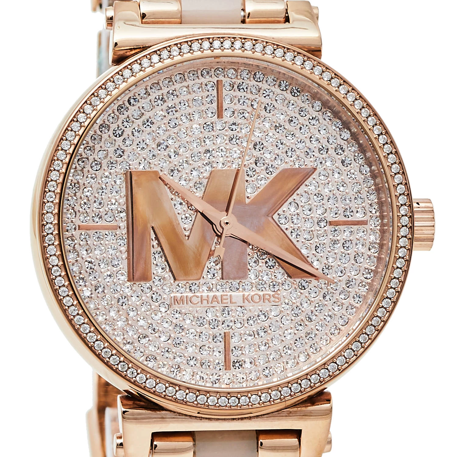 Your everyday style deserves the touch of luxury brought by this wristwatch from Michael Kors. Crafted from rose gold-tone stainless steel, the watch is set with sparkly studs on the dial and round bezel. The watch is held by a comfortable bracelet.