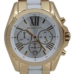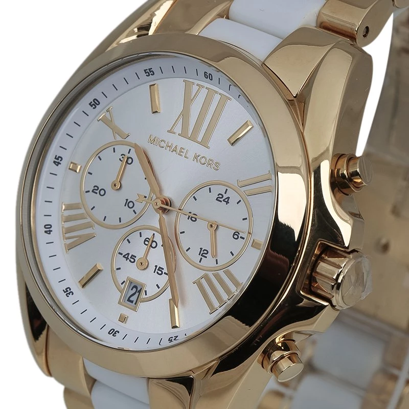 Technology meets sophisticated style with this stainless steel watch from the Bradshaw collection by Michael Kors. It is fashioned with a gold-tone fixed bezel and a white dial with gold-tone hands and alternating Roman numeral and index hour markers. Featuring high-shine acetate bracelet for modern appeal, it is finished with a fold over clasp with double push button release.