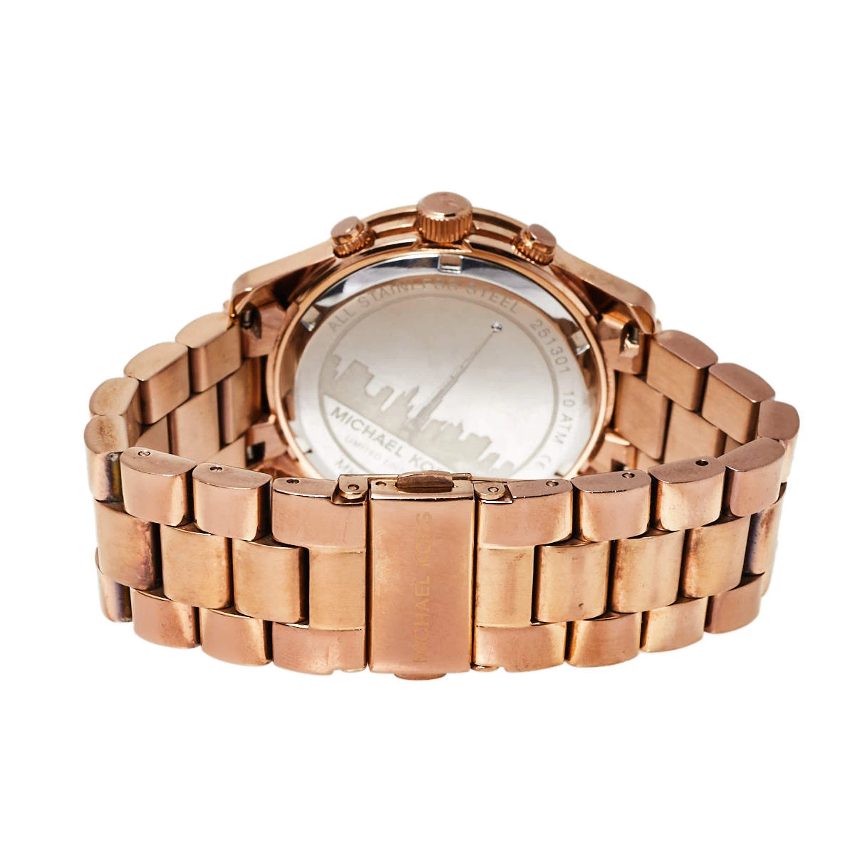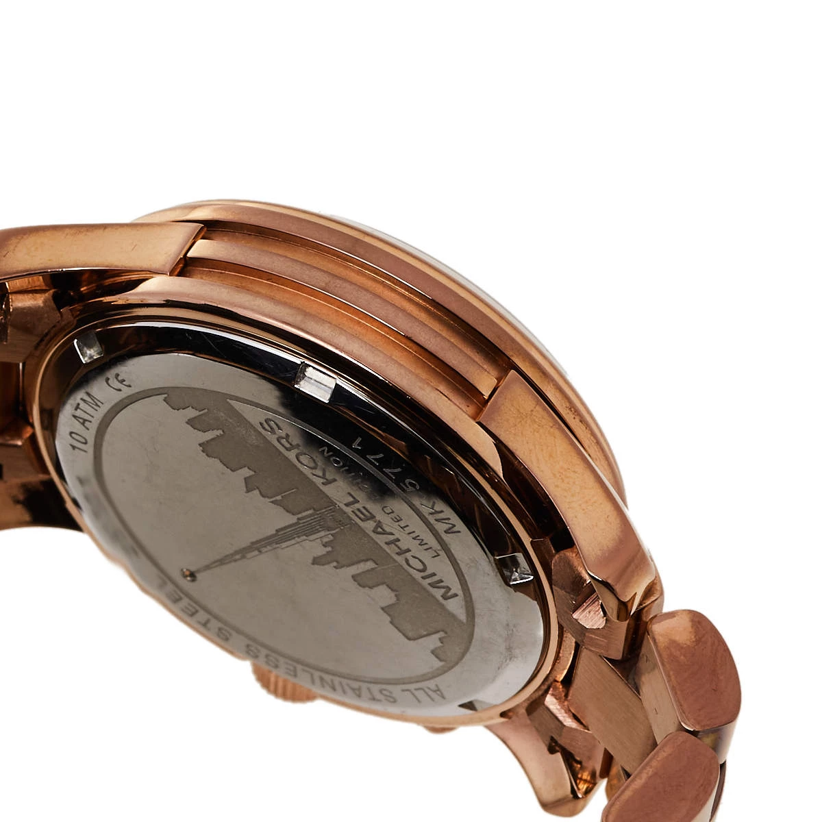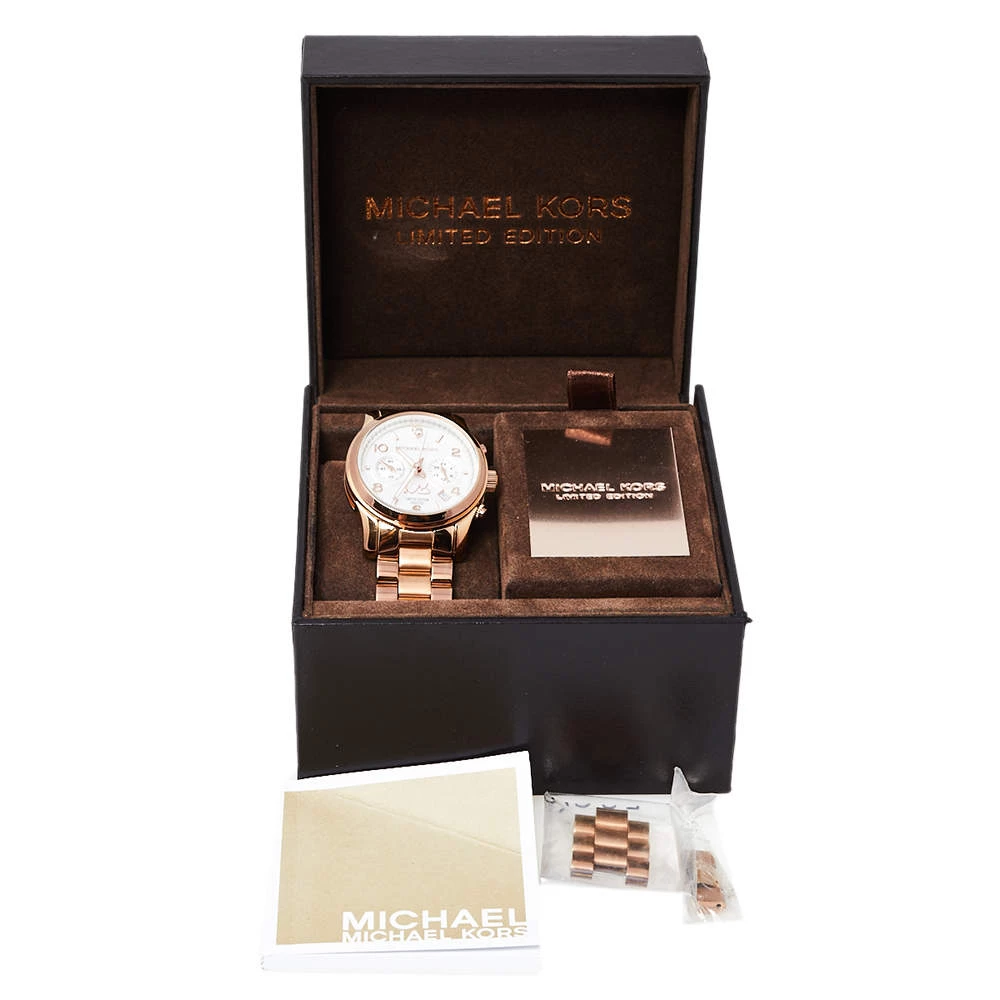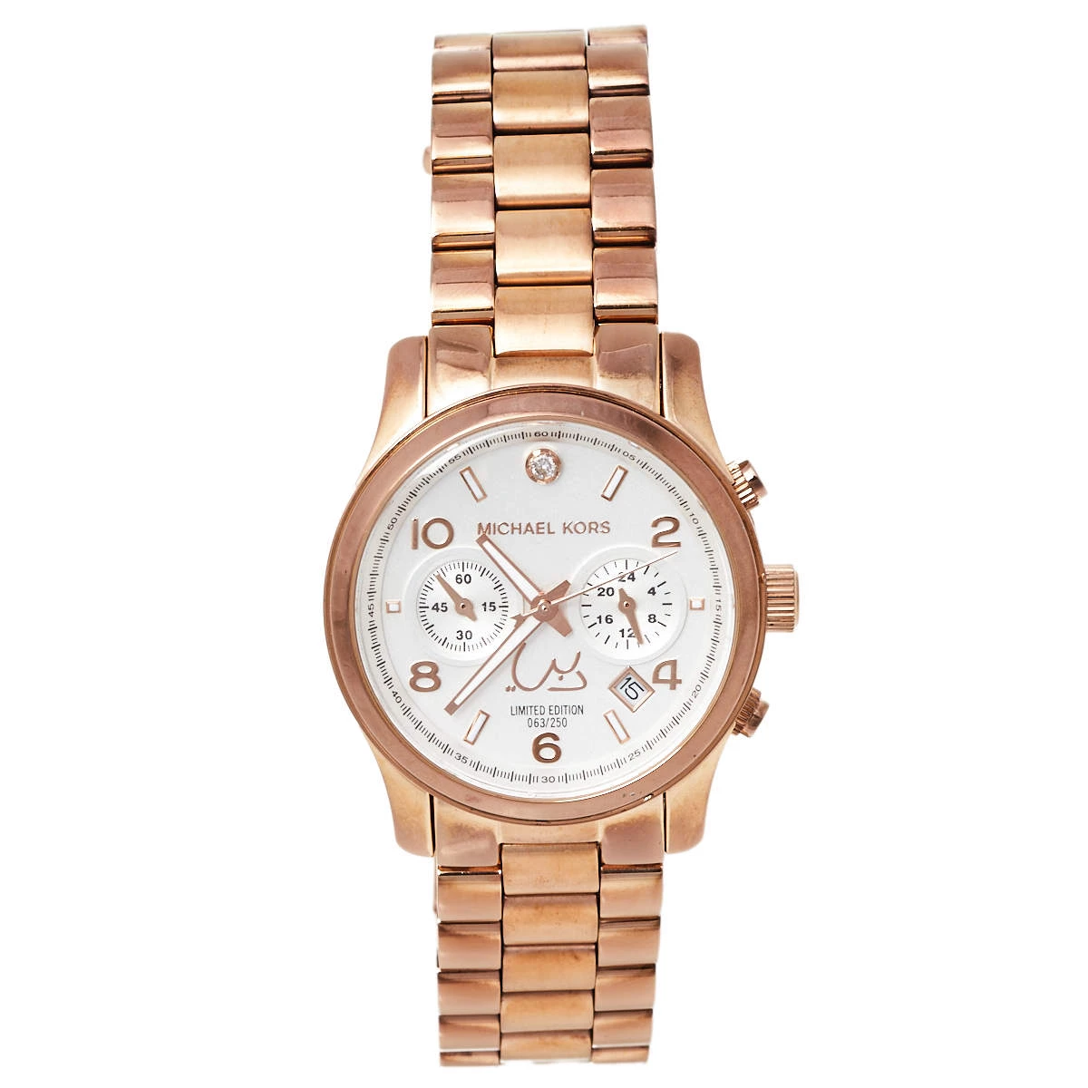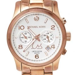 Designed with a fine blend of luxury and craftsmanship, this Runway watch from Michael Kors is sure to delight your style. Made from gold-plated stainless steel, it’s a limited edition piece with a silver dial with a date window, a diamond at 12 o’clock, and three sub-dials. The smooth bezel, 100 meters of water resistance, the Dubai skyline engravings at the case back, and push-button clasp make the quartz timepiece ready to be yours.