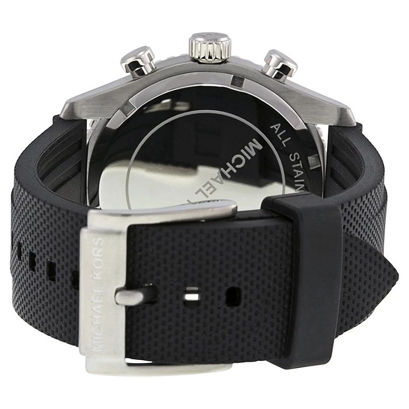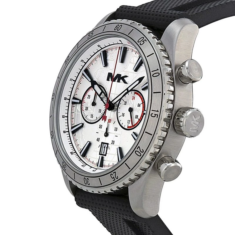 This Richardson MK8353 by Michael Kors is sophisticated and youthful. Made from stainless steel, its case holds a round black bezel with a tachymeter and black indicators with Arabic numerals. Its white dial is designed with luminous hands and hour indicators, coupled with matching minute and second indexes, chronometers, and a date window. This 50M water resistant watch is finished to perfection with its rubber bracelets that features a pin buckle closure.