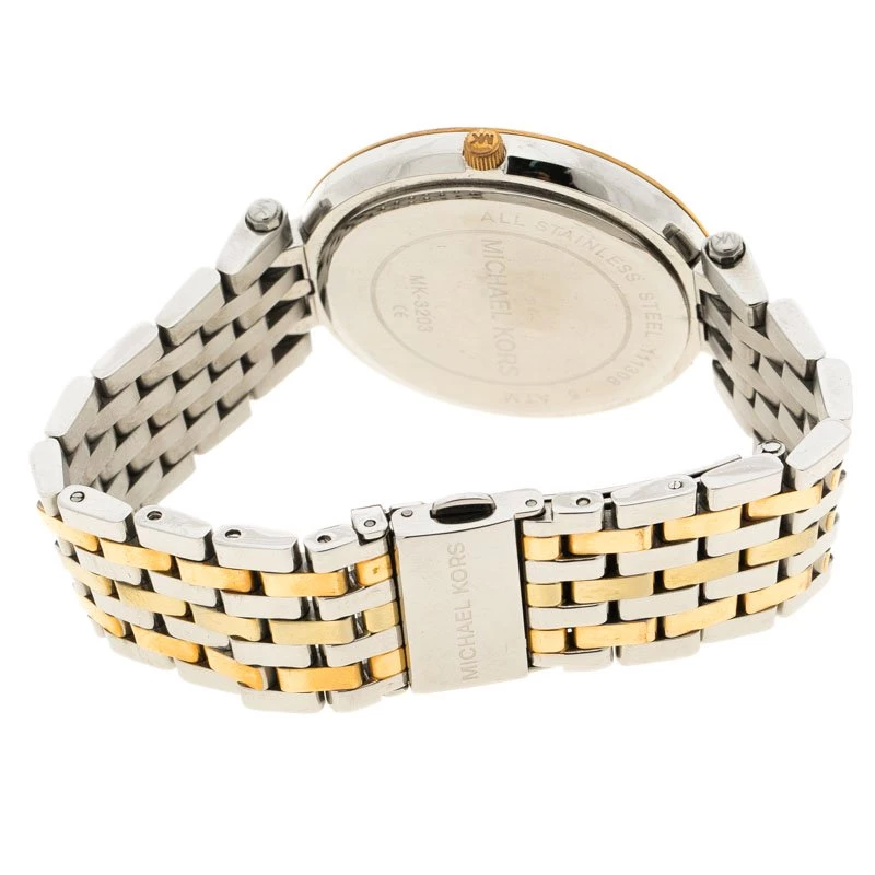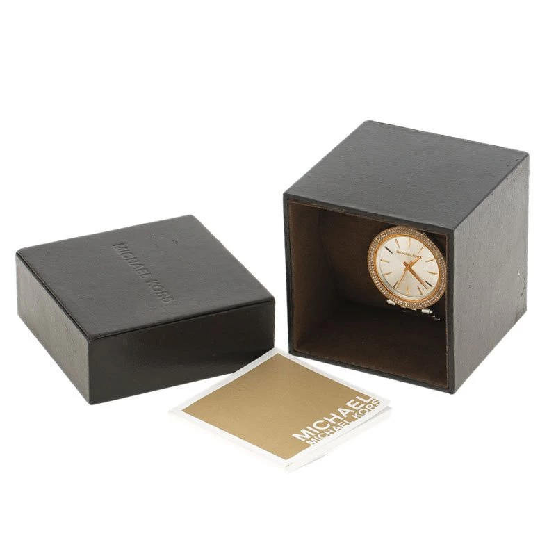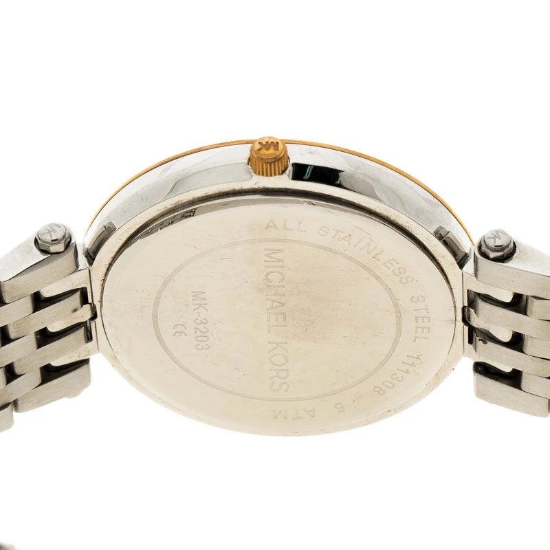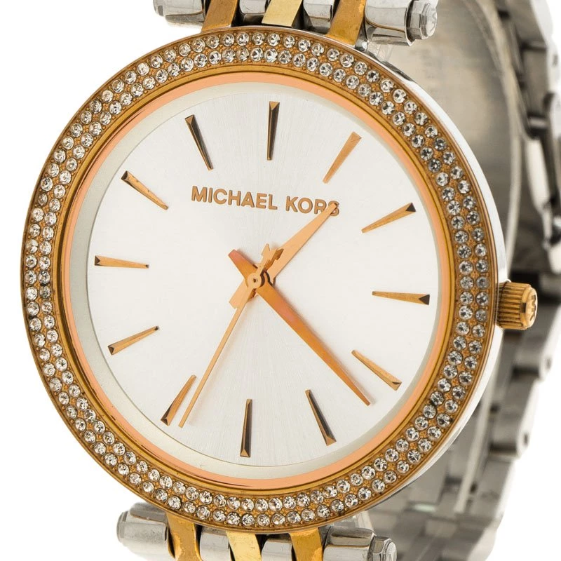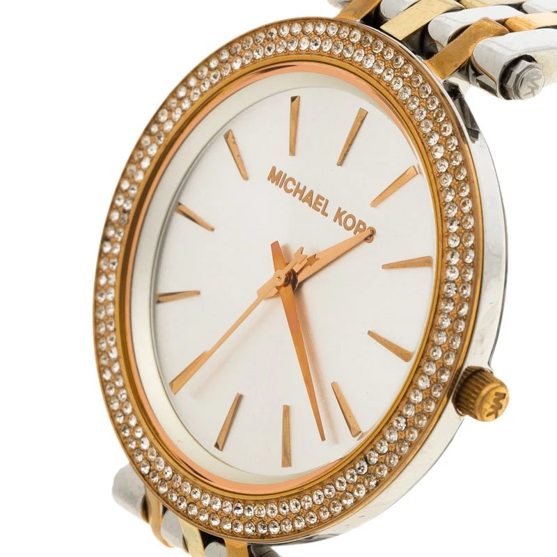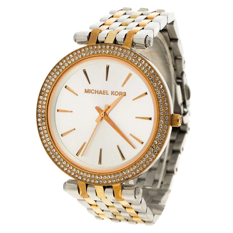 The Darci wristwatch from the house of Michael Kors is a classic piece to add to your collection. Featuring a silver body with rose gold accents, this watch comes with a big rounded white dial. It features golden hands and markers. With diamond embellishment all around the bezel, this stunning piece will go well with all your gaudy, evening outfits.