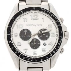 Set to shine on your wrist, this Michael Kors watch comes in a delighting gathering of the finest features. It has been wonderfully crafted from stainless steel and designed with a black bezel. The scratch-resistant mineral glass protects a silver dial that has Arabic numeral hour markers, three subdials and a date window. Lastly, the Chronograph creation is topped by a water resistance of 100 meters and held by a bracelet with push-button clasp.
