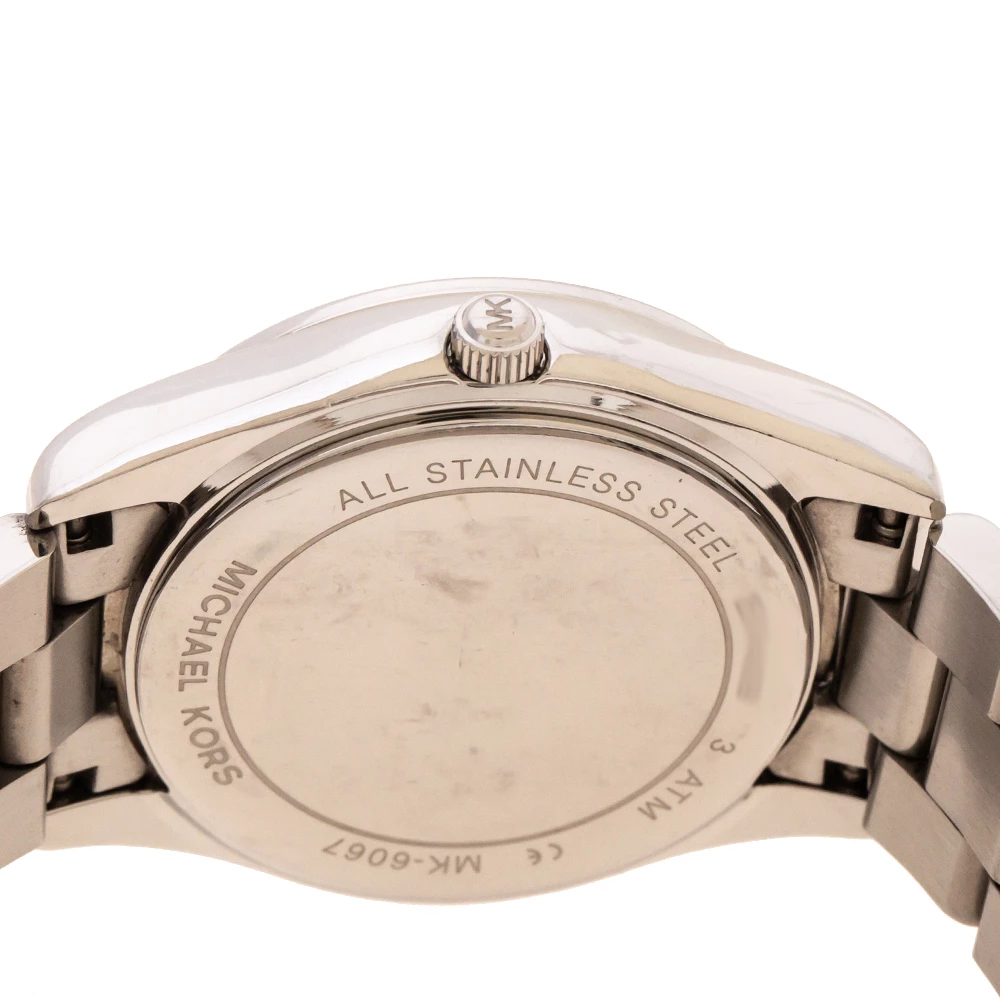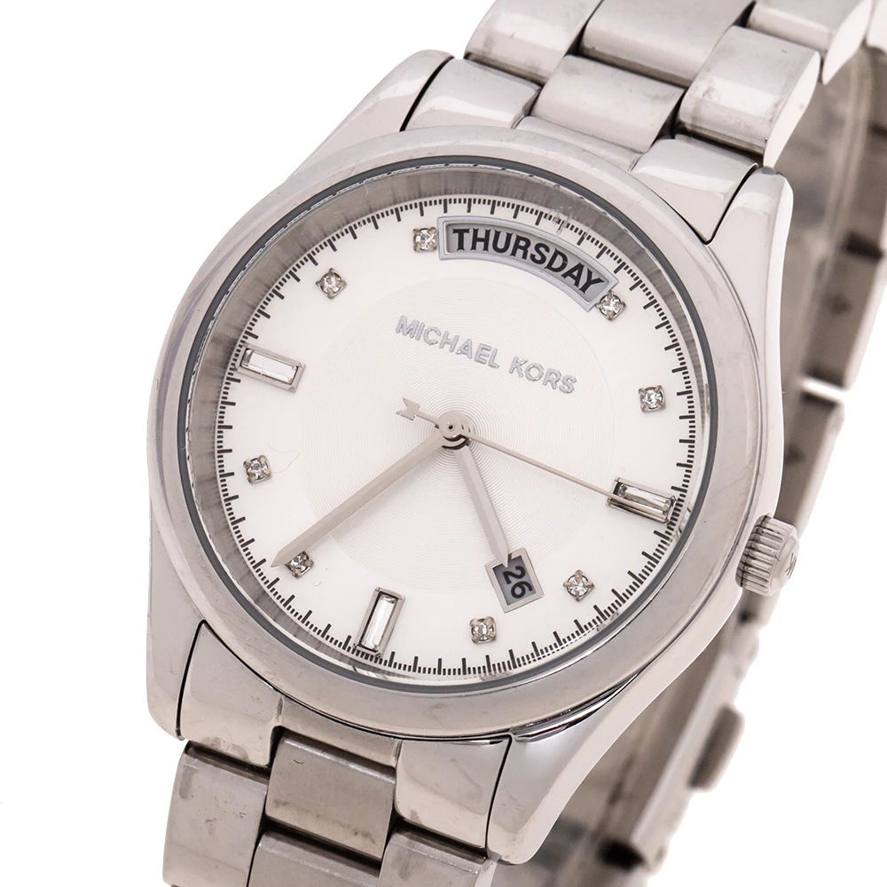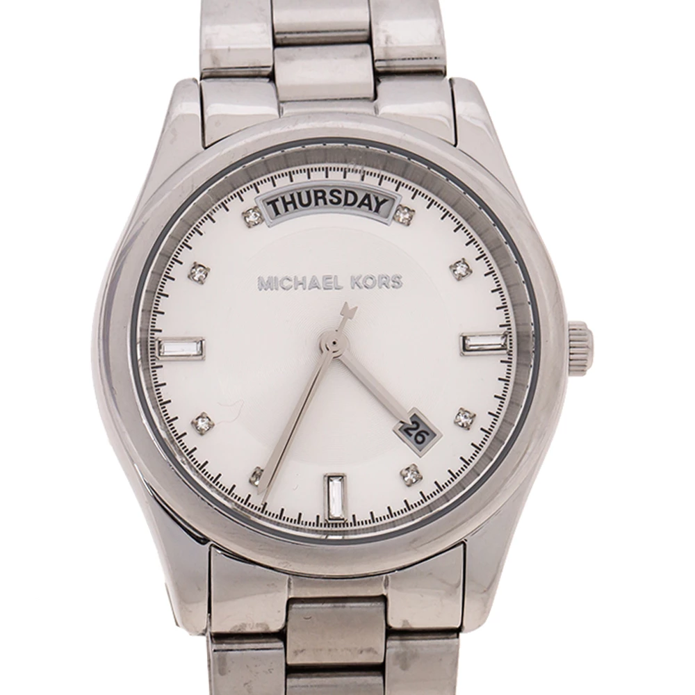 Awaiting to be yours is this stunner of a watch from Michael Kors! Crafted with beauty using stainless steel, the quartz watch is lovely. It brings a silver dial that has a date and a day window along with crystal stud hour markers. Complete with a water resistance of 30 meters and a deployment clasp, this gorgeous watch is a creation you will love to flaunt.