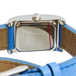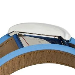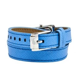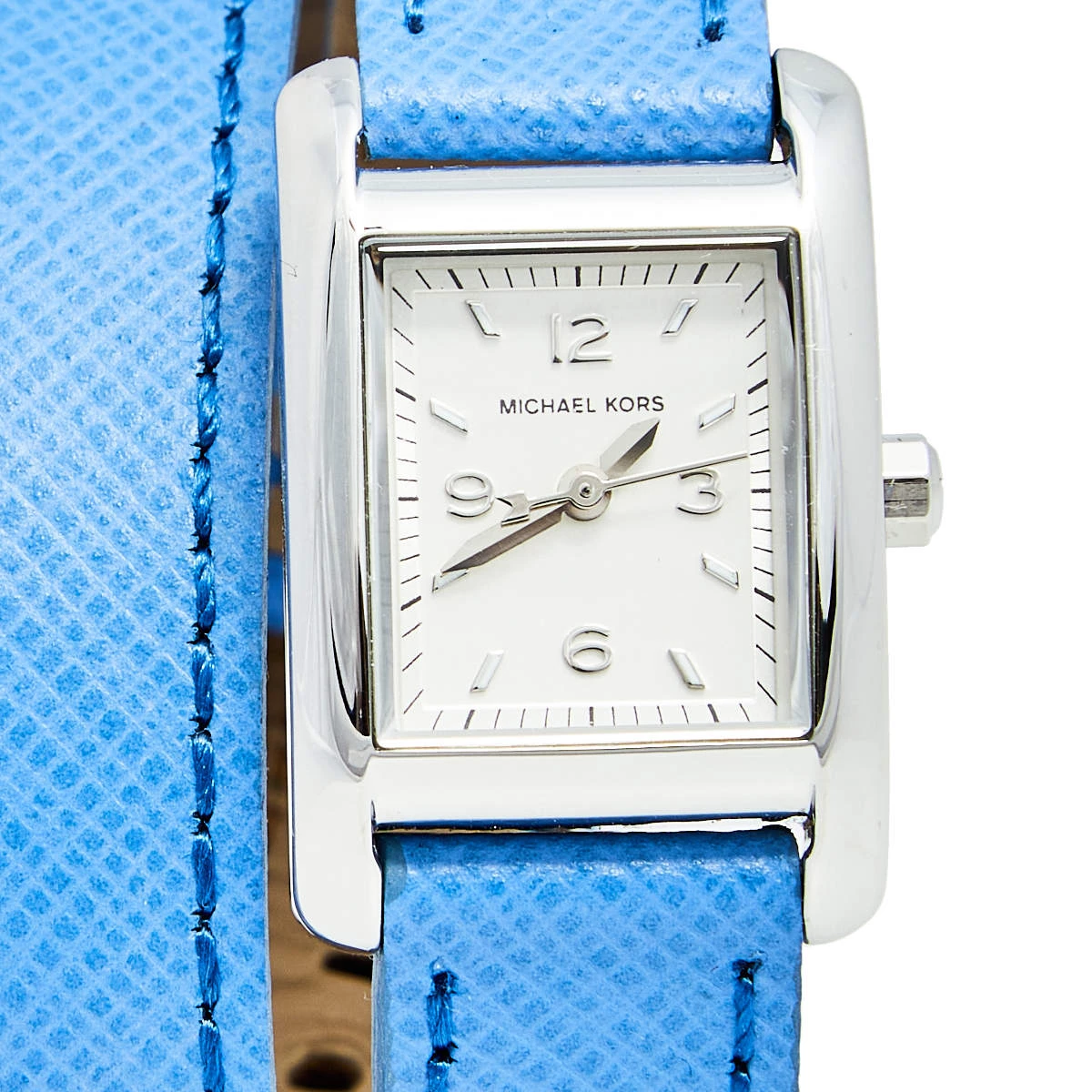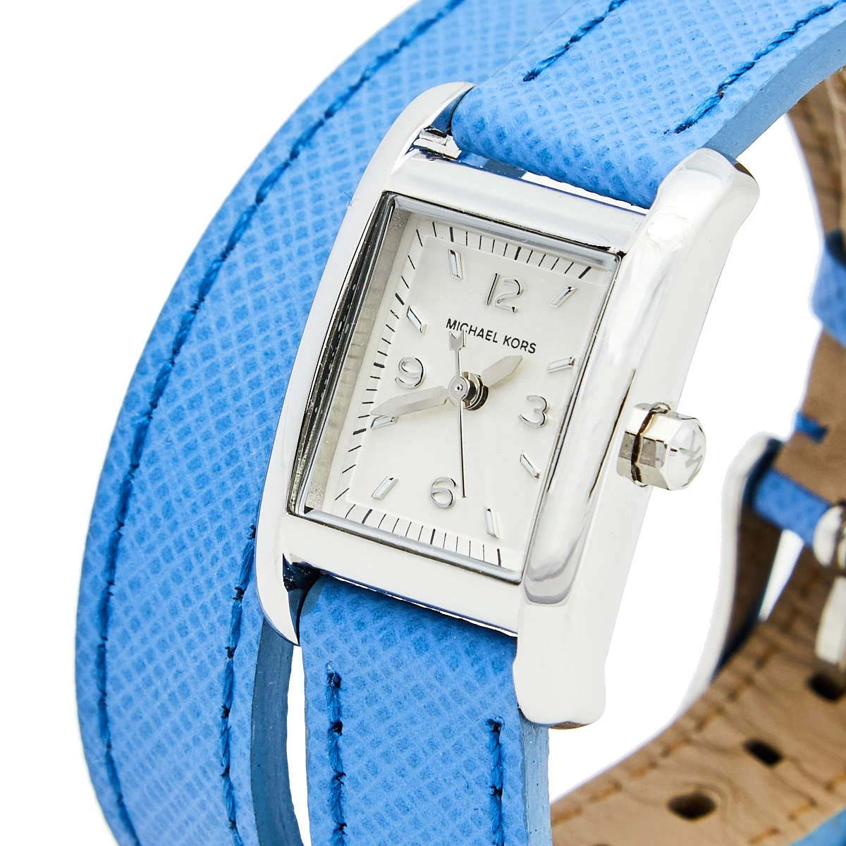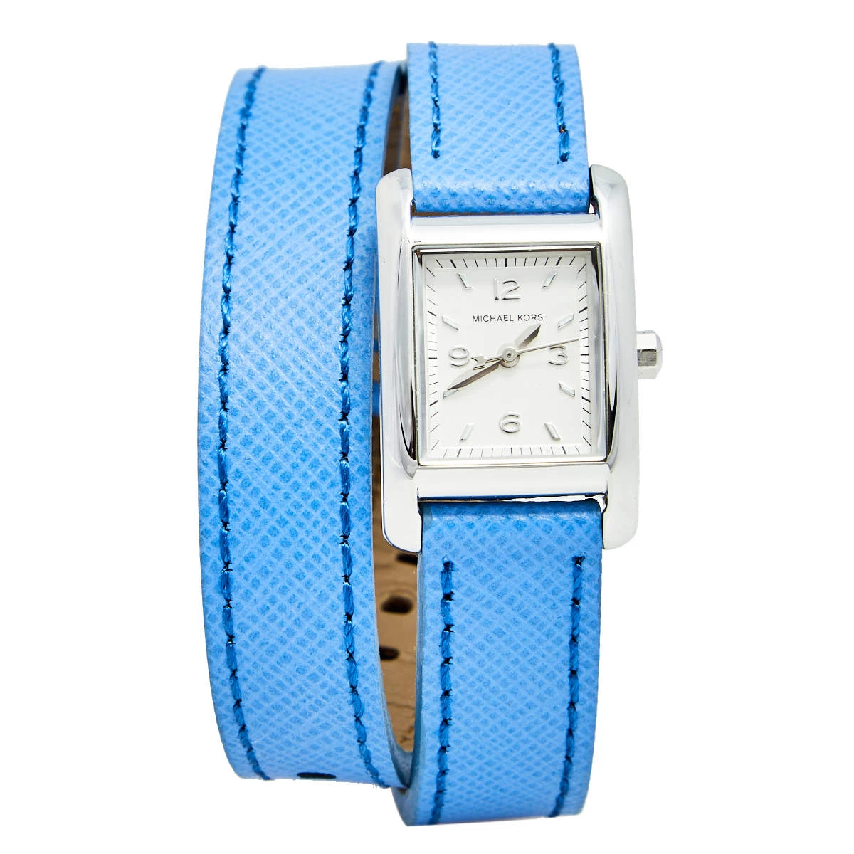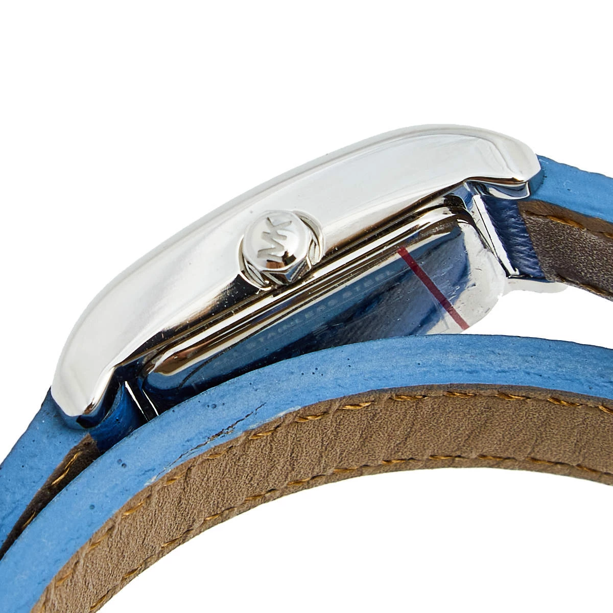 A double-wrap blue leather strap elevates this simple MK watch into a fashionable accessory. The case is made of stainless steel and it has a silver dial featuring elegant markers and three hands.