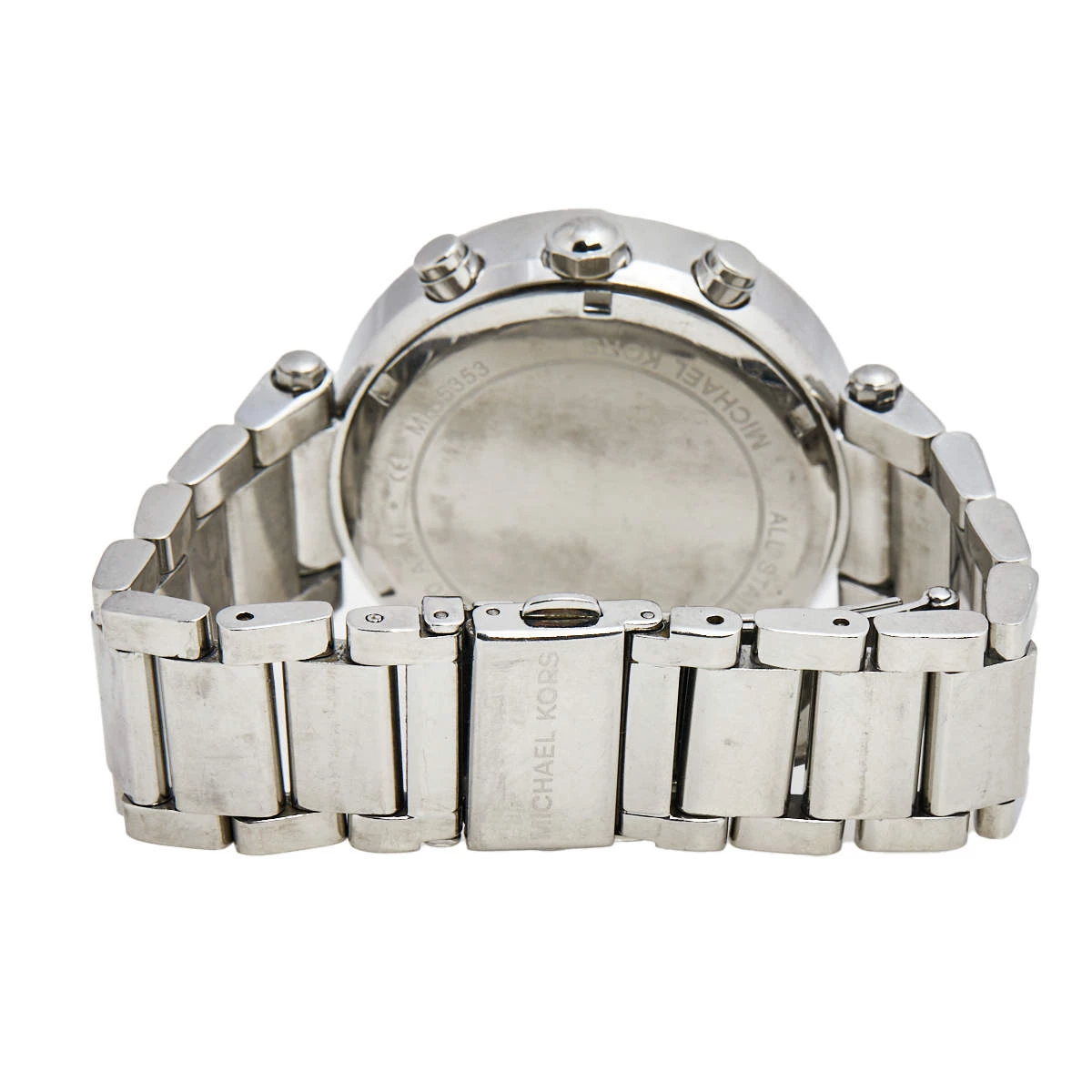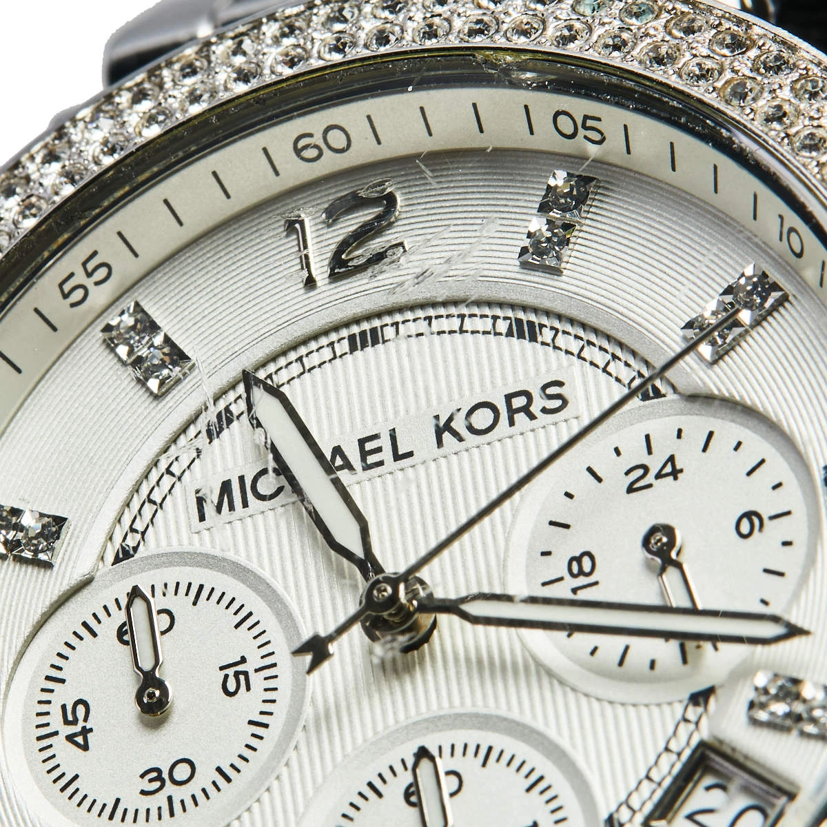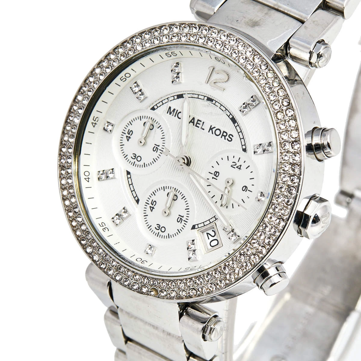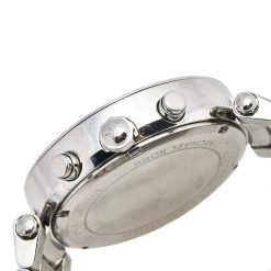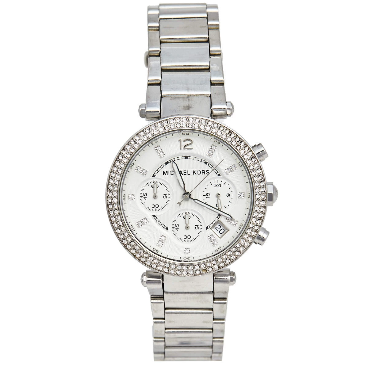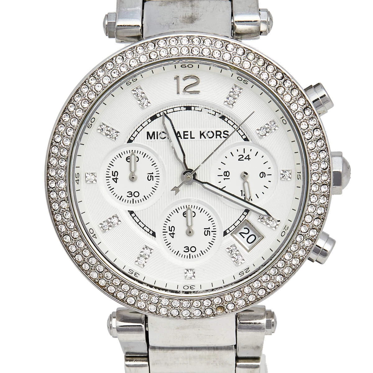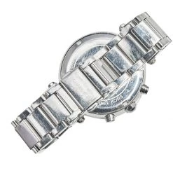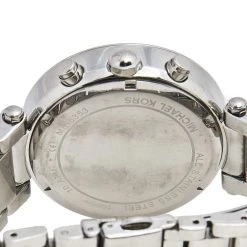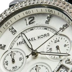 This Michael Kors watch is set to shine on your wrist. It has been wonderfully crafted from stainless steel and designed with two rows of crystals on the bezel. The glass protects a silver dial that has elegant hour markers, three subdials, a date window, and three hands. Lastly, the creation has a water resistance of 100 meters and is held by a bracelet with a push-button release.