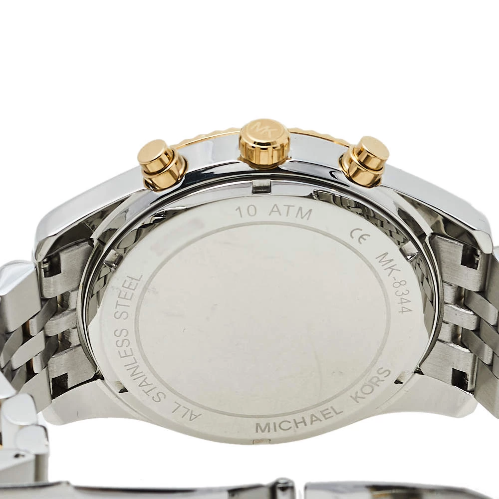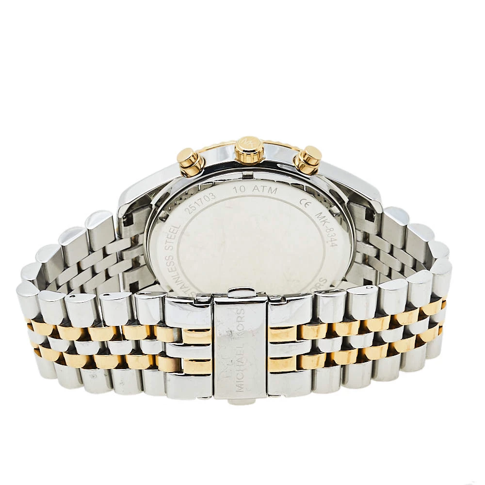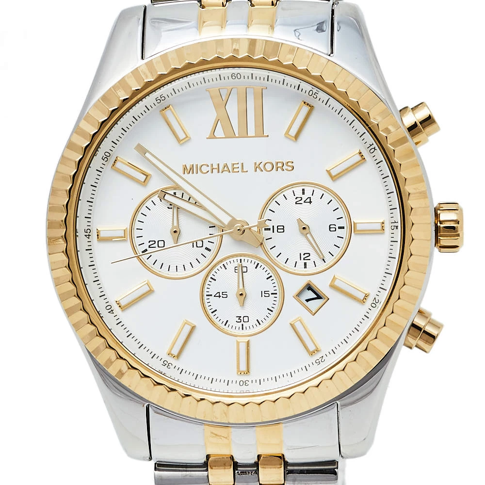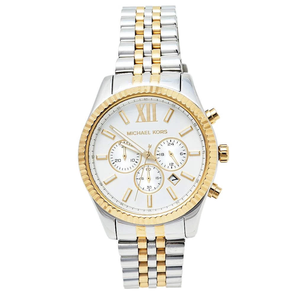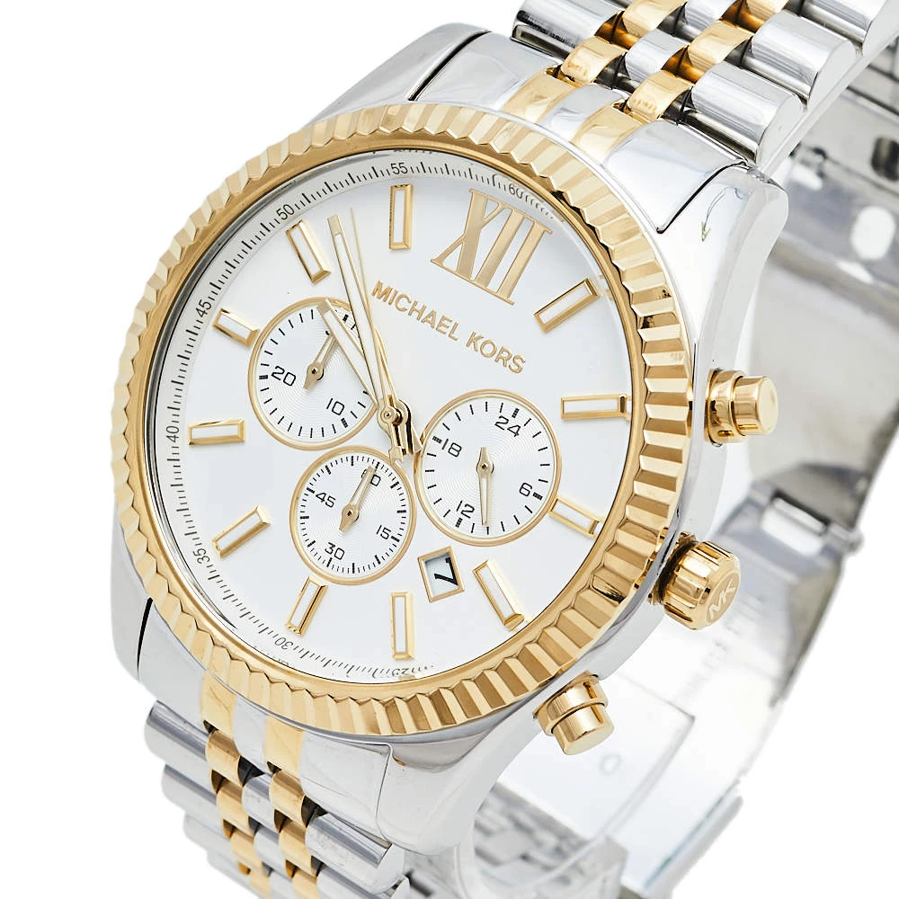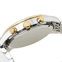 The Michael Kors Lexington watch brings forth a sleek design to suit a man’s everyday style or special looks. Crafted from two-tone stainless steel, the quartz watch has a silver dial housing elegant hour markers, three subdials, and a date window between the 4 and 5 o’clock positions. The watch is water-resistant up to 100 meters and it is held by a bracelet with a push-button release.