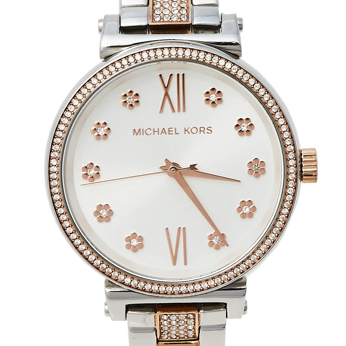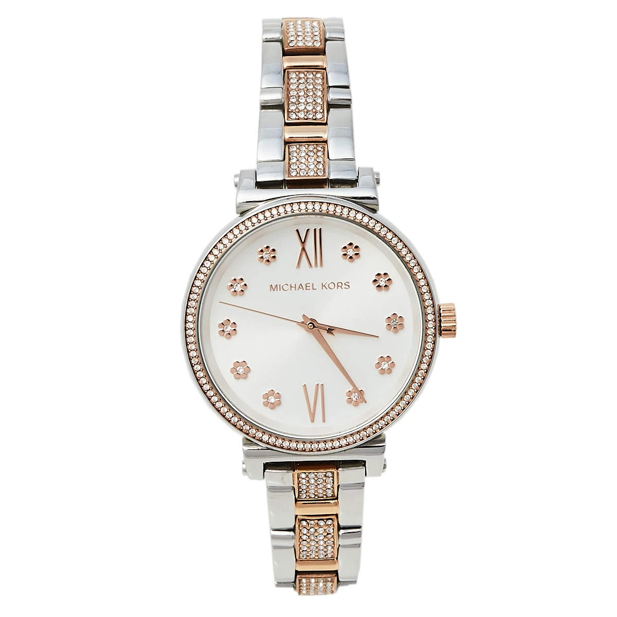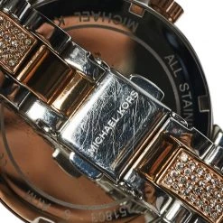 Your everyday style deserves the touch of luxury brought by this wristwatch from Michael Kors. Crafted from two-tone stainless steel, the watch is set with sparkly crystals on the dial, round bezel, and bracelet.