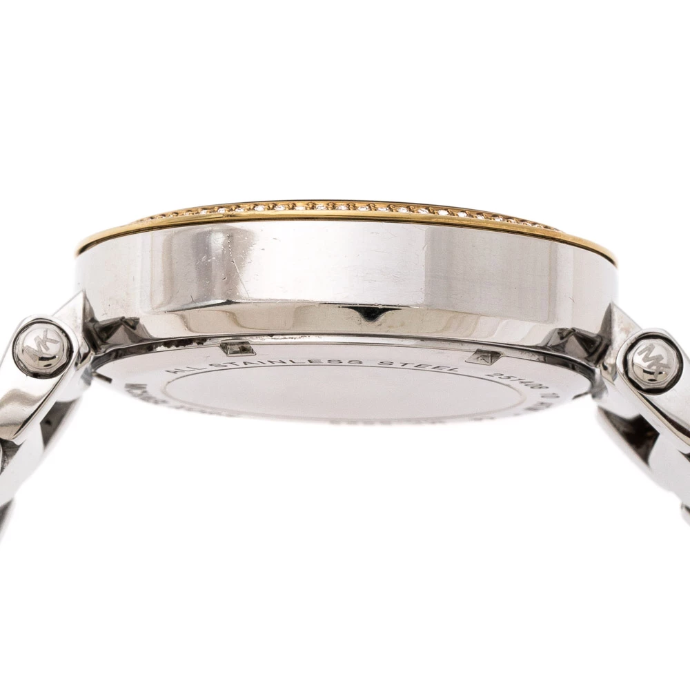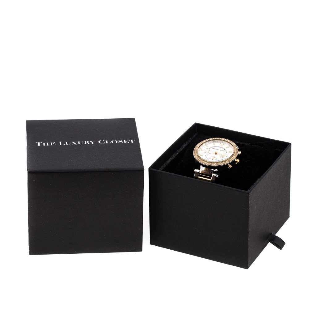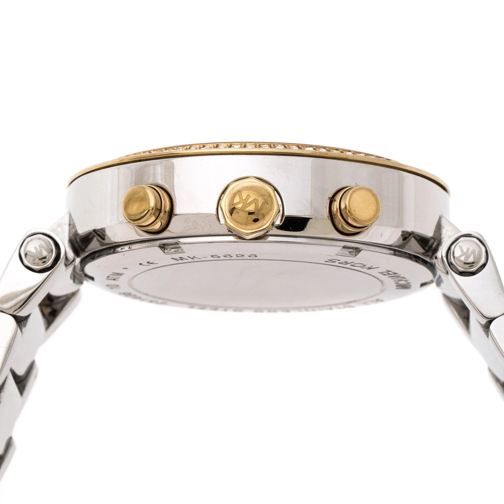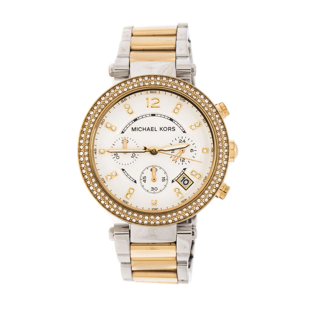 Set to shine on your wrist, this Michael Kors watch comes in a delighting gathering of the finest features. It has been wonderfully crafted from two-tone stainless steel and designed with a bezel decorated with crystals. The scratch-resistant mineral glass protects a silver-white dial that has crystal hour markers, three subdials and a date window. Lastly, the creation is topped by a water resistance of 100 meters and held by a bracelet with a push-button release.
