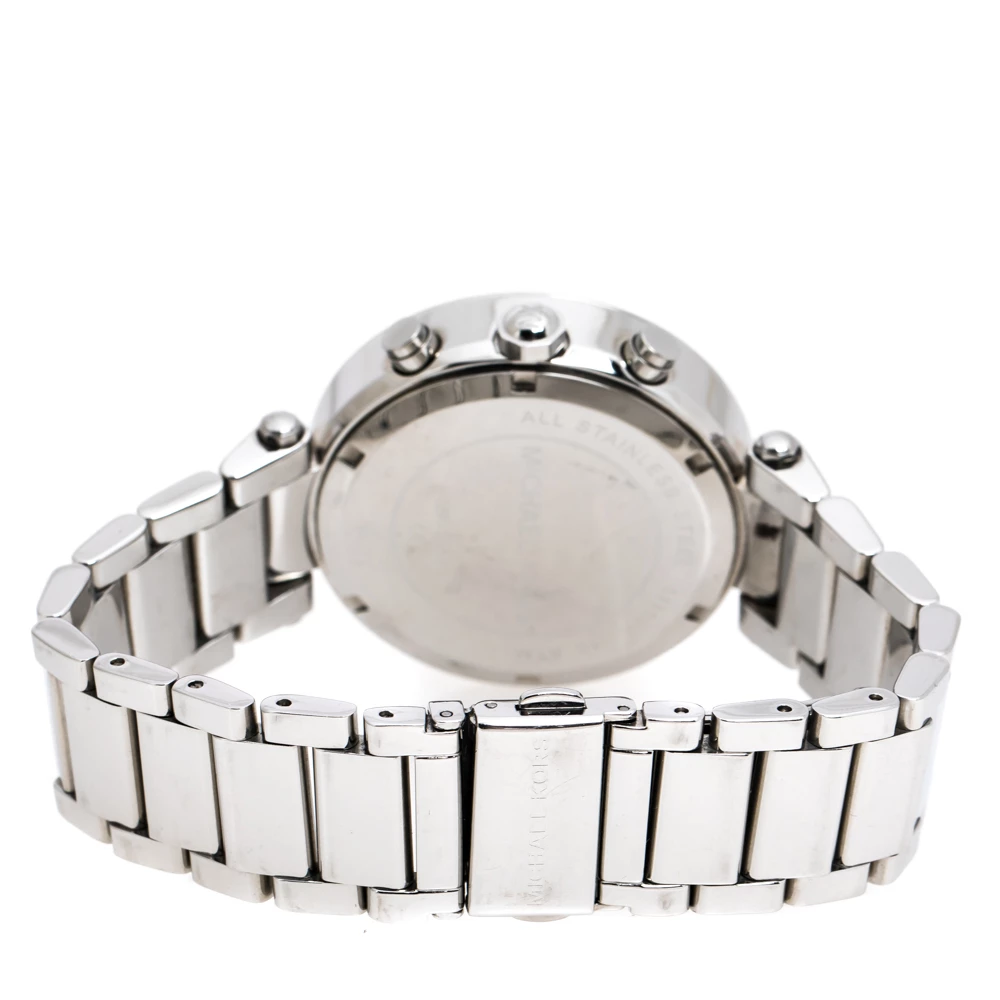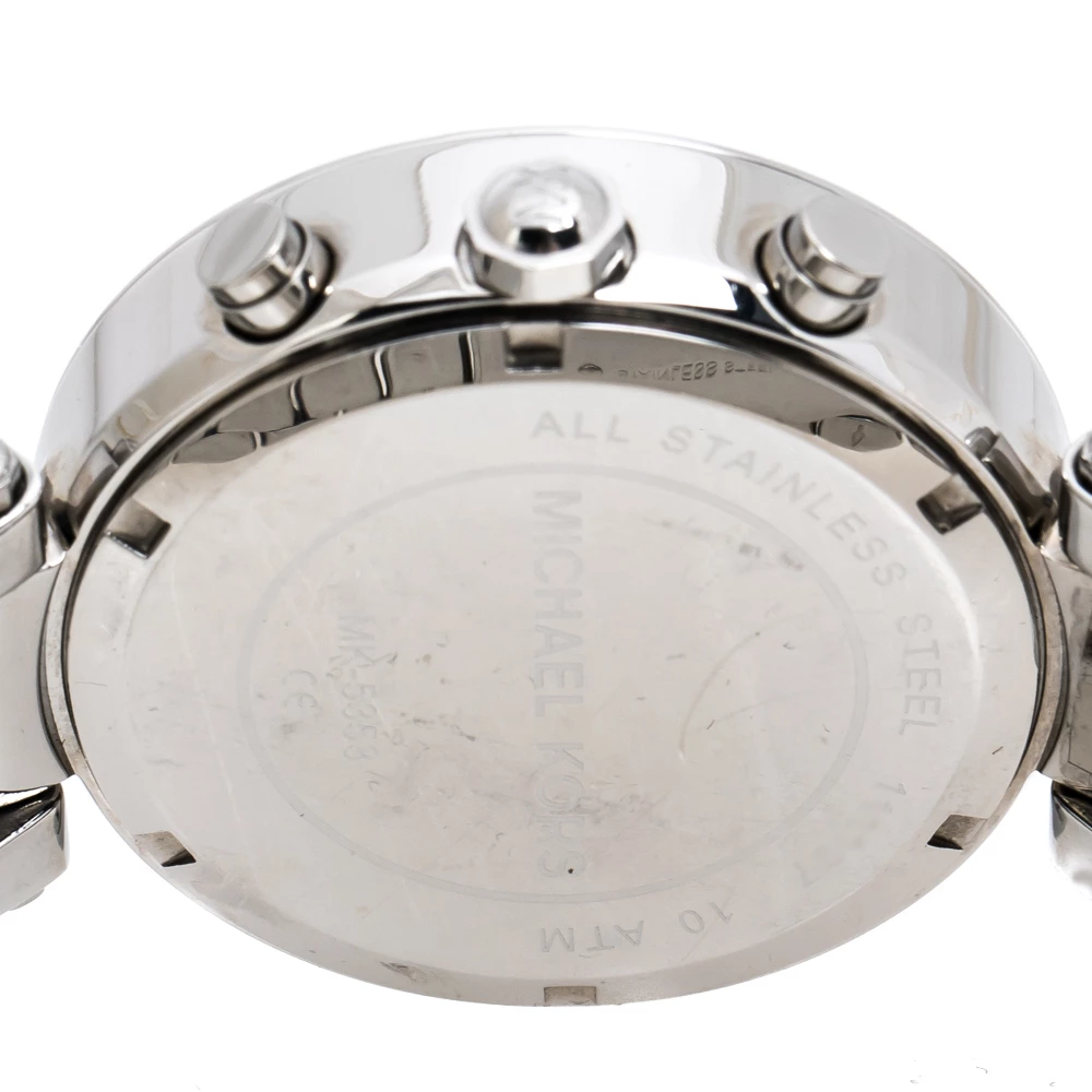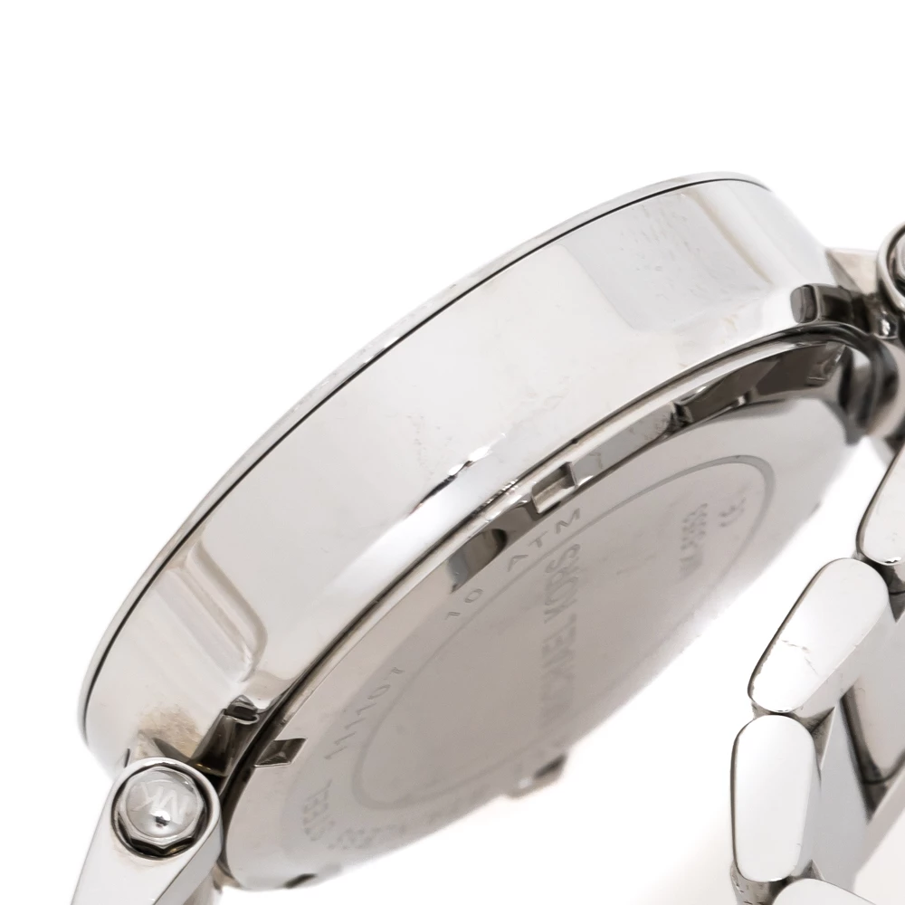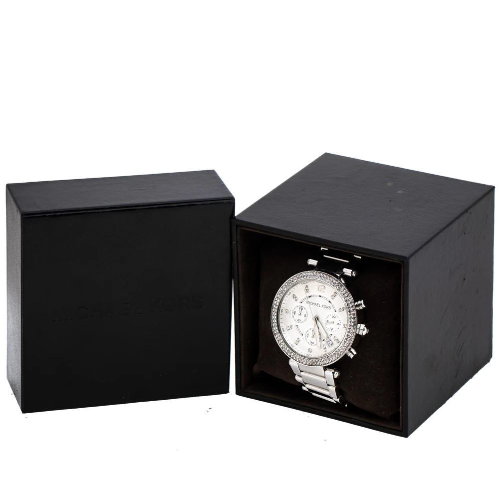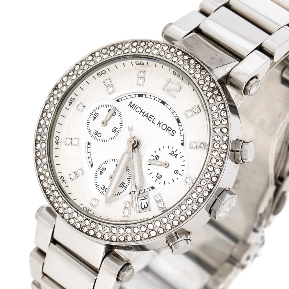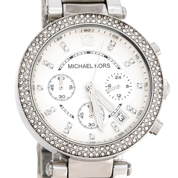 Set to shine on your wrist, this Michael Kors watch comes in a delighting gathering of the finest features. It has been wonderfully crafted from stainless steel and designed with a bezel decorated with crystals. The scratch-resistant mineral glass protects a silver dial that has crystal hour markers, a date window and three subdials. Lastly, the creation is topped by a water resistance of 100 meters and held by a bracelet with a push-button release.