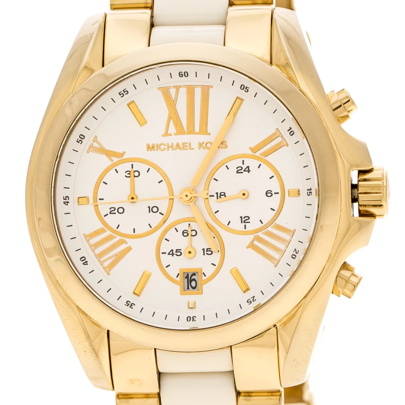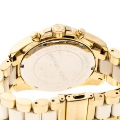 Set to shine on your wrist, this Michael Kors watch comes in a delighting gathering of the finest features. It has been wonderfully crafted from yellow gold-plated steel as well as ceramic and designed with a smooth bezel. The scratch-resistant mineral glass protects a silver-white dial that has Roman numeral and index hour markers and a date window. Lastly, the Chronograph creation is topped by a water resistance of 50 meters and held by a bracelet with push-button clasp.