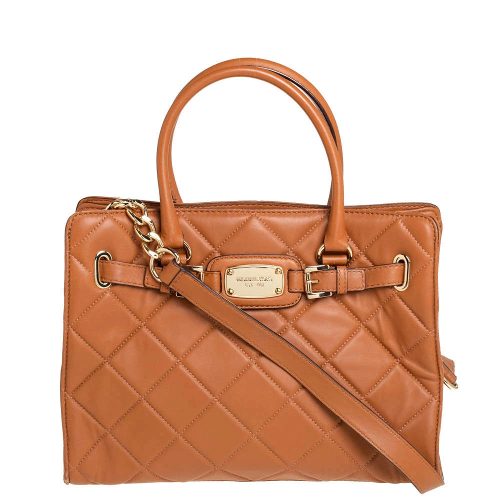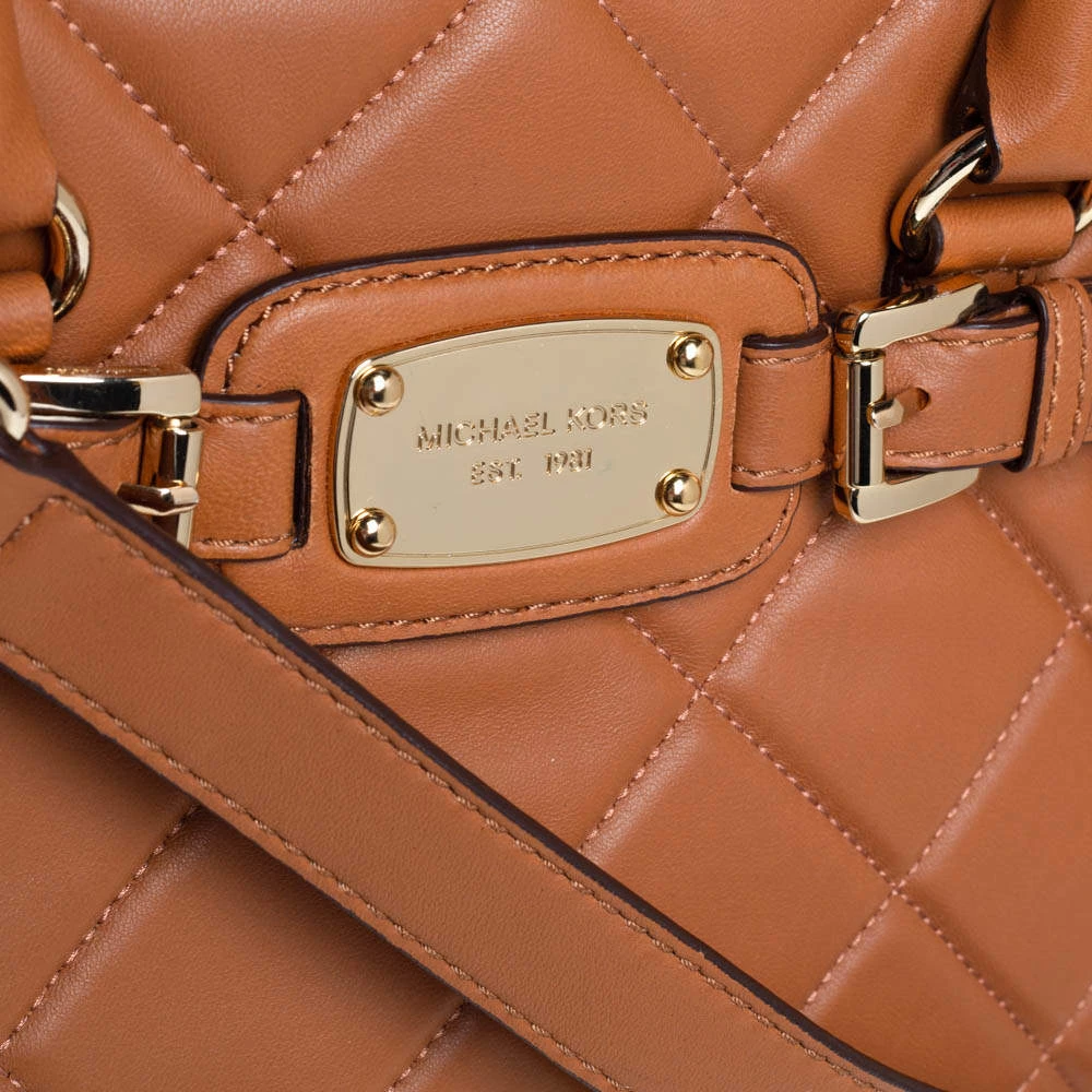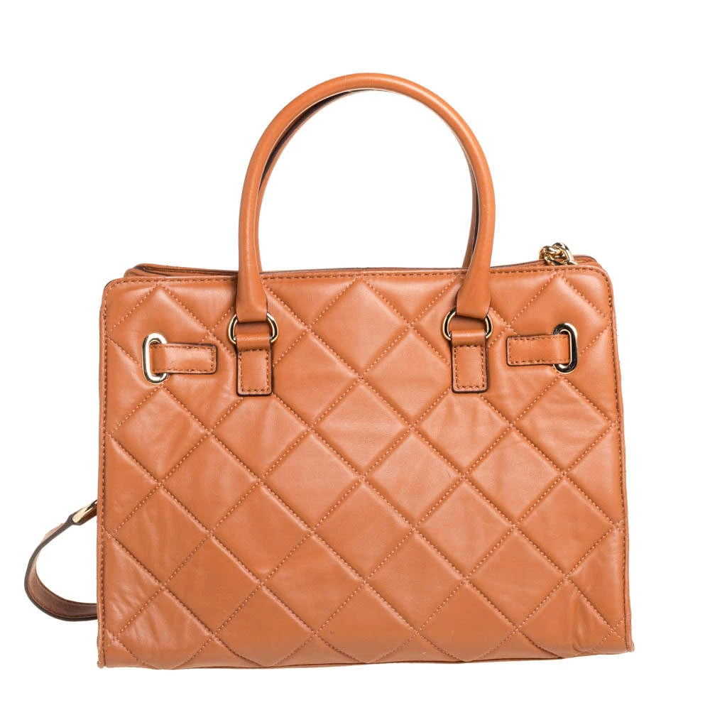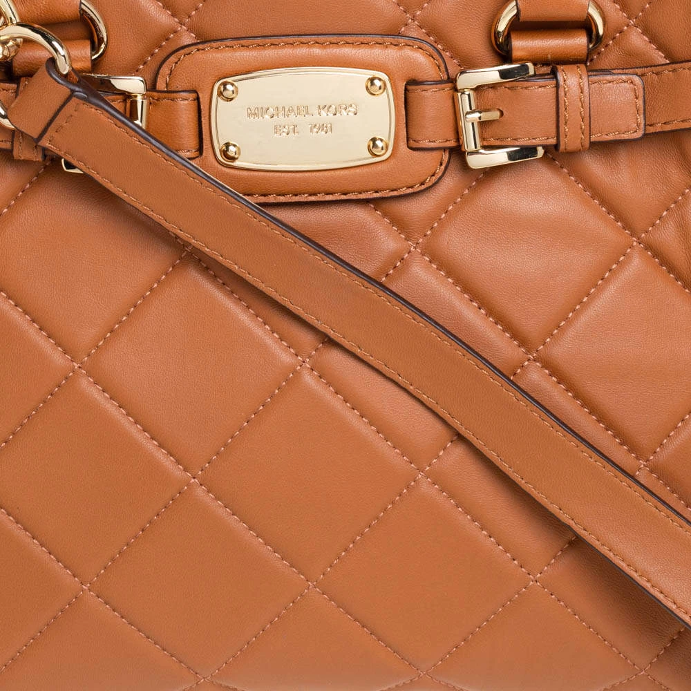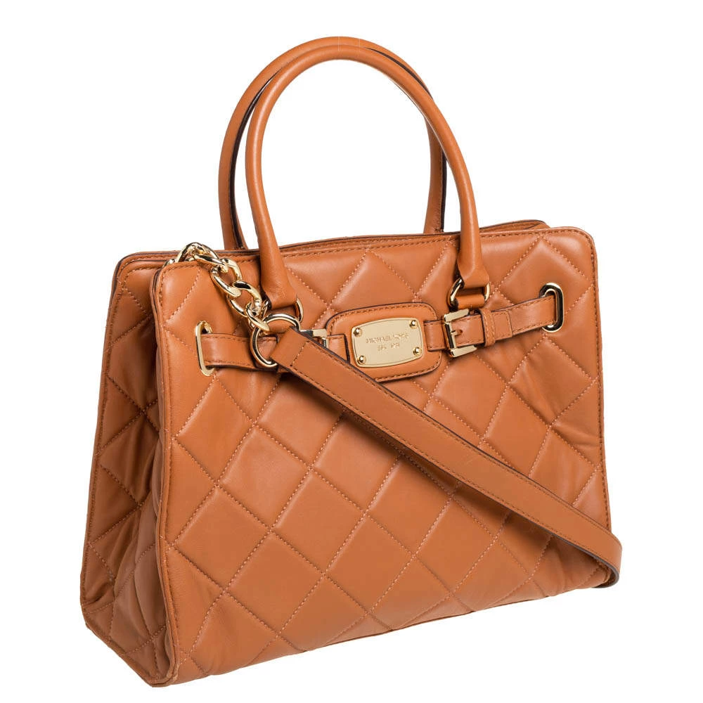 This Hamilton tote is from Michael Kors. It is crafted from tan leather and decorated with a quilt design and an engraved logo plaque on the front. The bag has two handles, a shoulder strap, and a spacious fabric & leather interior. This creation is ideal for everyday use.
