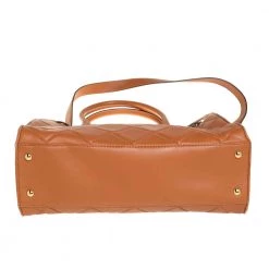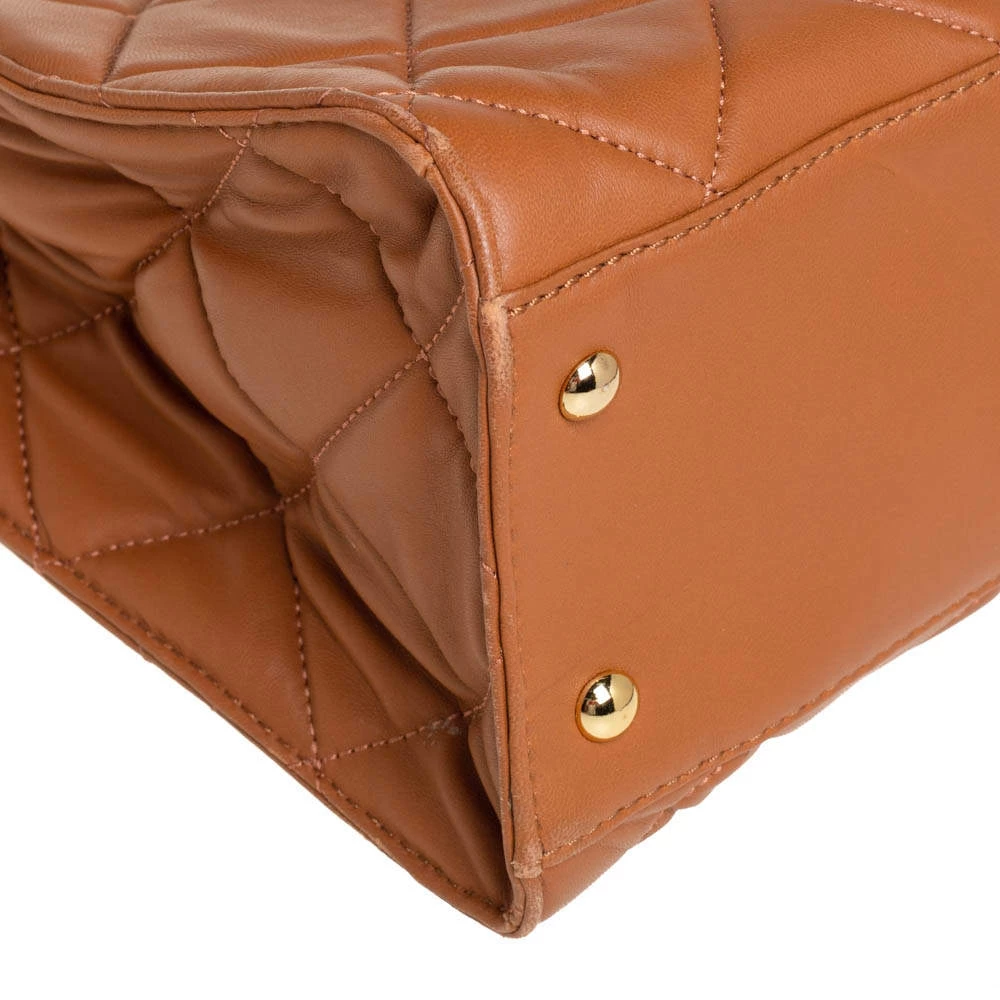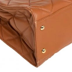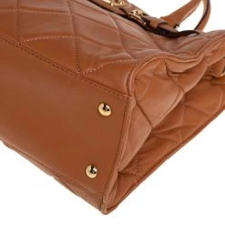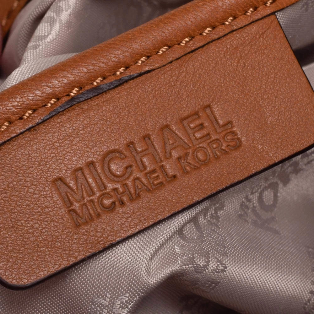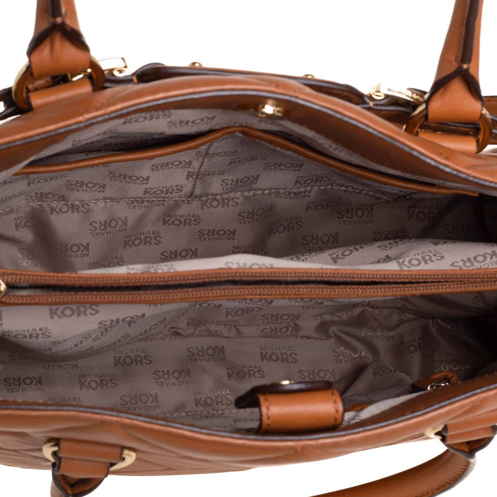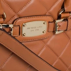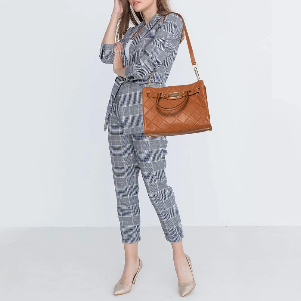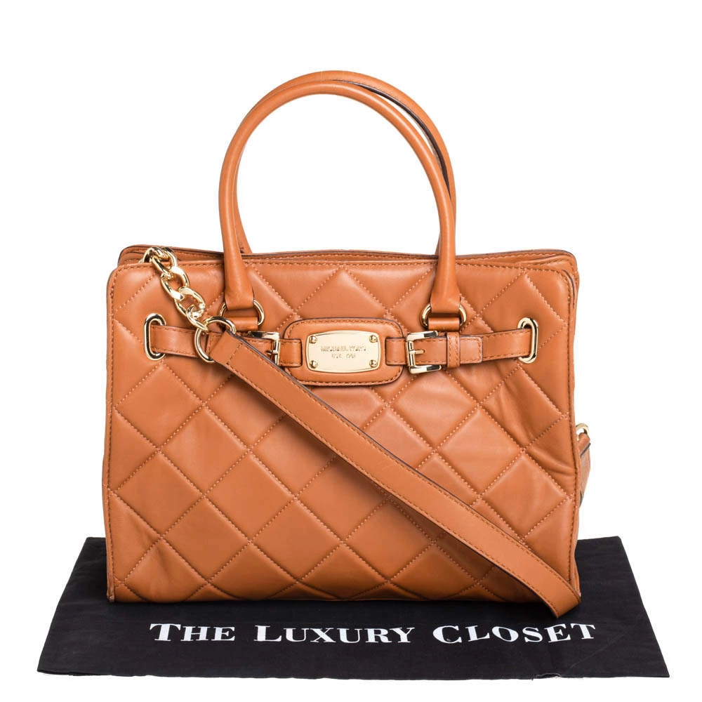 This Hamilton tote is from Michael Kors. It is crafted from tan leather and decorated with a quilt design and an engraved logo plaque on the front. The bag has two handles, a shoulder strap, and a spacious fabric & leather interior. This creation is ideal for everyday use.