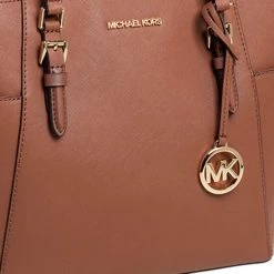 Structured, sophisticated, and stylish are some words that describe this Michael Kors tote! Crafted from leather in a tan shade, the creation is adorned with the label’s logo on the front, held by dual handles, and equipped with a well-spaced interior. Carry it to work or shopping sprees, you’ll look chic!