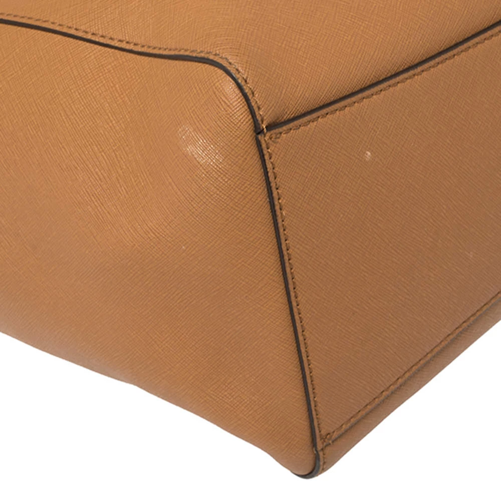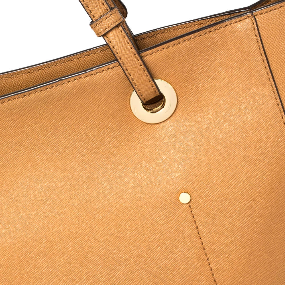 Know for their exquisite craftsmanship and timeless designs, Michael Kors bags are a must-have. Crafted from leather, this tote bag comes in a tan hue. It has been styled with dual handles, top-zip closure, and gold-tone hardware. The zip closure leads to a fabric-lined interior with a slip pocket and enough space for all your essentials.